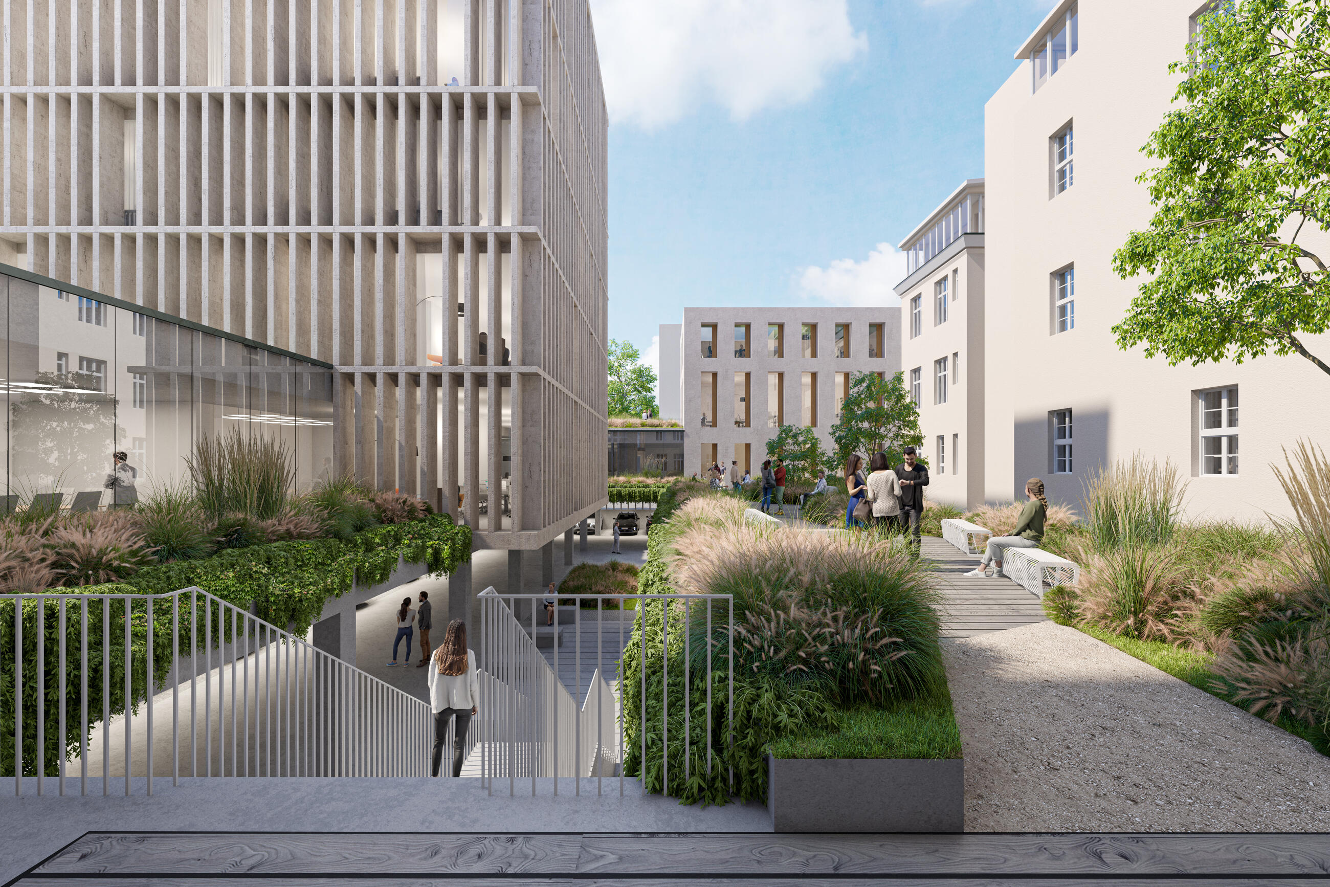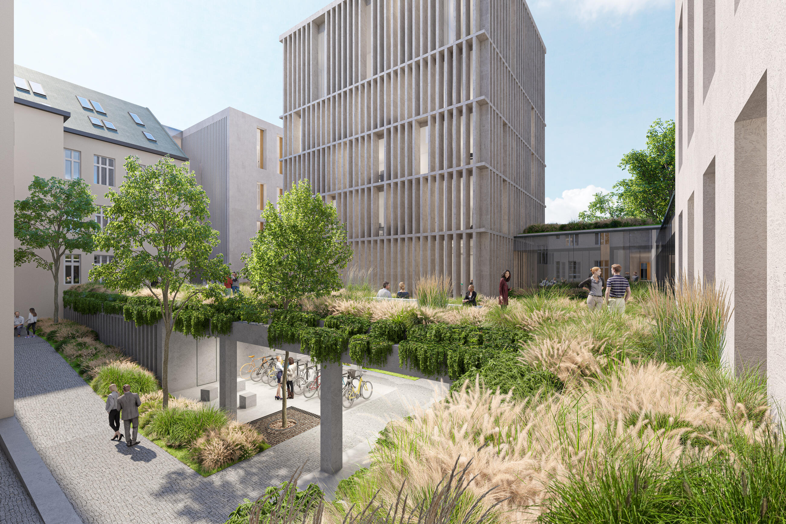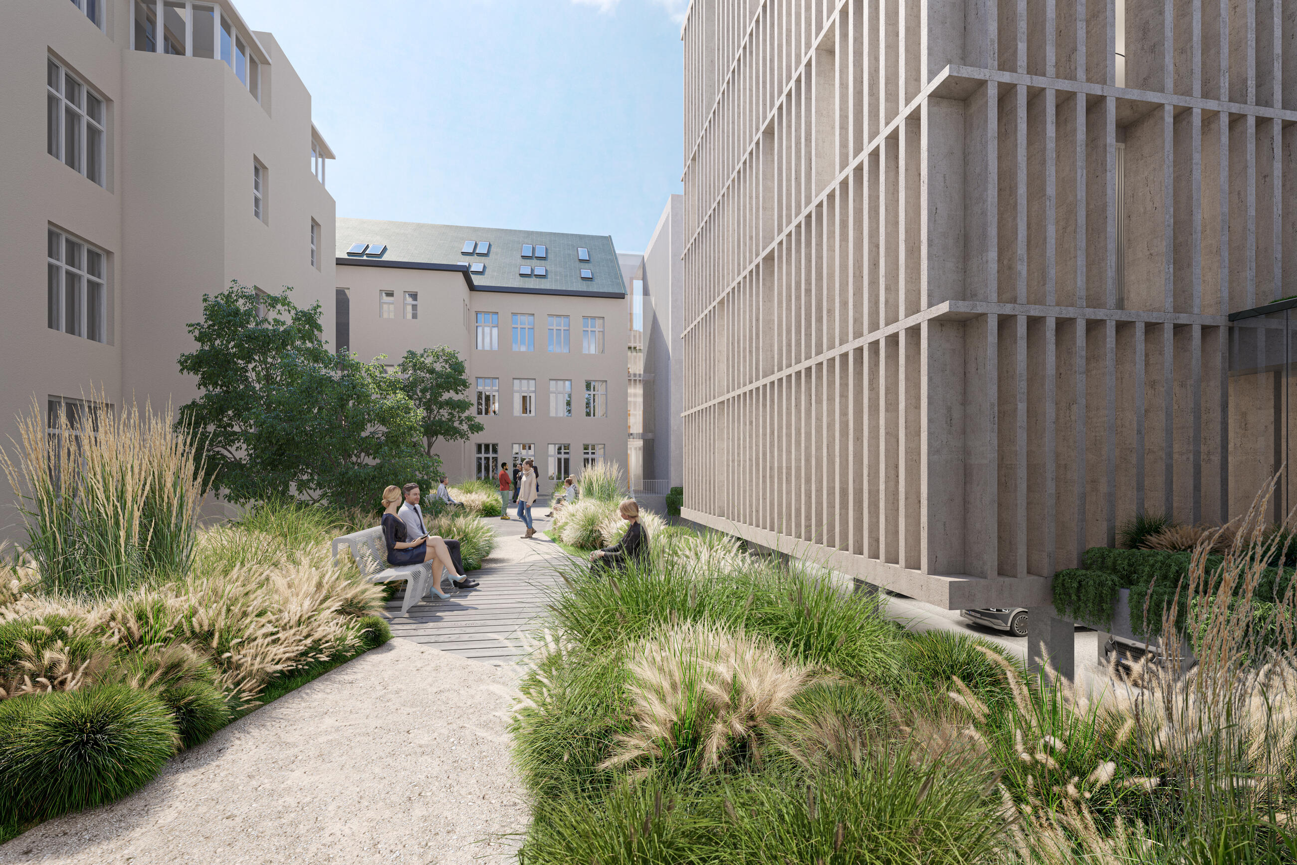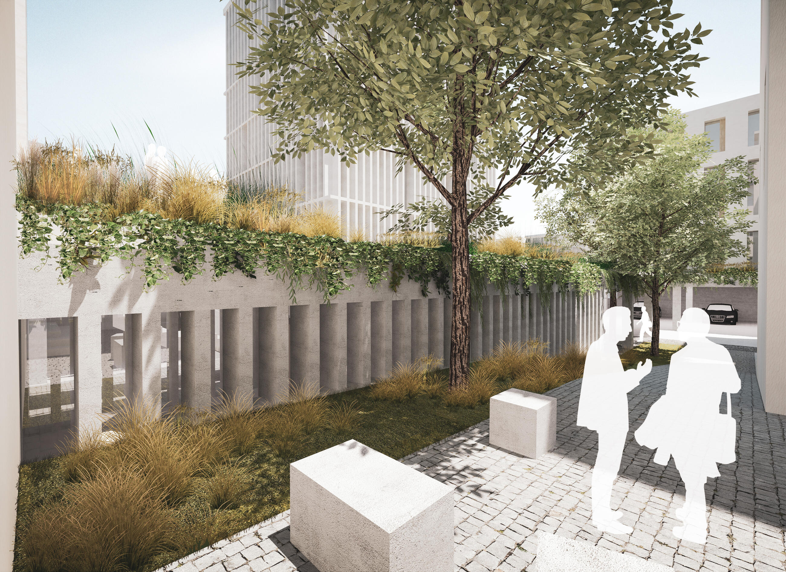 Novostavby uvnitř vnitrobloku nabízí nové možnosti pro pobyt zaměstnanců i veřejnosti. Řešení klade důraz na pobyt v kultivované, městské zeleni. Středem vnitrobloku, v jeho podélné ose navrhujeme nadzemní plato se střechou na úrovni prvního podlaží, obsahující rozšíření stávajícího archivu na úrovni prvního podzemního podlaží, vynášející terasu s bohatou zelení a pobytovými plochami. Jedná se o vyvýšený stavební objem na podporách, navazující na niveletu objektu č. 10, s pochůzími , dřevěnými, i mlatovými plochami, se zelenou, intenzivní střechou, posezením, i místy pro práci ve venkovním prostředí. Užitný parter vnitrobloku je prostorově členitý, a je nadnesen nad plochami parkovišť, na úroveň prvního podlaží desátého objektu.