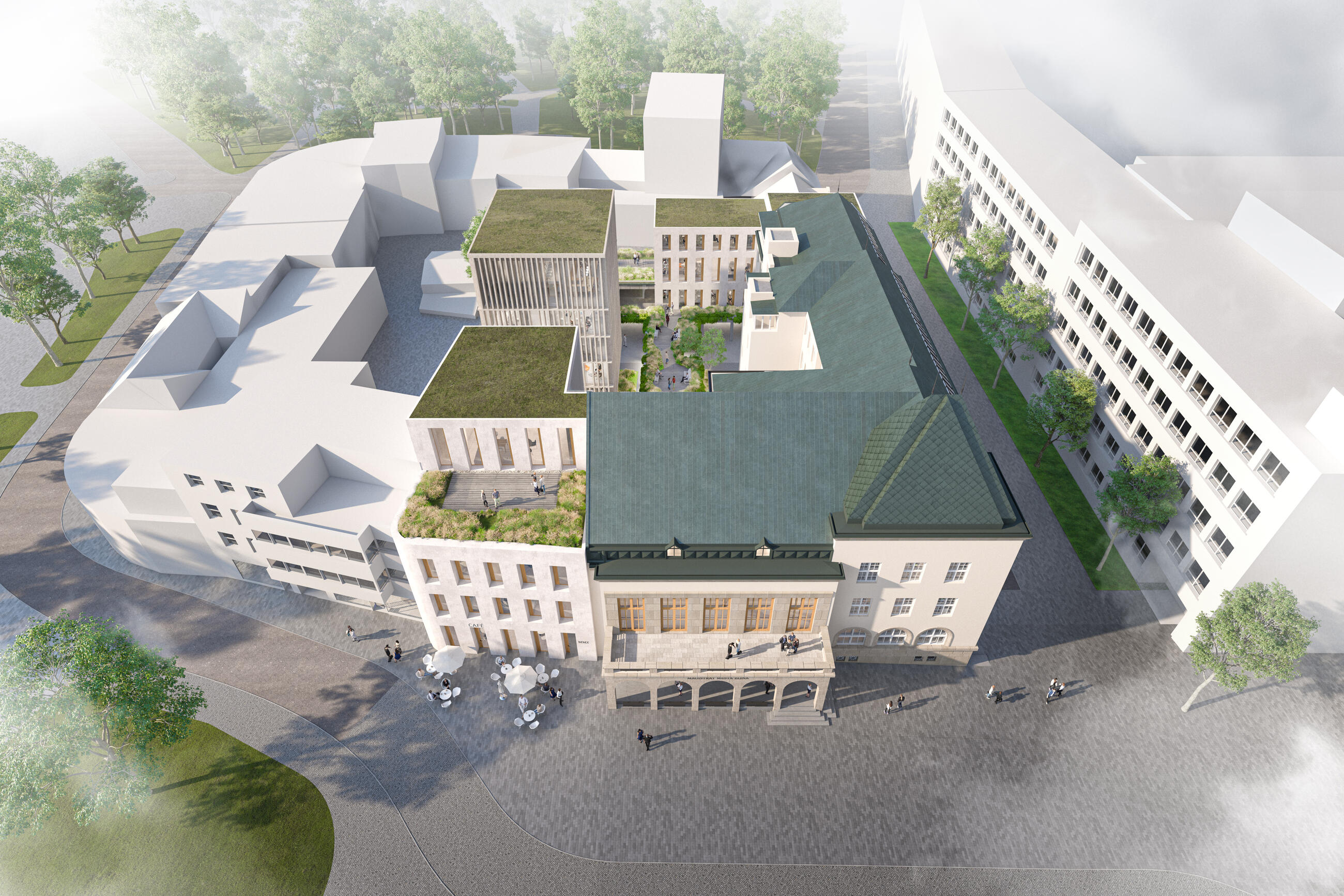 Výškové i objemové řešení nově navržených hmot, dotvářející stávající stavbu radnice, je logickým vyústěním architektonického kontextu, současně vyjadřuje stavební potenciál místa.