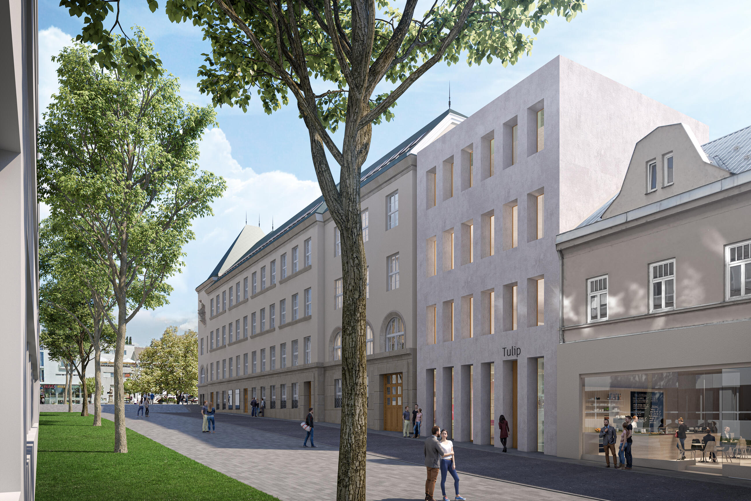 Stávající objekt č. 12 zůstává v návrhu nadále architektonickou dominantou. Nově navržené stavby na místě stávajících objektů č. 10 a 15 dotváří soubor staveb radnice do celku bez silných výrazových architektonických ambicí, jež by mohly nežádoucím způsobem oslabit hlavní roli stávající stavby radnice. Dotváří jej ale s jemností a maximálním důrazem na detail i materiálové provedení. Na obvodovém plášti nových staveb uliční i vnitřní fasády uplatňujeme princip hlubokého rastru, na vnitřním líci plného zdiva vsazených, okenních dubových rámů. Plasticitu i měkkost fasád vyzdvihují, spolu s prefabrikovanými betonovými venkovními parapety, ručně broušené, ve hmotě probarvené světlé omítky. Omítanými povrchy nové fasády odlehčujeme, materiálově nezdůrazňujeme, abychom ponechali vyznít stávající Gahurovu stavbu, kde se bohatě objevují pískovcové obklady s jemnými architektonickými dekory. Navrhujeme racionální okenní rámy skryté dřevěné dubové, uložené na vnitřním líci zdiva.