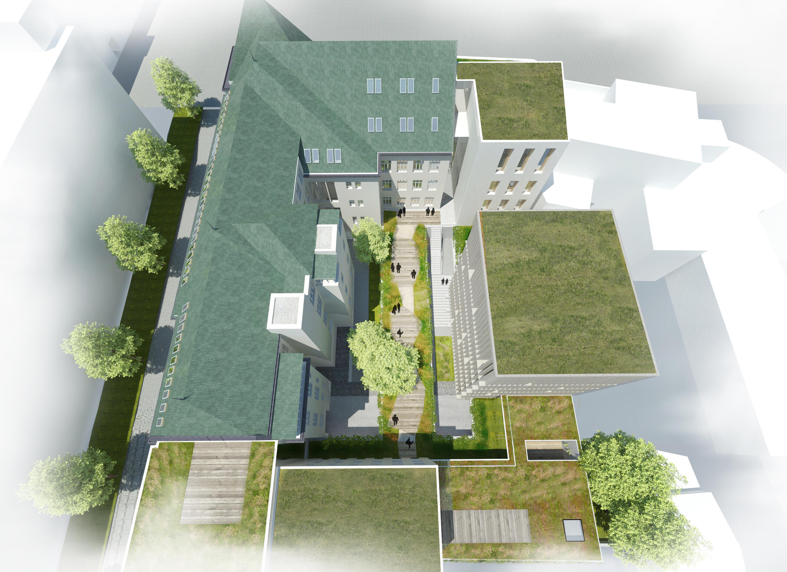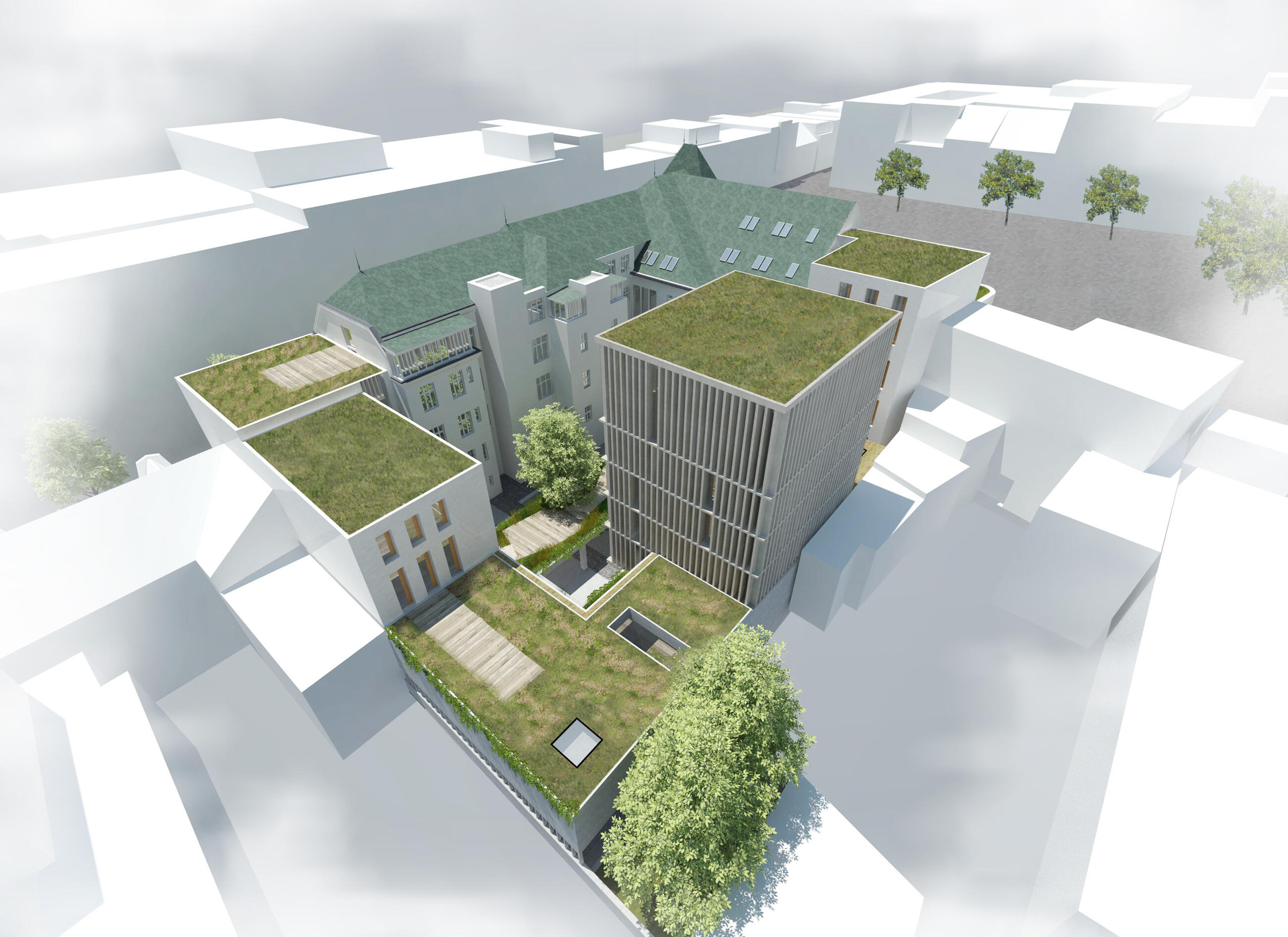 Dostavby ve vnitrobloku jsou výsledkem snahy o jasné, funkční uspořádání budoucího celku, respektu k původní budově a cíle získat zásadně novou atmosféru pracovního prostředí. Při návrhu dostaveb uvnitř bloku jsme si byli vědomi členitosti a nesourodosti stávající stavební substance, charakteristické pro většinu podobných městských vnitrobloků, kde uvnitř, mezi obvodovými uličními stavbami, se nachází méně významné stavby, vznikající postupně, často bez koncepce, jen s užitkovými zájmy. Navržený koncept dostavby s tímto vědomím pracuje a záměrně nevytváří souvislou, blok uzavírající, objemovou stavební strukturu. Nové objemy stávající blok ponechávají děravý s průhledy ven i dovnitř radničního bloku. Zachováváme výškovou členitost stavby i možnost podobného přístupu pro sousední parcely.