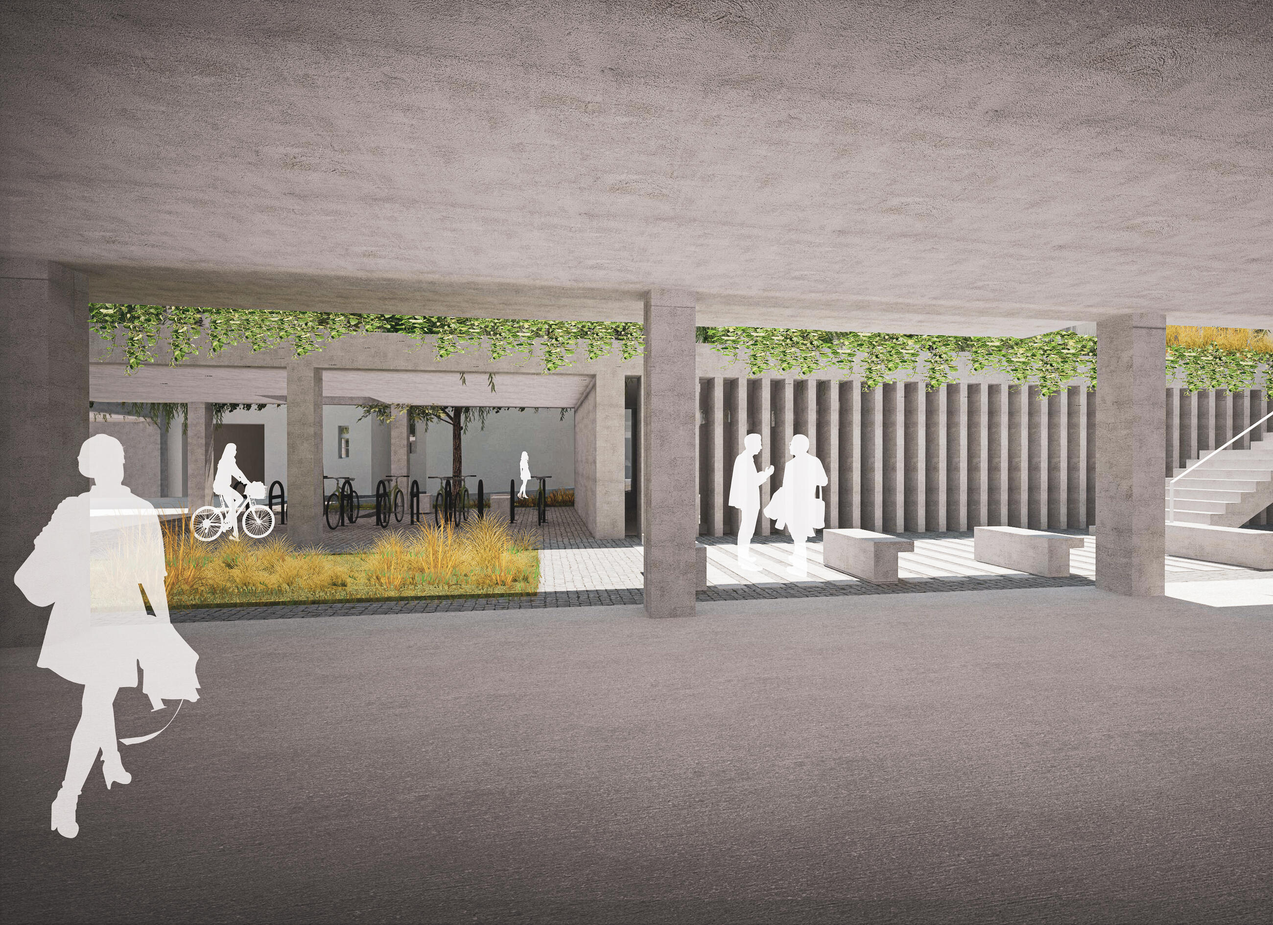 Stavby č. 10 a č. 15 jsou svými niveletami posunuty zhruba o podlaží. Vnitroblokové stavby jsou osazeny svým prvním podlažím na úrovni objektu č. 12, takže v kontaktu s vnitřní štítovou stěnou objektu č. 10 jsou na úrovni suterénu. Značnou plochu suterénu zaujímají krytá, ale otevřená parkování, kde je navržen pohodlný přístup do hlavního vertikálního uzlu v objektu č. 10. Kapacita parkingu odpovídá požadavku zadání. Ve středové pozici vnitrobloku je navržen převážně nadzemní objekt rozšířeného archivu s pochůzí pobytovou střechou, dispozičně navazující na stávající archiv v suterénu objektu č. 12. Jedná se o železobetonovou konstrukci vynášející bohatou intenzivní zeleň s pobytovými plochami pro práci i odpočinek.