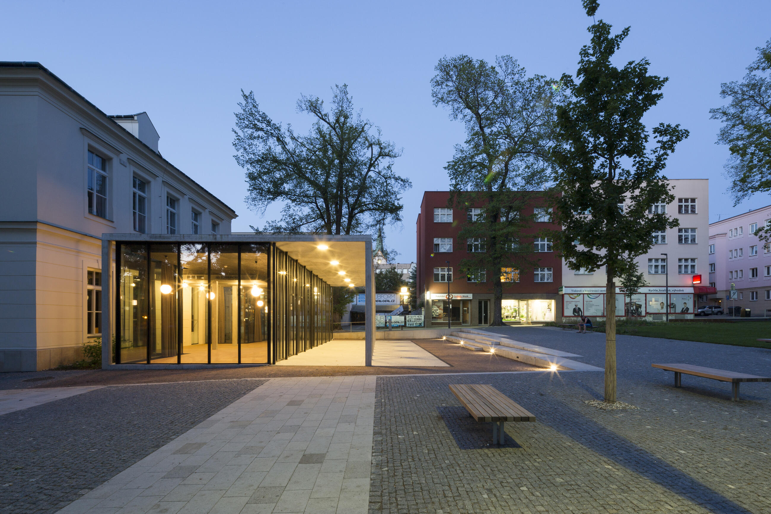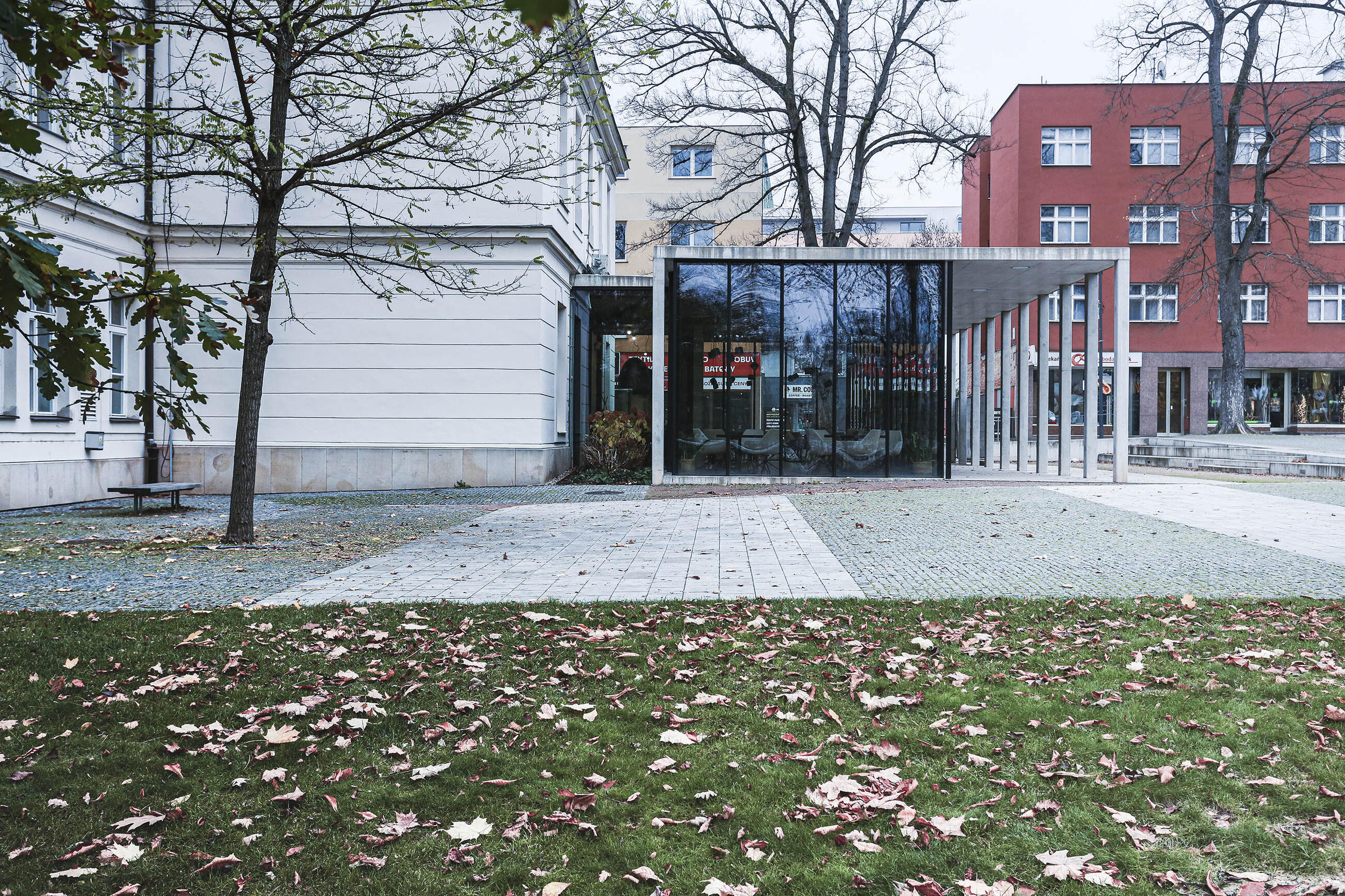 Odbytové prostory kavárny budou umístěny v nové, prosklené dostavbě a ve stávající budově knihovny. Vstup hostů bude centrálním nástupem z podloubí, ze strany Komenského parku. Zásobování prostor kavárny bude stávajícími dveřmi, z boční strany, z ulice Školní, kde jsou v blízkosti umístěny podzemní kontejnery odpadu. Zázemí zaměstnanců bude umístěno napravo při ulici Školní v místnostech stávajícího WC. Stávající technické zázemí při straně v parku zůstane zachováno. Pro veřejnost bude využito stávající WC se vstupem z chodby ode dvora. Stávající prostory v objektu knihovny při ulici Školní bude tak možno nově využít pro jiné /další potřeby.