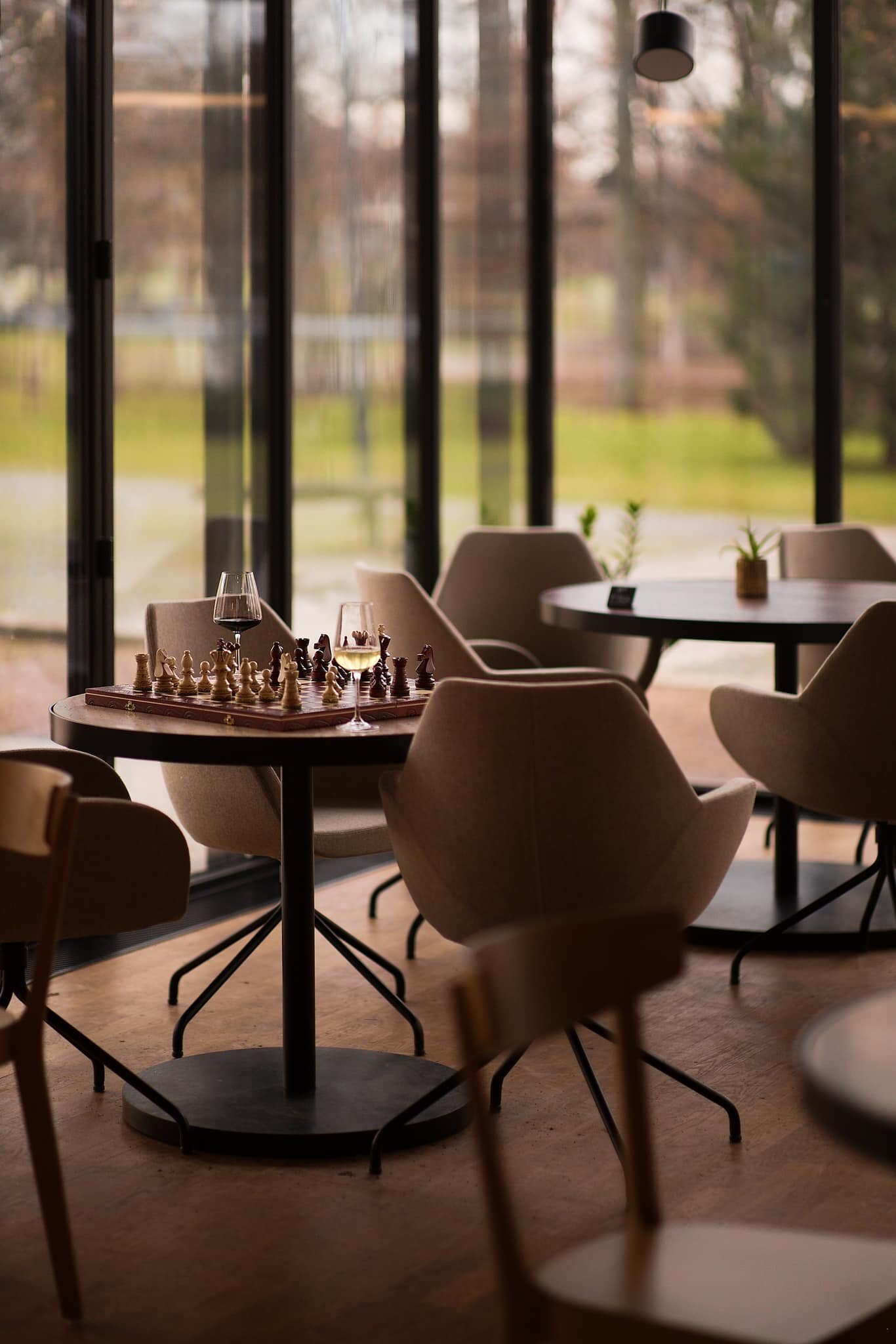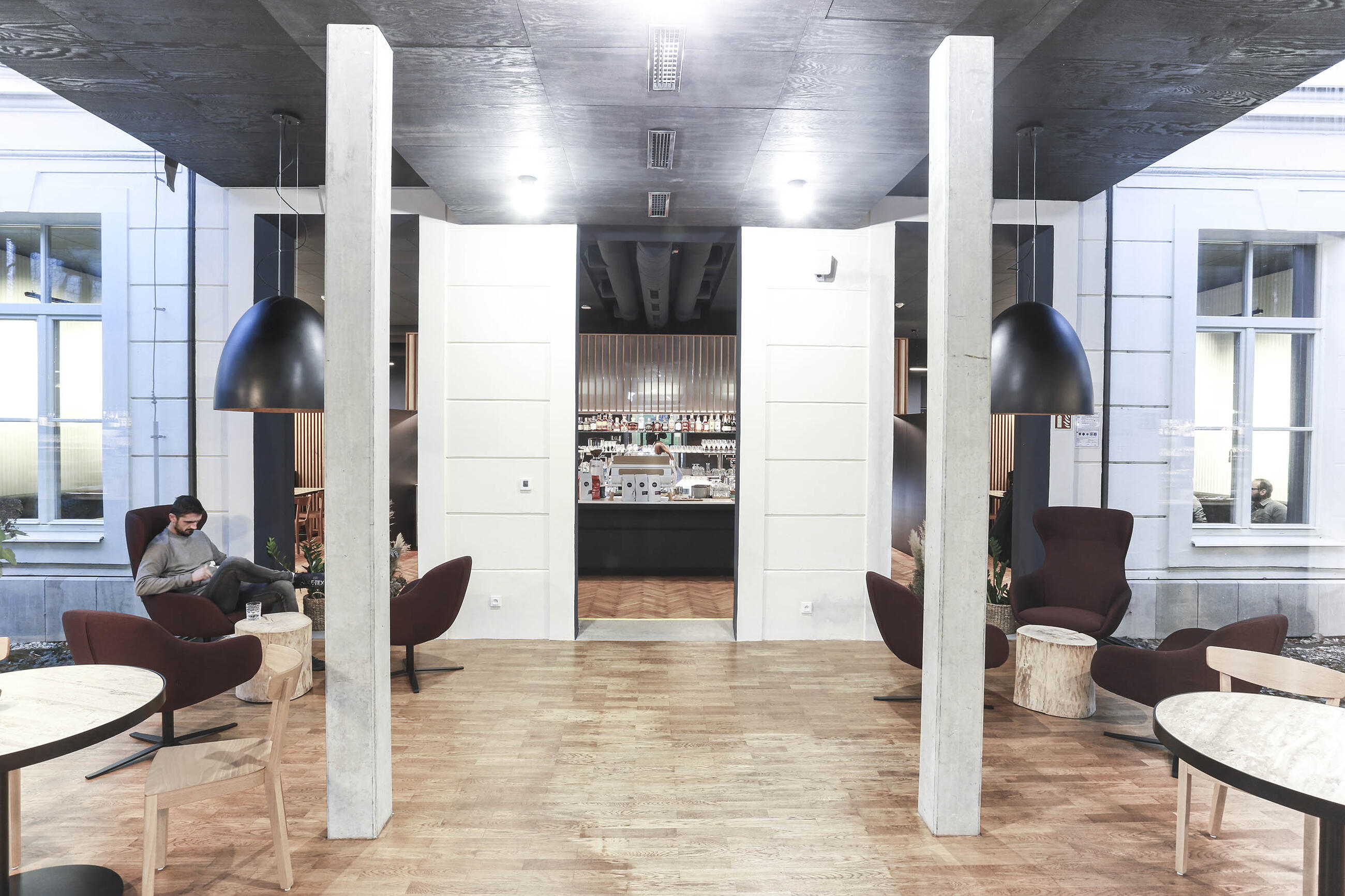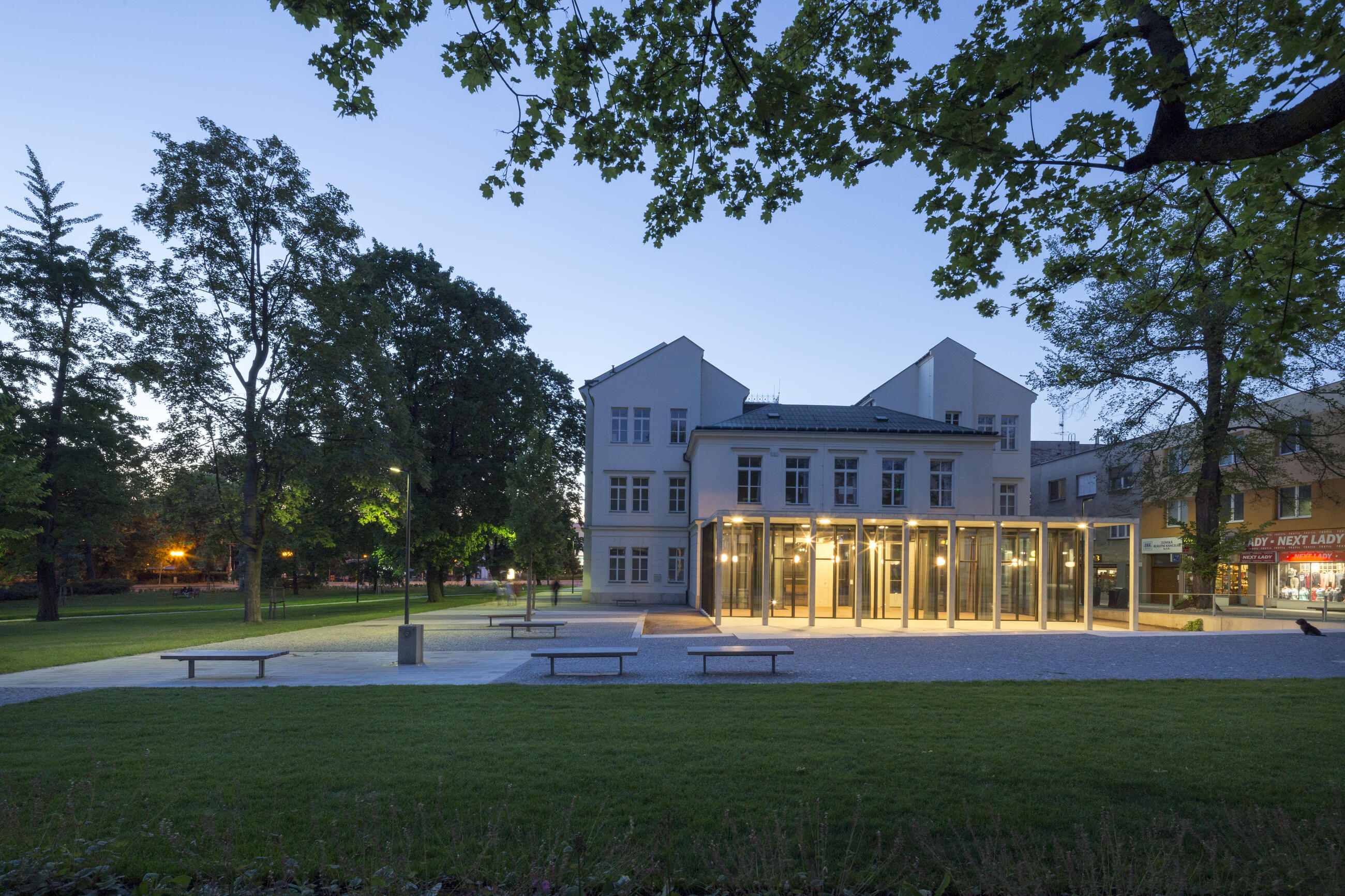 Mobiliář uvnitř přístavby bude světlý. Přístavba tak bude navozovat dojem vzdušnosti a lehkosti pavilónového řešení. Sezení kolem kruhových stolků bude světlé, v odstínech bílé. K posezení poslouží lehké dřevěné židle, případně polokřesílka. Stolky s centrální podnoží budou mít kamenné desky. V zúženém prostoru přístavby, v těsném sousedství stávající stavby jsou umístěny dva kruhové stoly s nízko spuštěnými cylindrickými světly a pohodlnými křesly ve výjimečných materiálech. Kavárenské posezení v křeslech v zúženém prostoru přístavby bude posíleno novou výsadbou zeleně mezi hmotou přístavby a původní hmotou objektu. Světla zde budou spuštěná - oblé, bílé reflektory, s přiznanými průvěsy kabelů, záměrně nedefinující pozici stolového uspořádání.