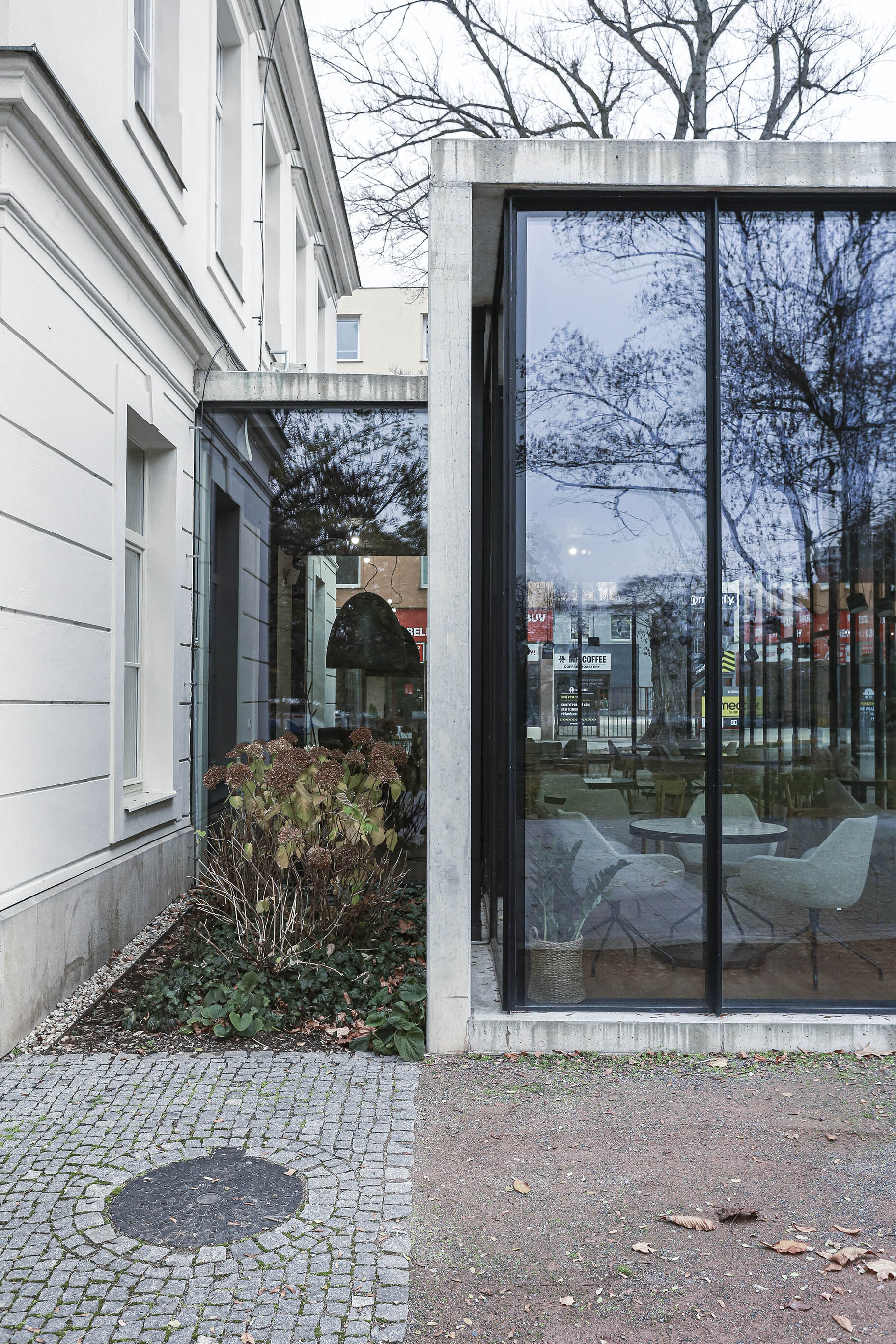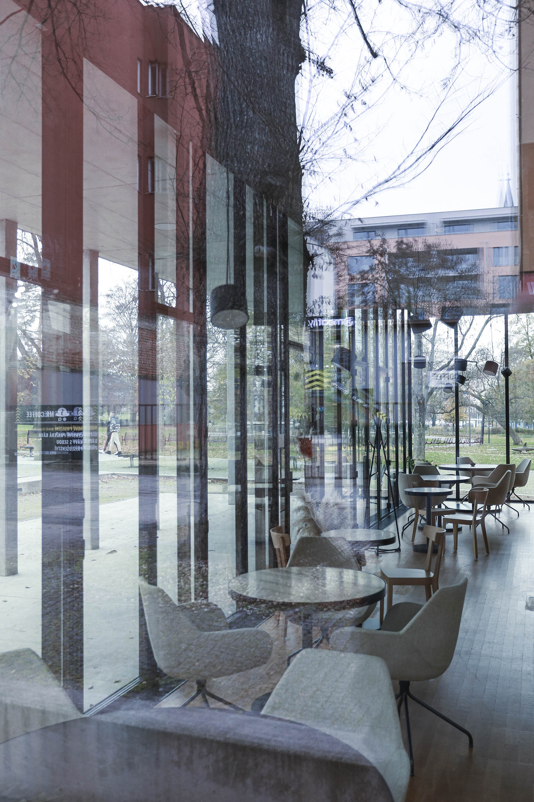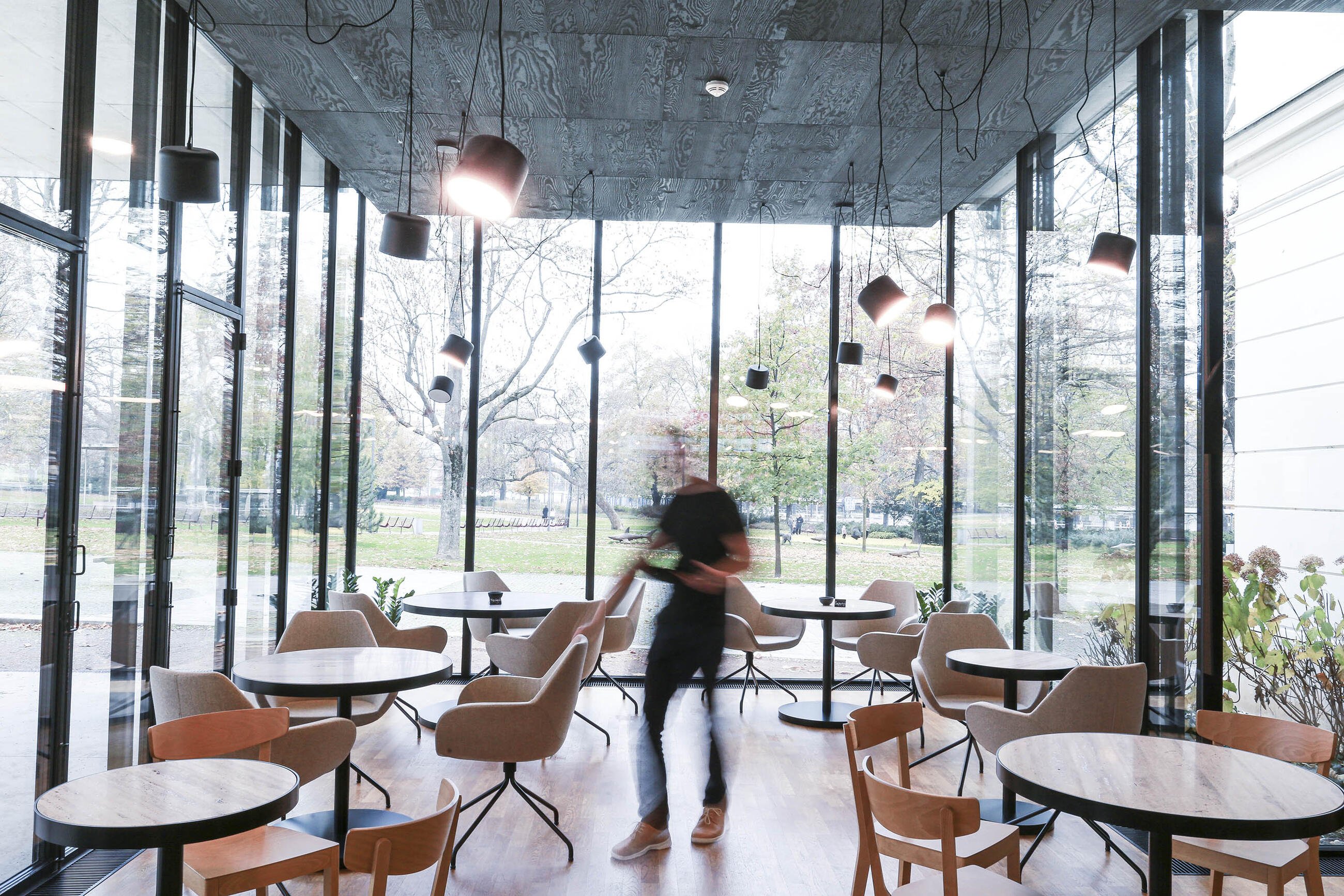 Prostor kavárny bude nabízet dva odlišné zážitky. V přední, ocelové a prosklené části bude volná dispozice klasického kavárenského uspořádání nabízející výhledy do parku a do ulice Školní. Vše uvnitř prosklené přístavby bude součástí kontaktu s venkovní atmosférou okolí.