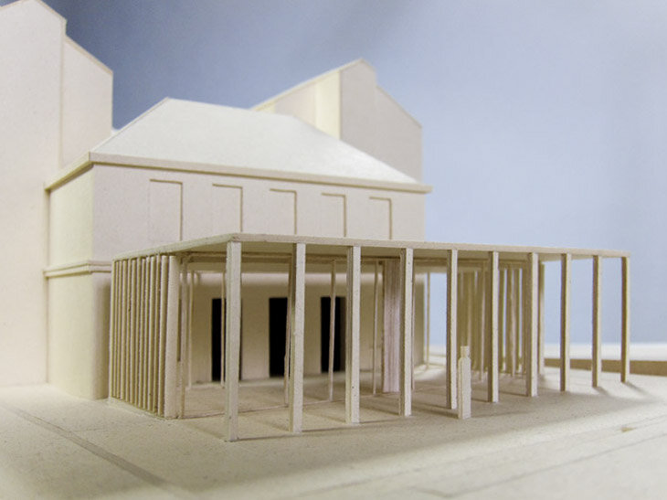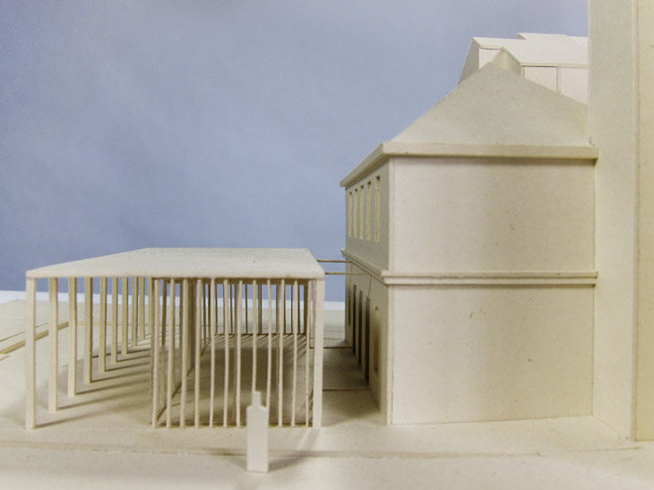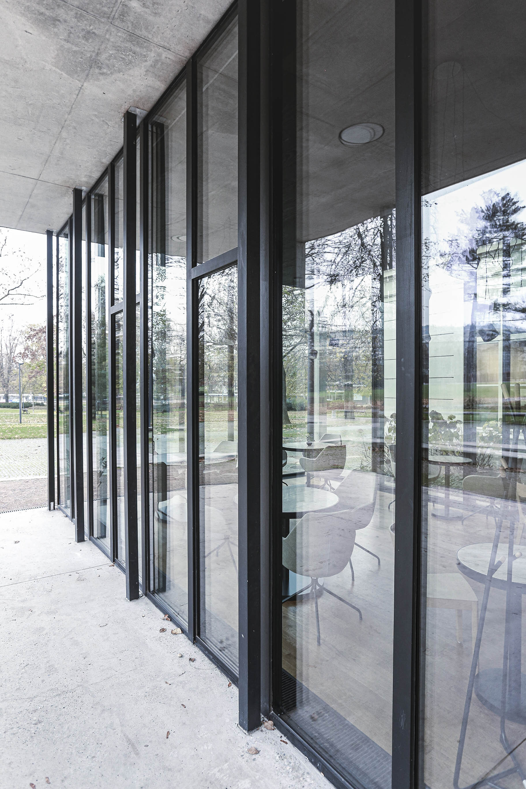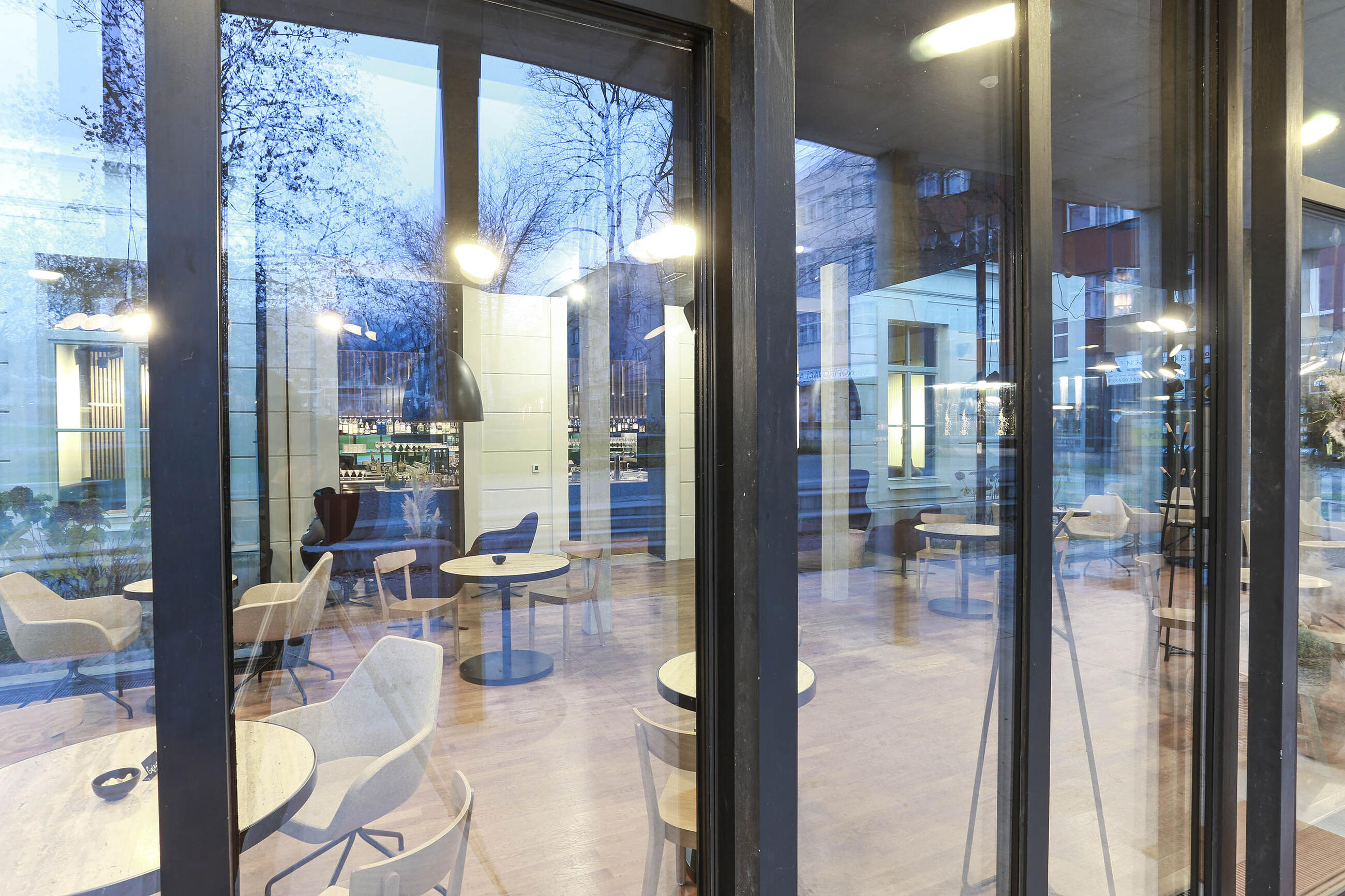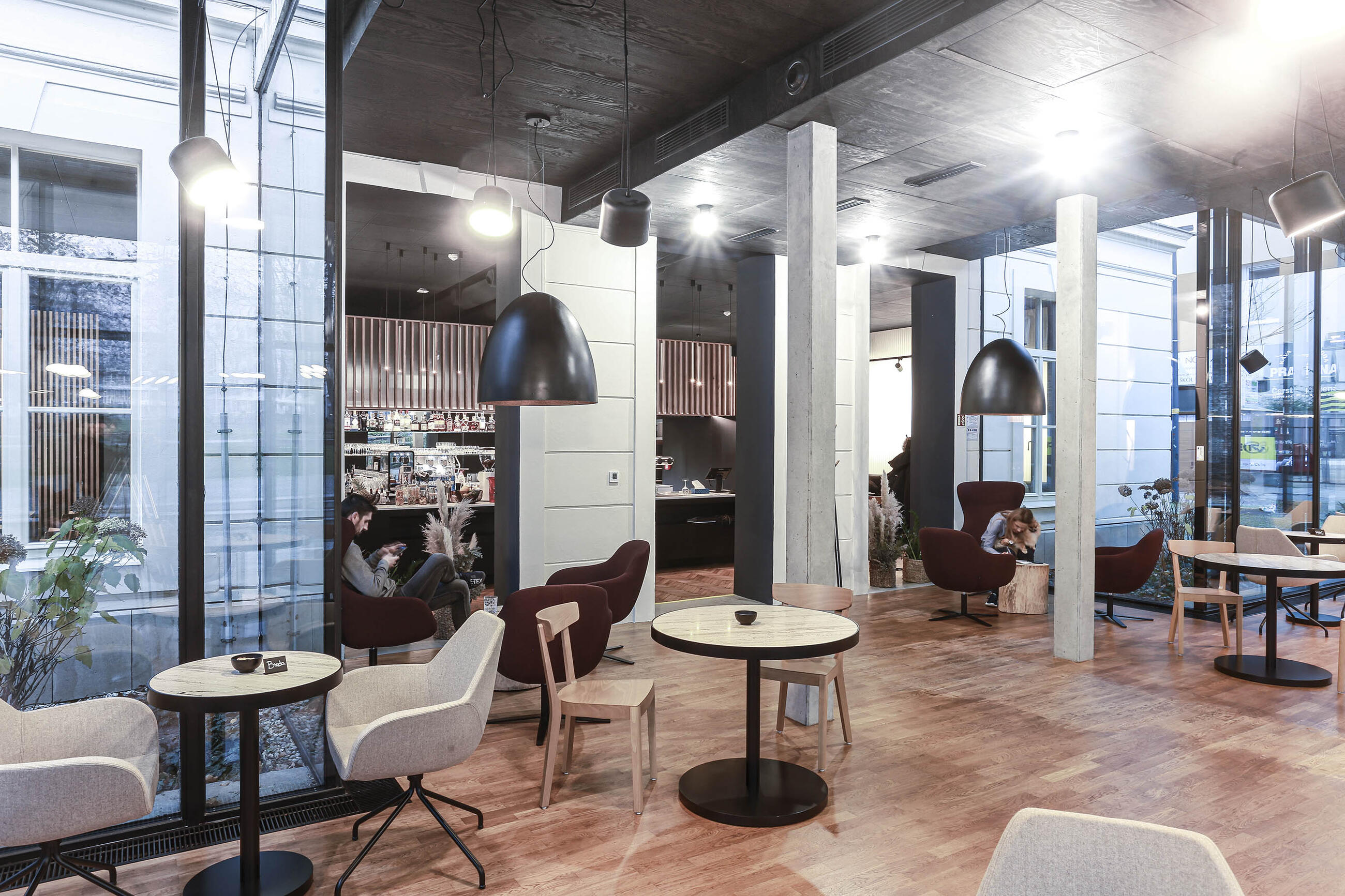Prostor kavárny bude nabízet dva odlišné zážitky. V přední, ocelové a prosklené části bude volná dispozice klasického kavárenského uspořádání nabízející výhledy do parku a do ulice Školní. Vše uvnitř prosklené přístavby bude součástí kontaktu s venkovní atmosférou okolí.
