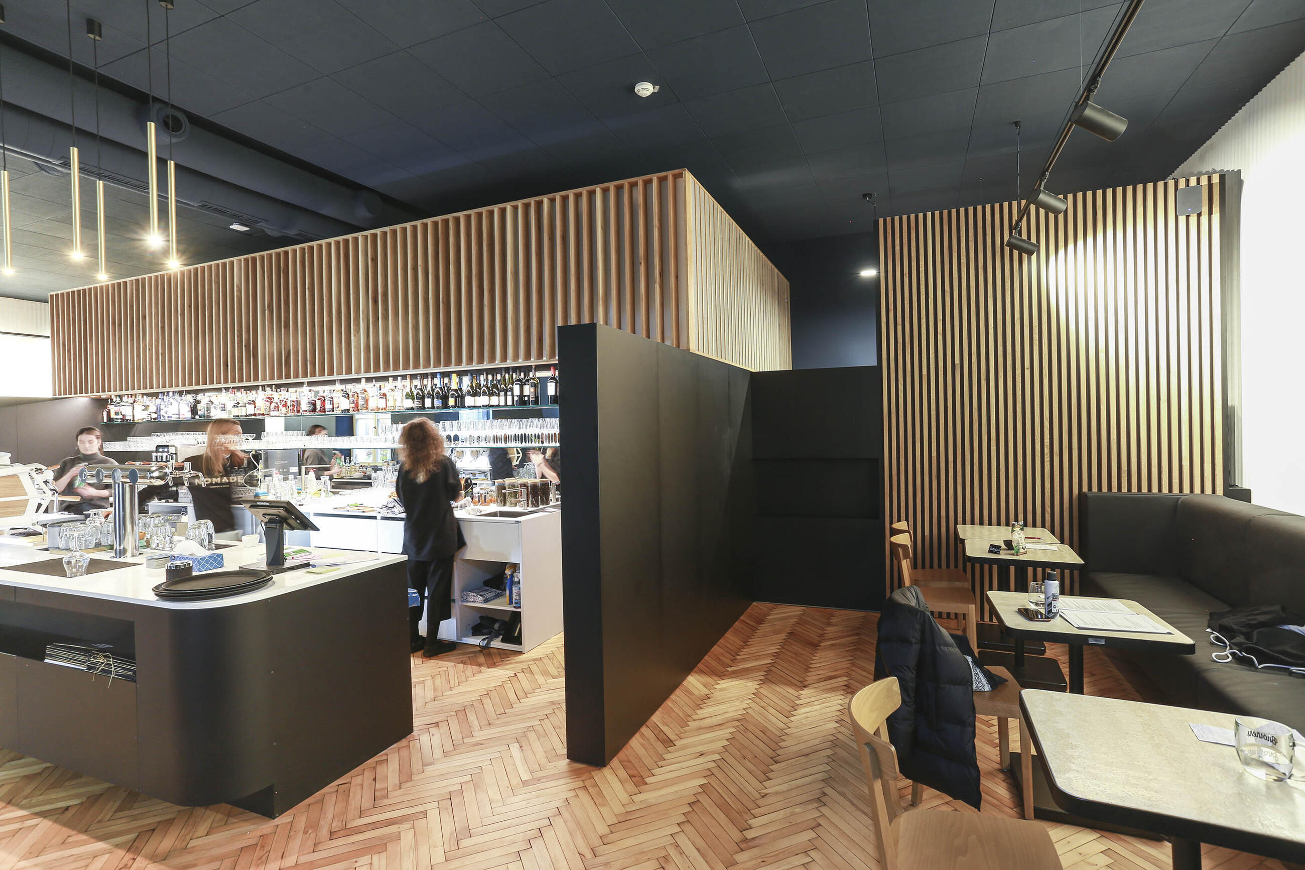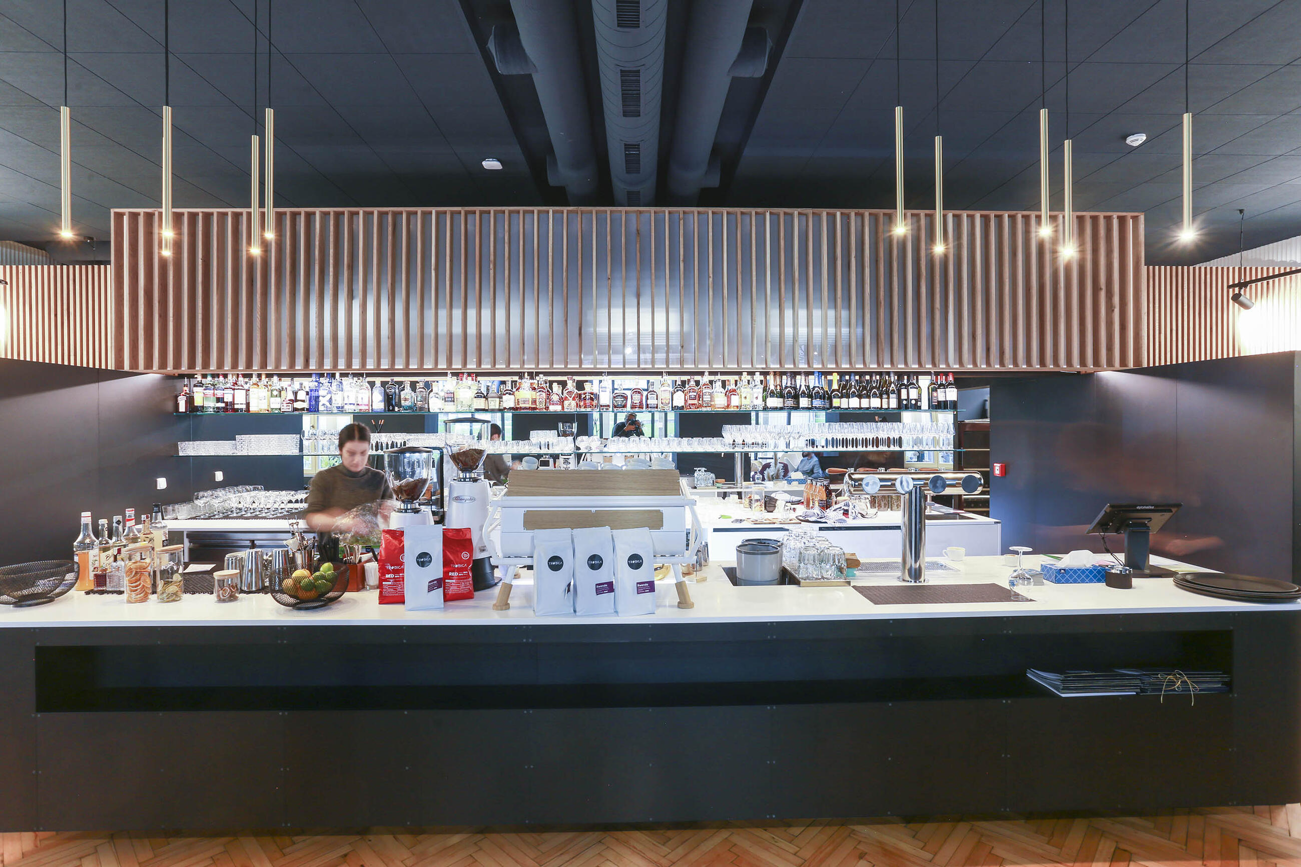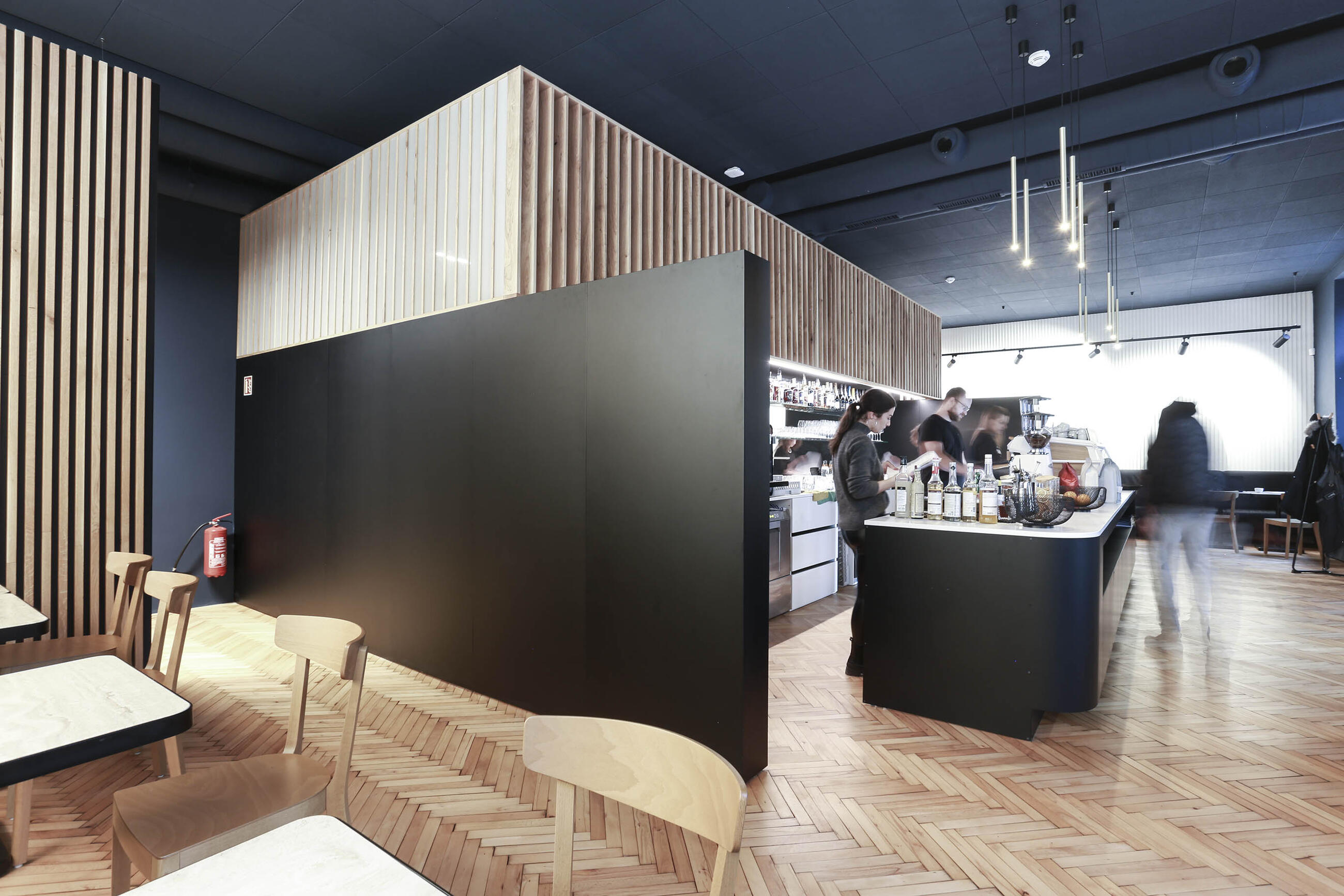 Dál do hloubky dispozice (tj. stávajícího objektu) bude atmosféra více intimní, s odlišným uspořádáním i osvětlením, se sezením v lavicích se stolky pro dva. Úprava stěn a stropu zde bude víceméně tmavá, až černá. Jedná se o výmalby, případně mírně reliéfní povrchy stěn. Rozhraní, mezi černým a světlým bude na hraně ostění stávající stavby. Lavice budou ve světlé kůži, stolky s dřevěnými deskami a ocelovou, černou podnoží. V centrální pozici je obslužný pult, po jehož stranách jsou lavice přisazeny k obvodové stěně. Pult je kompaktní, hladký, intaktní objem, pravděpodobně z korianu, nebo kamene. Zde by měly být vystaveny rozmanité produkty / sladké, slané a pod /, pivní a limo pípa + pokladna. V zápultí budou ostatní technologické prvky a kávovar, s nabídkou ostatních nápojů. V zázemí, za pultem je vestavba přípravny s nutnými sklady.