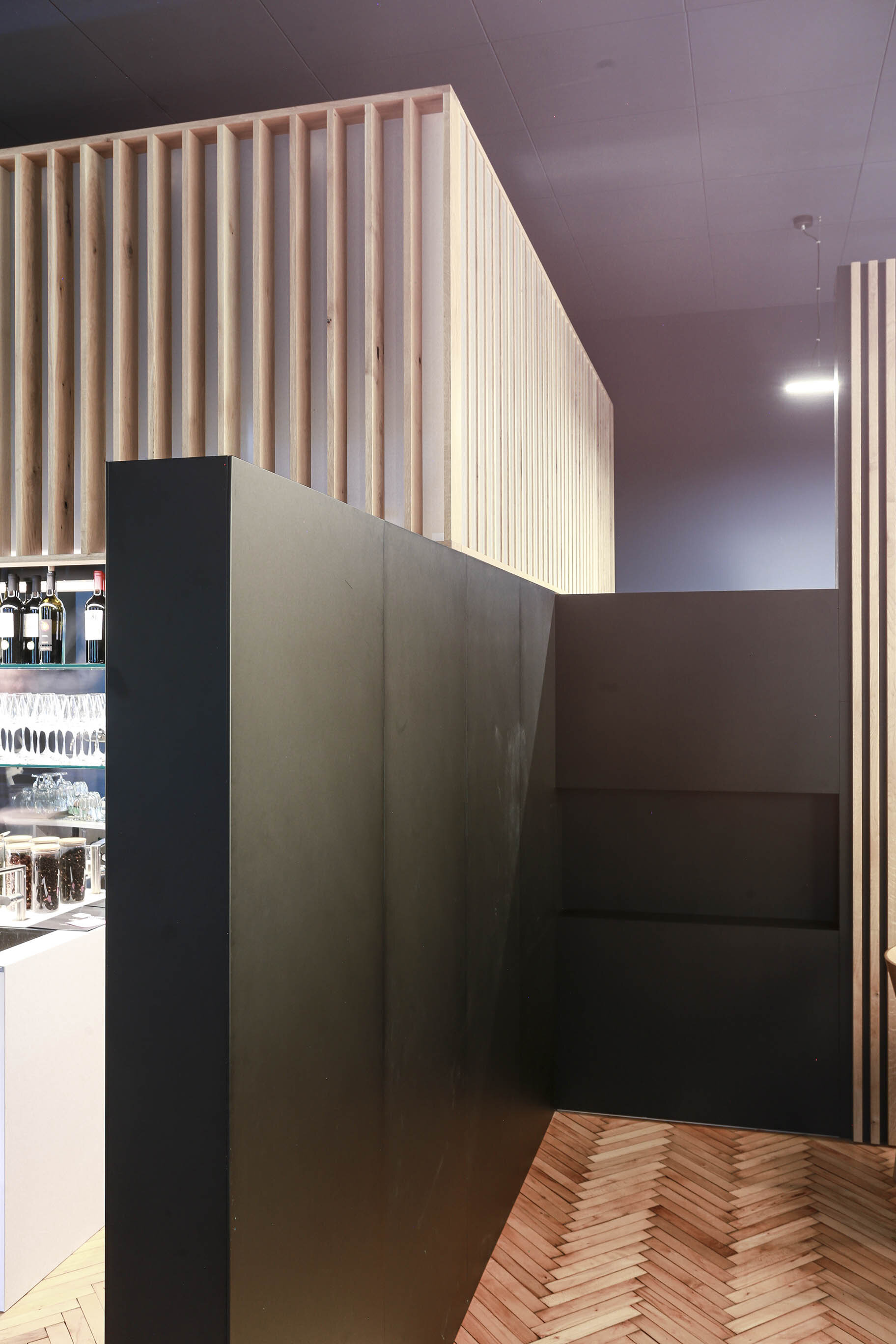 Po stranách prostory k sezení uzavírají dva paravany. Cílem je to, aby všechny nové, vestavěné konstrukce nezaplnili stávající prostor. Naopak aby působili aditivně, jako dočasné stavební zásahy, jinými slovy, aby mnoho neukrajovaly z plochy stropů.
