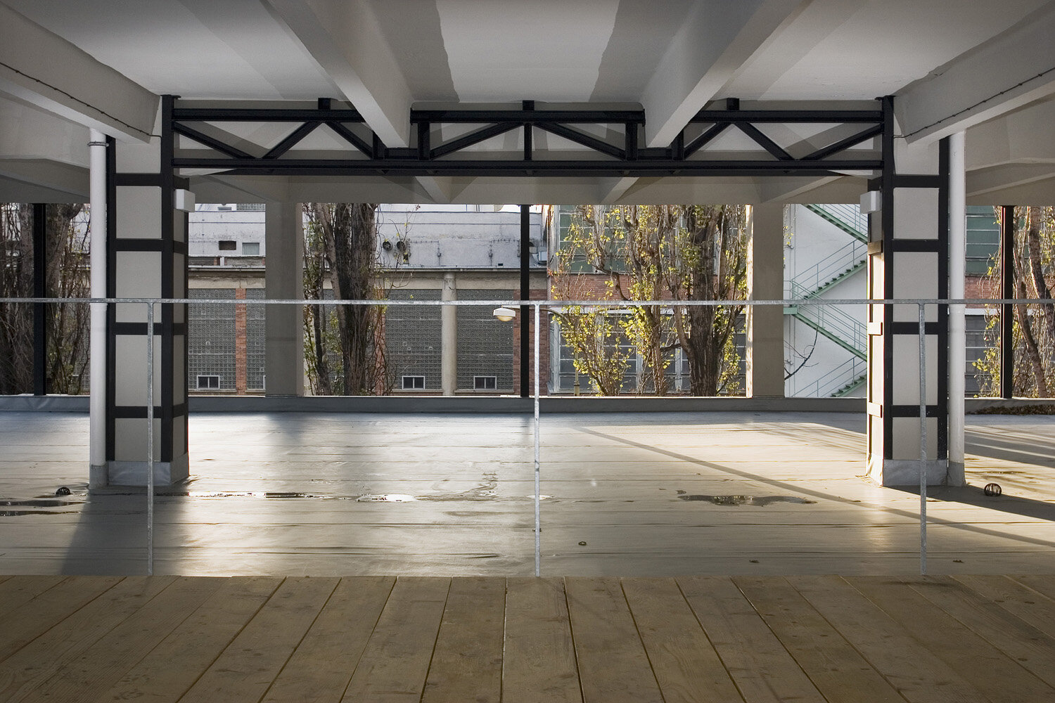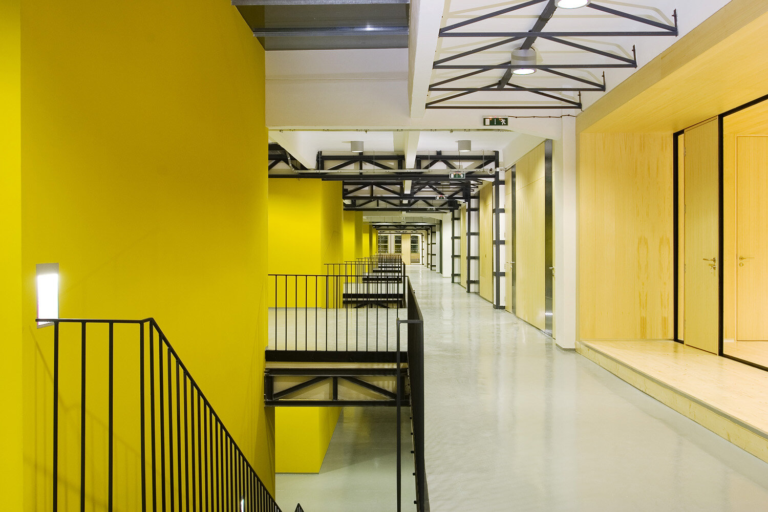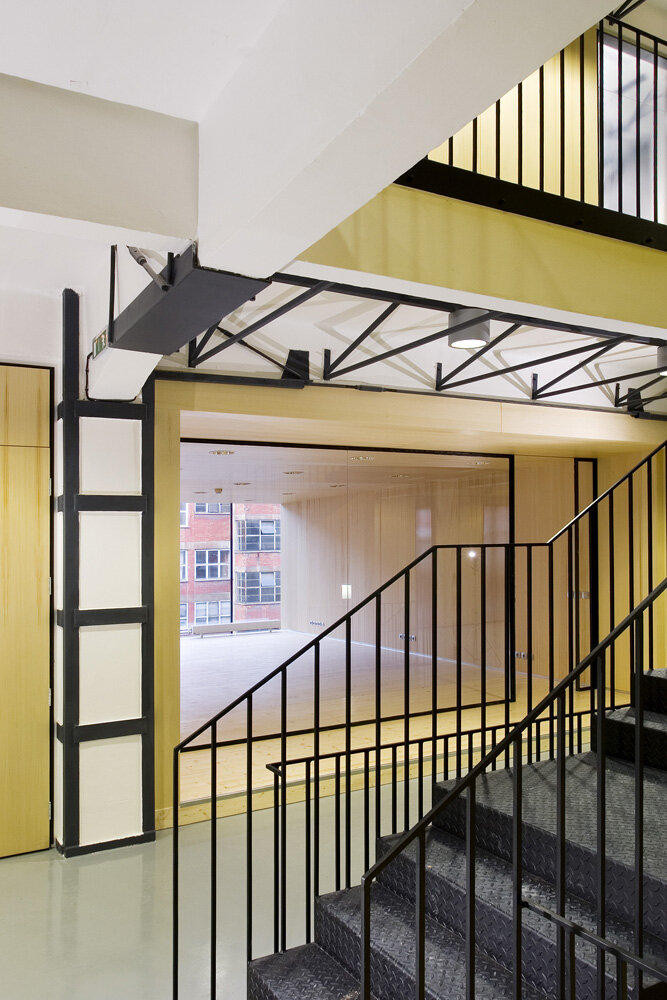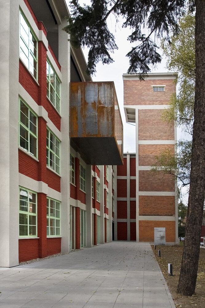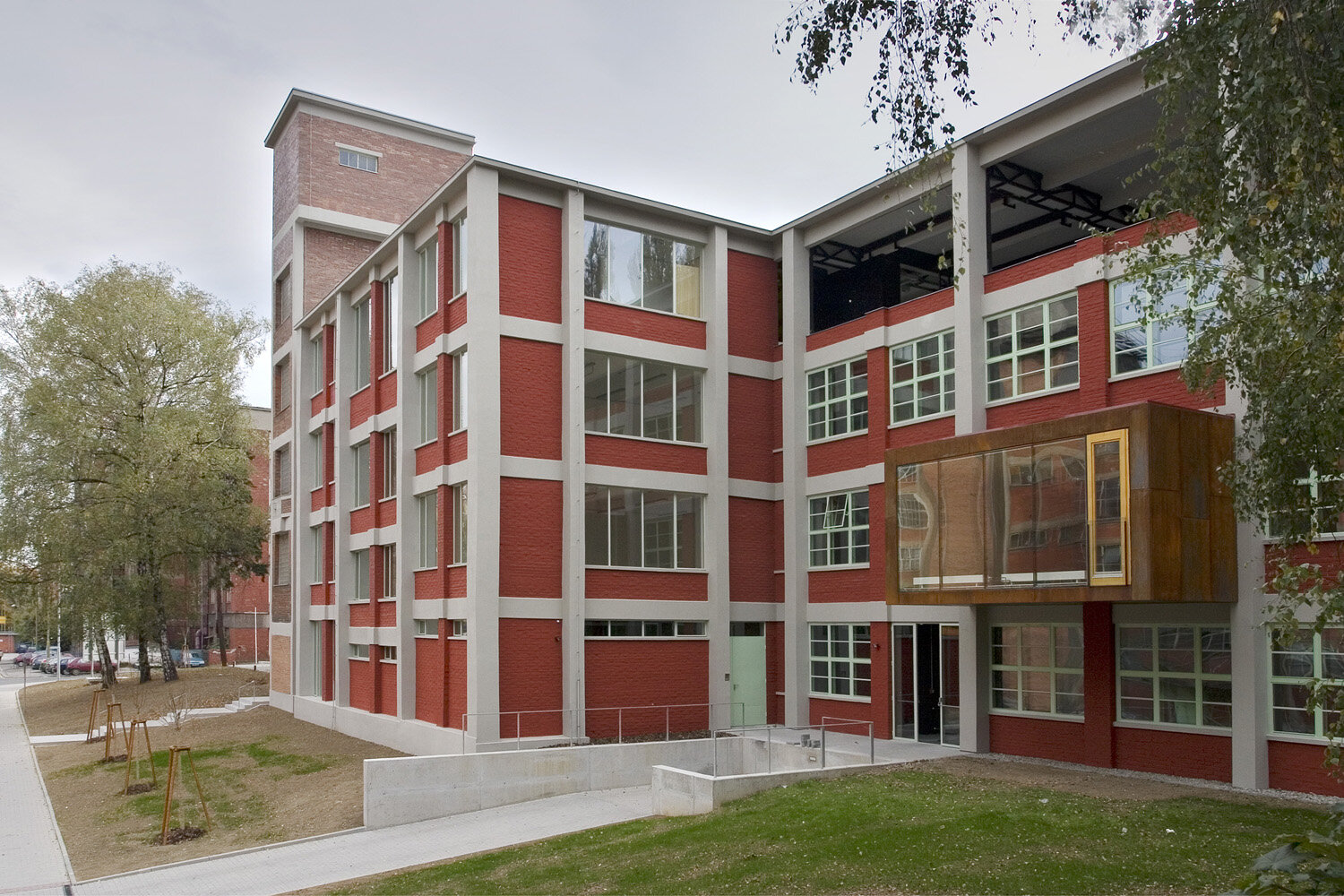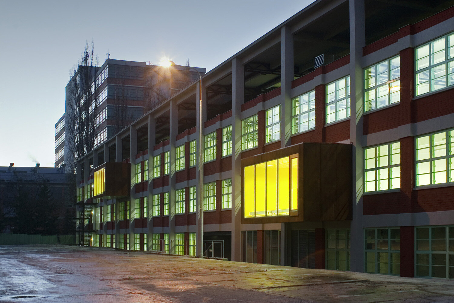 Střední komunikační prostor je propojen vertikálně skrz otvory ve stropních deskách přes všechna patra, což umožňuje dostat do nitra budovy horní světlo. Na tuto formu prosvětlení navazuje ve čtyřech místech ještě světlo boční, skrz prosklené stěny tubusů s jednacími místnostmi. Tubusy prochází skrz původní plášť budovy až do exteriéru (plech Corten) kde dávají jasně najevo novou formu vnitřního uspořádání. Součástí budovy je také vnější výtahová věž z 60.let 20. století. Její krásná vertikální proporce je zakončena bývalou strojovnou výtahu, dnes vyhlídkou na celý areál. Za důležitou součást koncepce považujeme také ponechání původních cihelných parapetních vyzdívek z 30.let spolu s repasovanými okny z 60.let minulého století. Použití nových materiálů má odezvu ve svém okolí: tubusy - plech Corten, vestavba ve na střeše – černá vodovzdorná překližka, vstupní tubus – černý plech, požární schodiště – černý antikorozní nátěr + žárový pozink, podlahy – cementovo-epoxidové lité stěrky, příčky – dřevěná montovaná konstrukce – povrch smrková dýha…apod. Objekt by měl být charakteristický svou původní industriální syrovostí a zároveň konstrukční křehkostí s odkazem na historicky klíčové období výstavby Velkého Zlína.