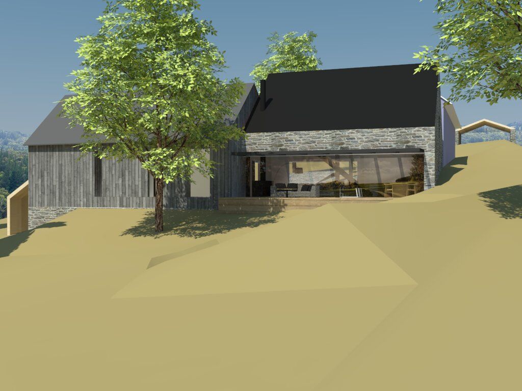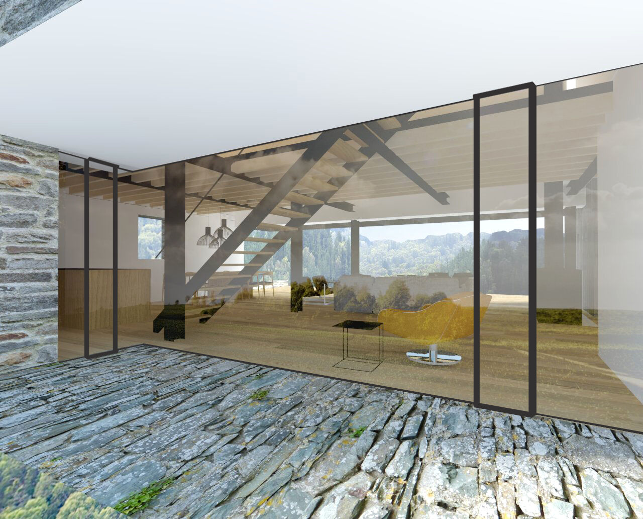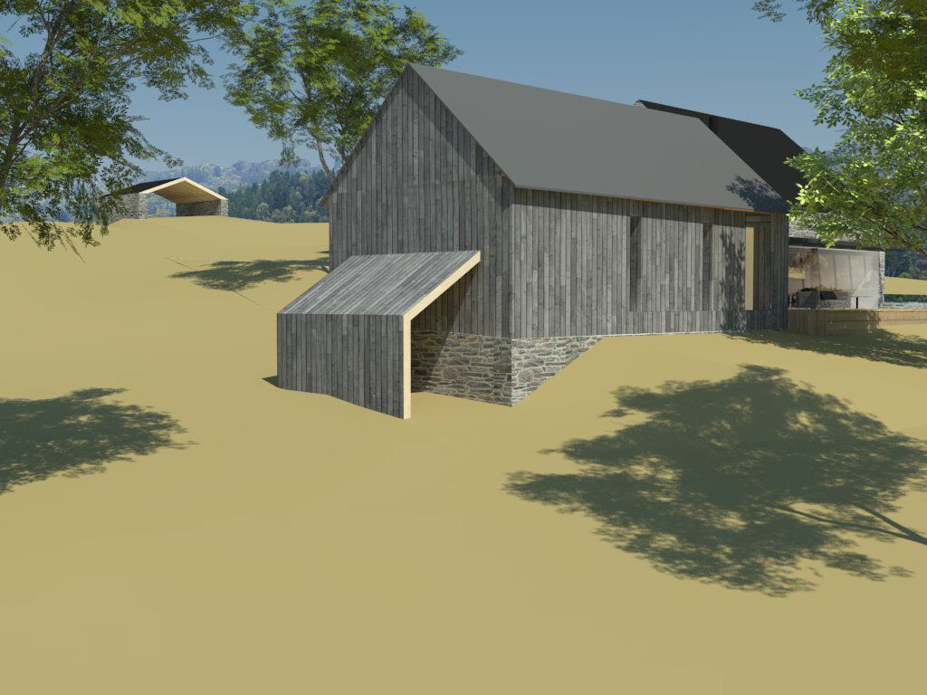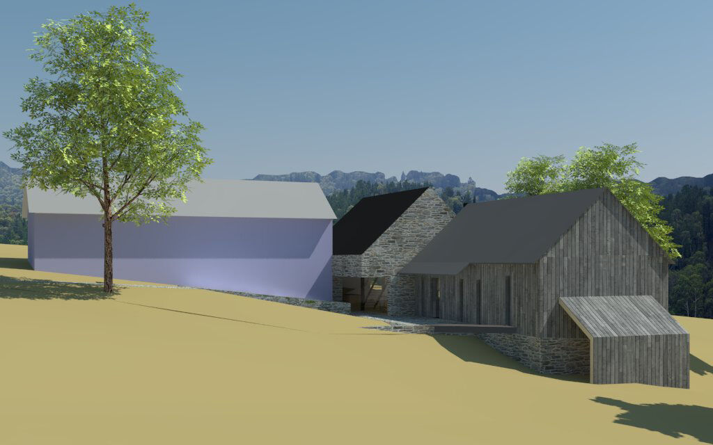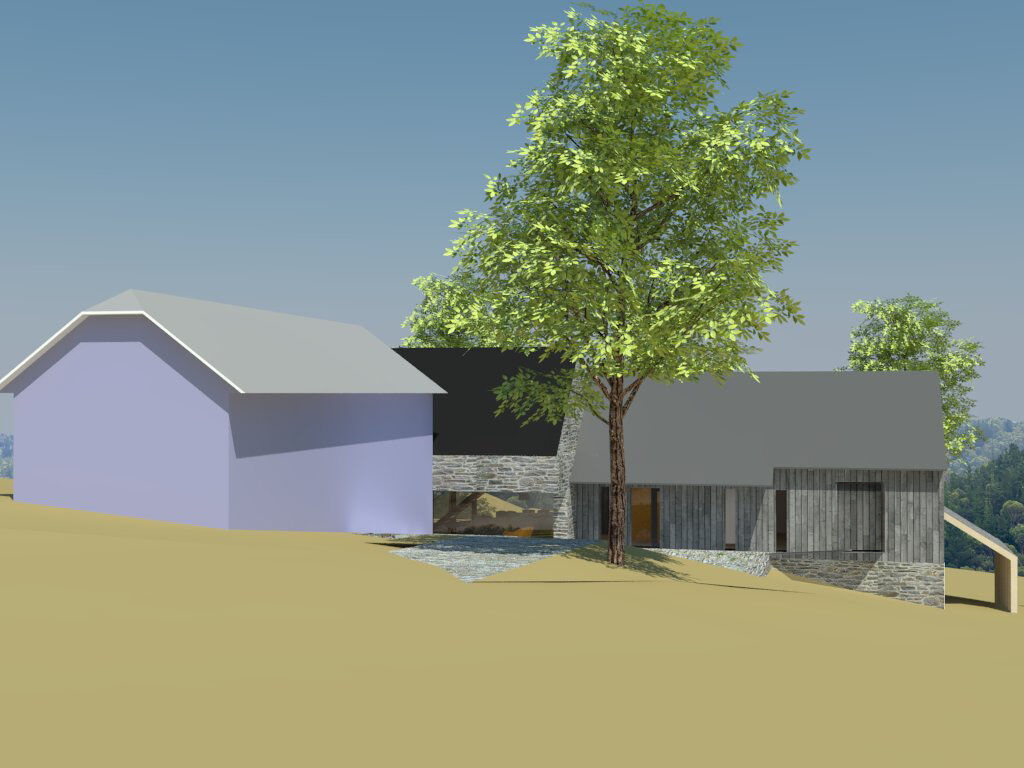 Původní cihelný omítaný dům nebude s novým bydlením propojen, bude zrekonstruován v dochované podobě. Dřevěná stodola bude zrekonstruována tak, aby si vnější plášť i konstrukce zachovaly tradiční hodnoty. Užitný význam si zachová jen v polovině své plochy. Polovina její plochy bude zapojena do nové obytné dispozice. Kamenný dům s plechovou sedlovou střechou je v parteru zcela prosklen, opticky spojuje sevřený dvůr s výhledy do krásného okolí, nevytváří špunt vklíněný mezi domy, ale dotváří nahodilou typickou kompozici. Vstupuje se do stodoly a pak teprve do nové kamenné adice. Dispozice je přehledná, otevřená, transparentní. V prvním podlaží je kromě obytného prostoru s jídelnou a kuchyní ještě ložnice s koupelnou a šatnou. Na hoře je společný prostor galerie, jako rodinná herna a další ložnice s hygienou.