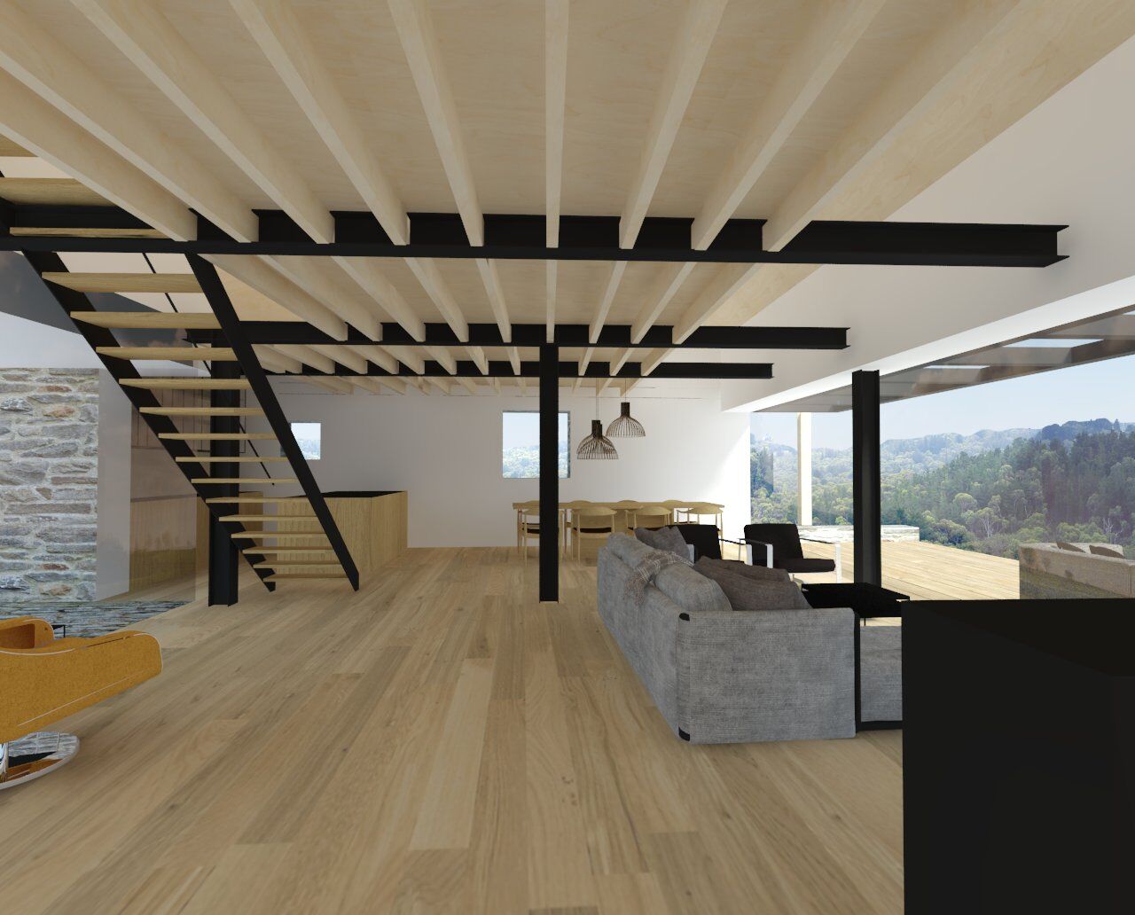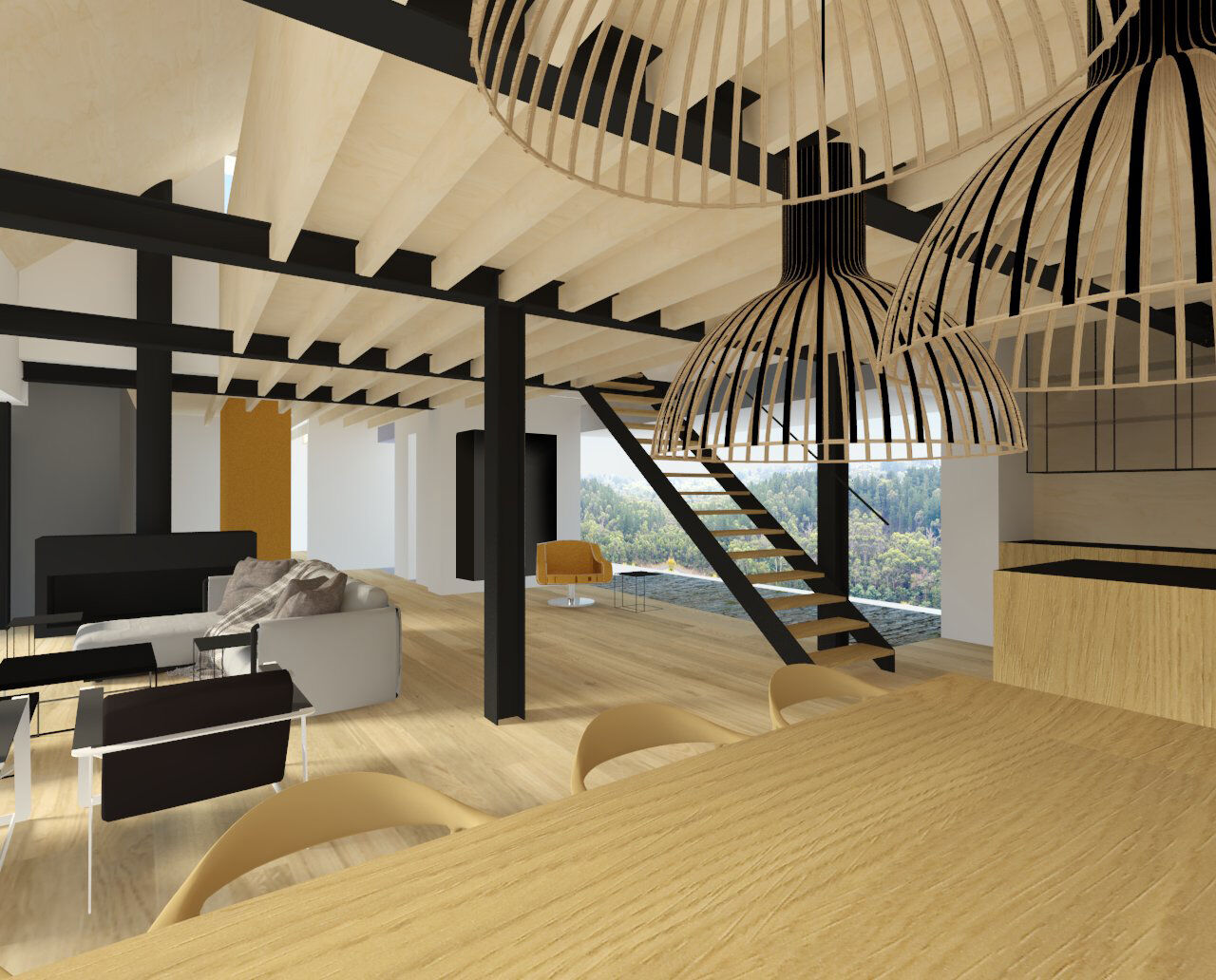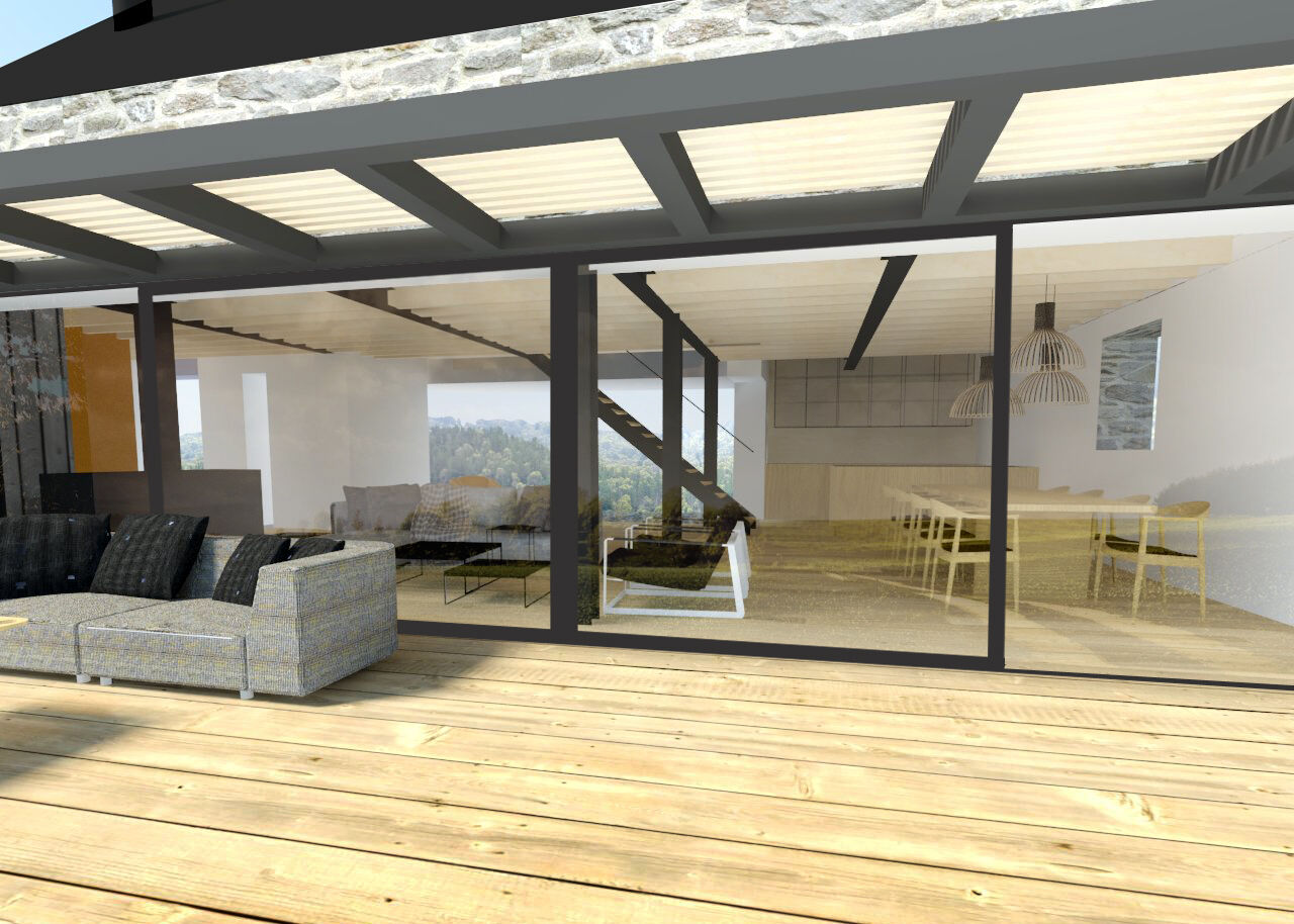 Původní cihelný omítaný dům nebude s novým bydlením propojen, bude zrekonstruován v dochované podobě. Dřevěná stodola bude zrekonstruována tak, aby si vnější plášť i konstrukce zachovaly tradiční hodnoty. Užitný význam si zachová jen v polovině své plochy. Polovina její plochy bude zapojena do nové obytné dispozice. Kamenný dům s plechovou sedlovou střechou je v parteru zcela prosklen, opticky spojuje sevřený dvůr s výhledy do krásného okolí, nevytváří špunt vklíněný mezi domy, ale dotváří nahodilou typickou kompozici. Vstupuje se do stodoly a pak teprve do nové kamenné adice. Dispozice je přehledná, otevřená, transparentní. V prvním podlaží je kromě obytného prostoru s jídelnou a kuchyní ještě ložnice s koupelnou a šatnou. Na hoře je společný prostor galerie, jako rodinná herna a další ložnice s hygienou.