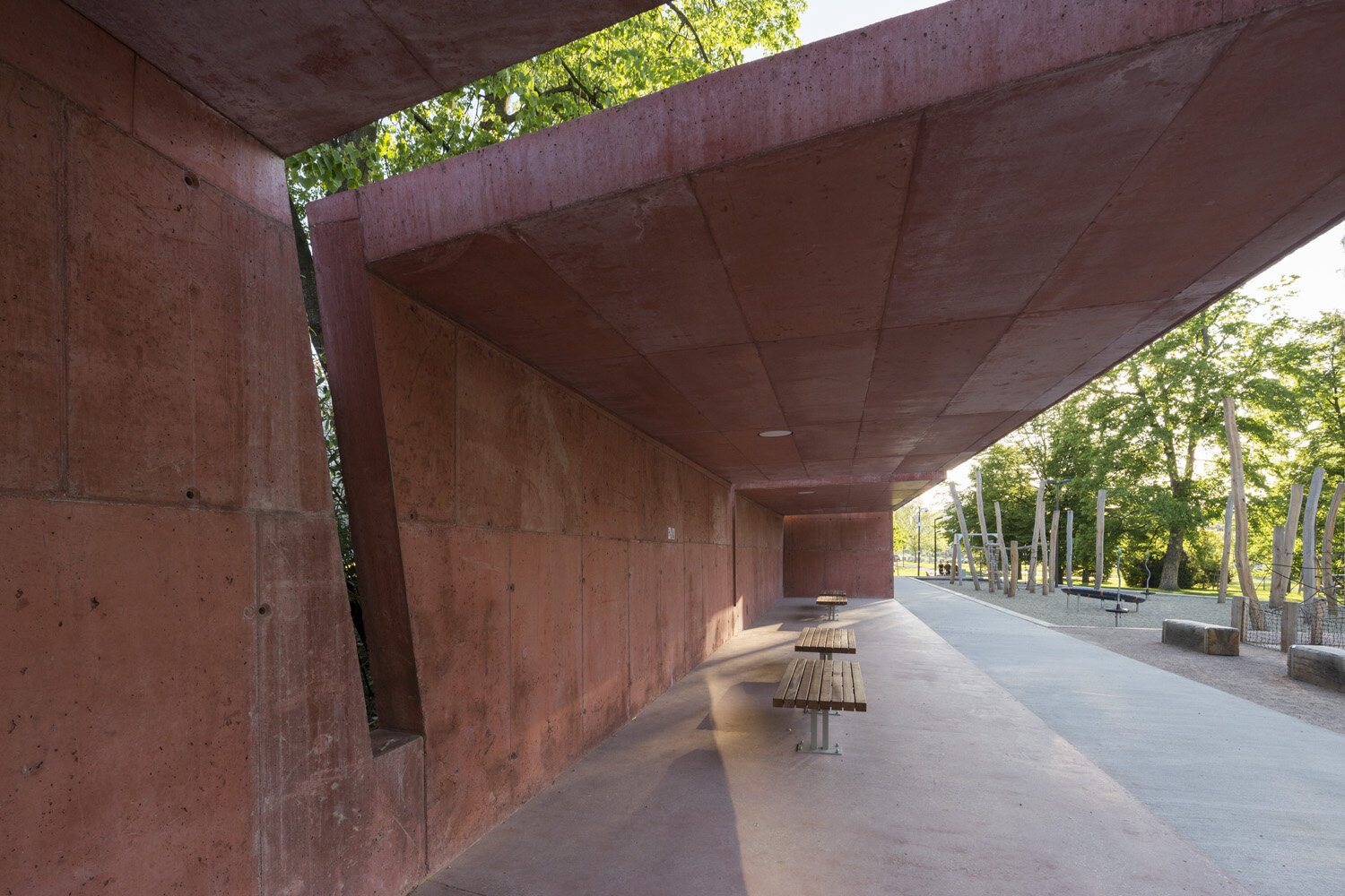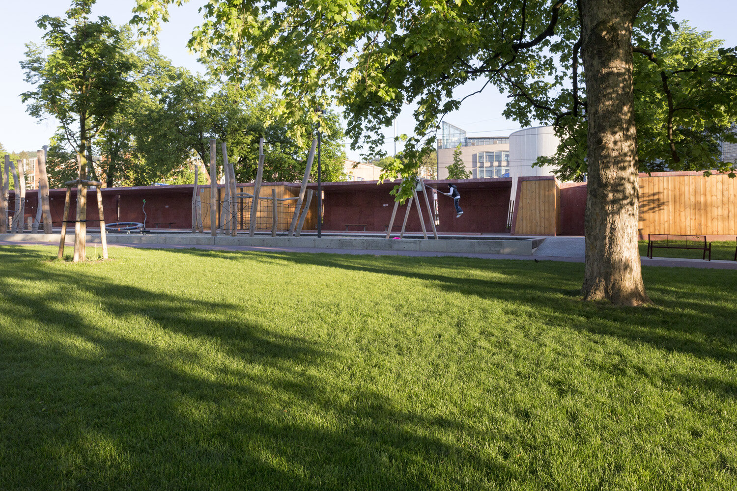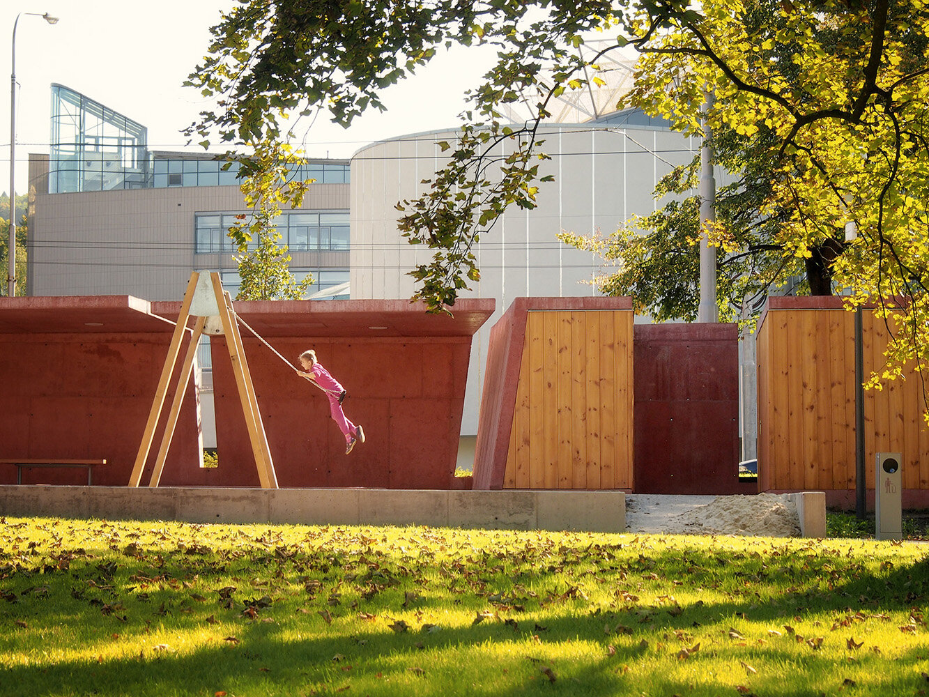 Součástí koncepce se staly nové objekty, které byly do plochy zeleně vloženy. Každý má svou funkci a zásadním způsobem ovlivňuje prostorové parametry. Dostavba kavárny k objektu bývalé školy, stavby z konce 19. století, se měla stát jakýmsi zázemím pro park a objektem otevřeným pro veřejnost a do městských ulic. Záměr koncepce vlastní budovy se ale bohužel nepodařilo prosadit, rekonstrukce stavby není naším dílem. Kašna spoluvytvářející „piazatelku“ před vstupem do tohoto objektu, altán v centrální zeleni, objekt uzavírající park na rušné ulici Štefánikově (objekt dopravního podniku), hřiště pro děti i dospělé s objektem „sala terrena“.