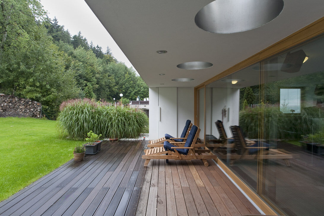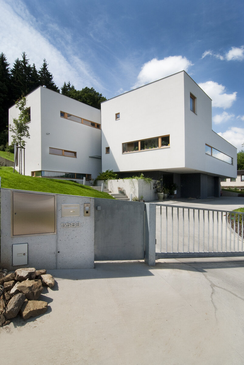 Parcela je pod lesem, nad příjezdovou komunikací.Dispozice a výškové uspořádání je tímto zásadně ovlivněno. Společenské a pobytové prostory jsou směřovány do klidu, ke slunci, k lesu, současně je umožněn velkorysý výhled souvislým průzorem do údolí. V rozporu s možnostmi pozemku bylo požadováno zabezpečit bydlení na jedné úrovni. Toho je dosaženo na úrovni prvního podlaží, které je těžištěm bydlení v domě a kde je vše pro bydlení manželů. Vazba na zahradu do svahu je zdůrazněna terasou s překrytím vlastní hmotou domu. Vrchní podlaží s pracovnou a terasou doplňují dva pokoje jako rezerva pro návštěvy.