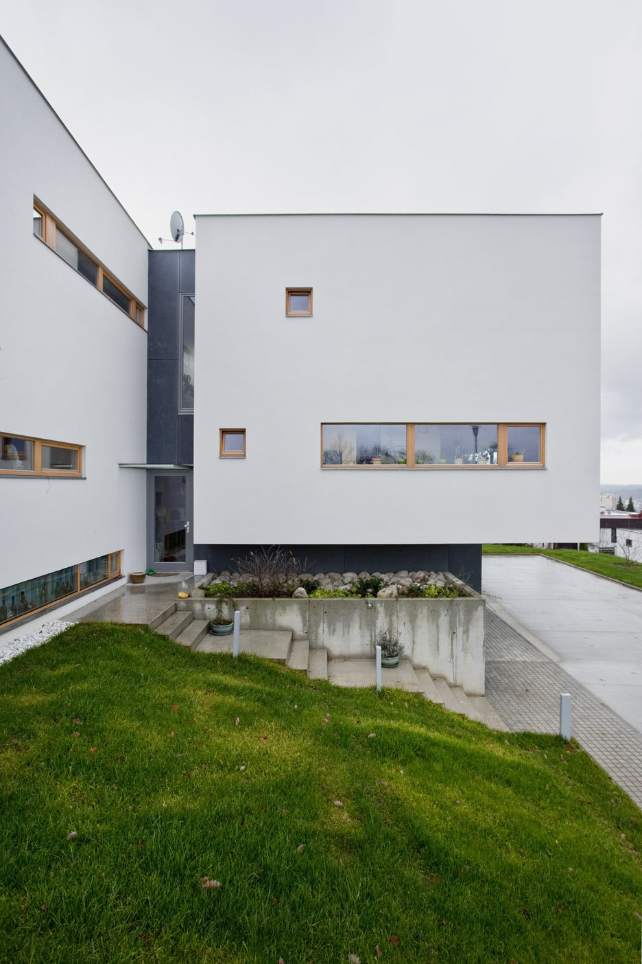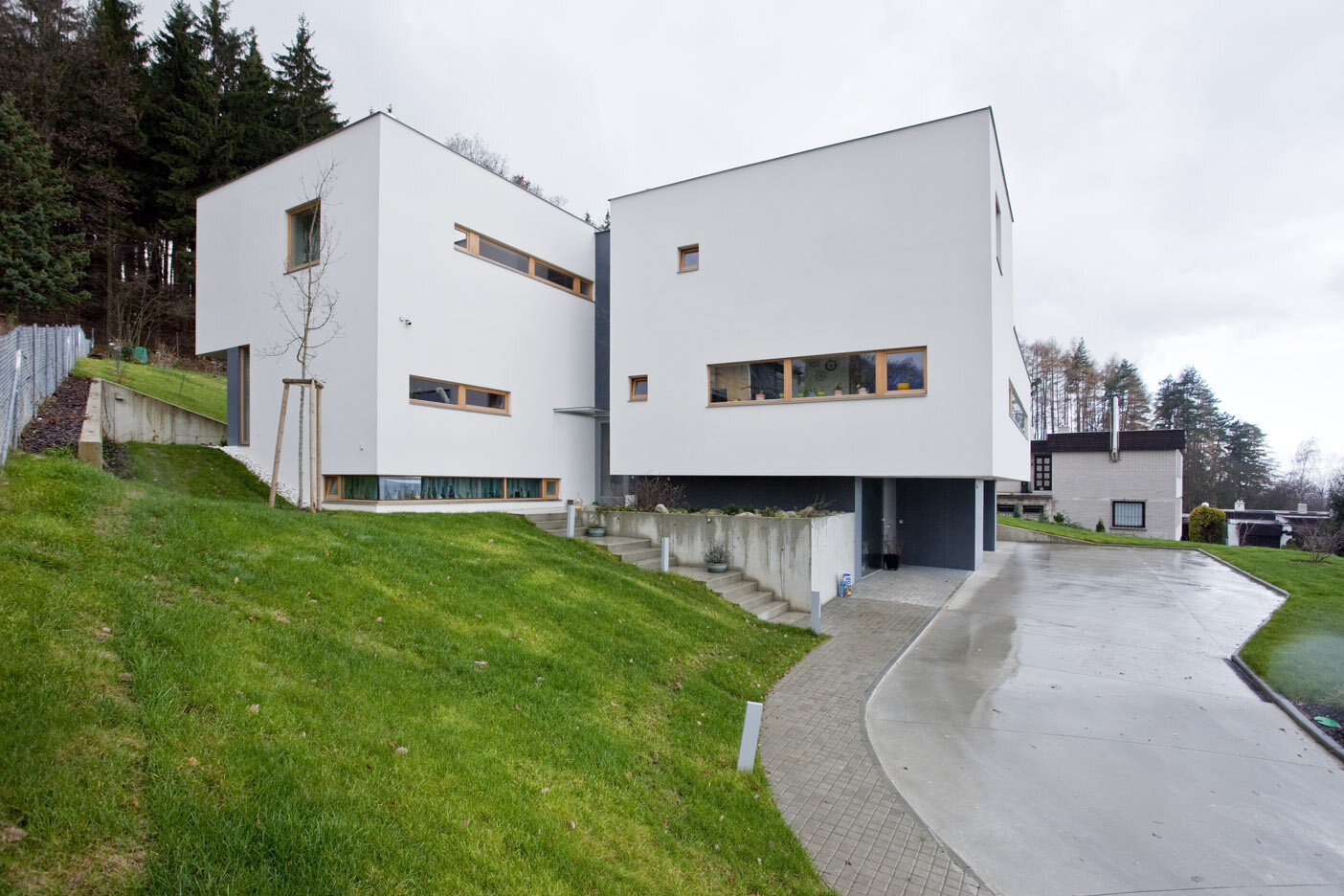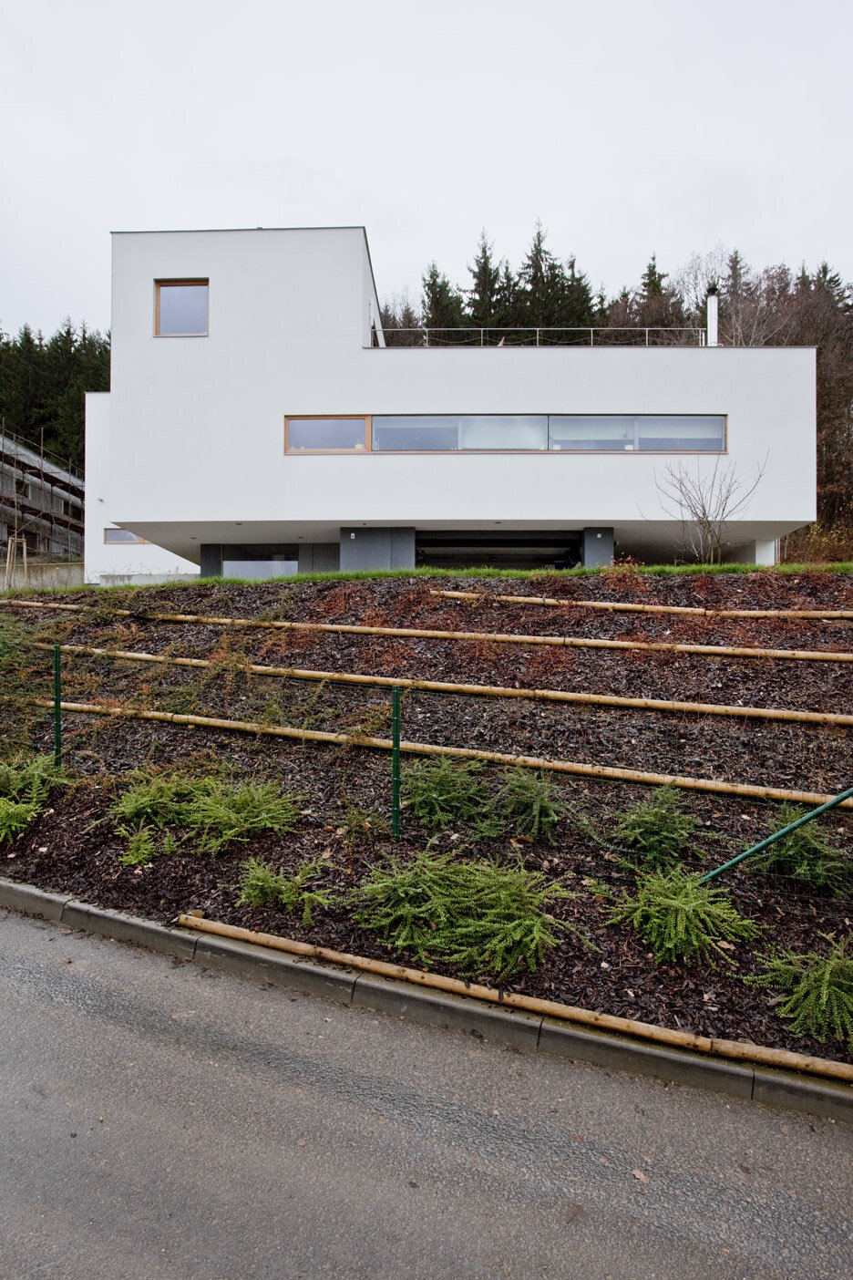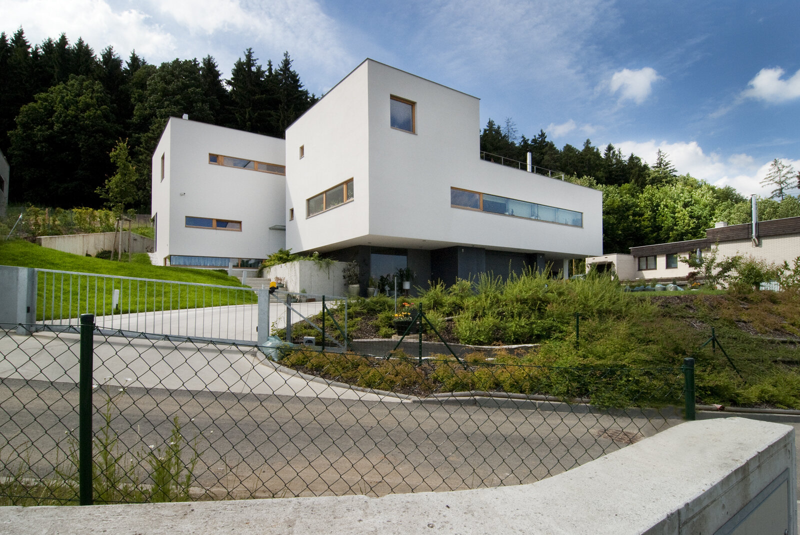 Spodní podlaží je vstupní s garáží, saunou a technickým zázemím domu. Provázanost prostorů zabezpečuje otevřené betonové schodiště s výstupem do terénu také na první mezipodestě. Ostře řezané objemy jsou strukturovány roztržením kompaktnosti , hmota dvou horních podlaží je posazena na odlehčený sokl suterénu. Fasáda je hladká ze světlé omítky a cembonitového obkladu , okna dřevěná . Stavba je železobetonová a vyzdívaná z keramických bloků. Zdroj tepla zabezpečují vrty tepelných čerpadel . V letních měsících bílý dům krásně kontrastuje se zeleným pozadím lesa.