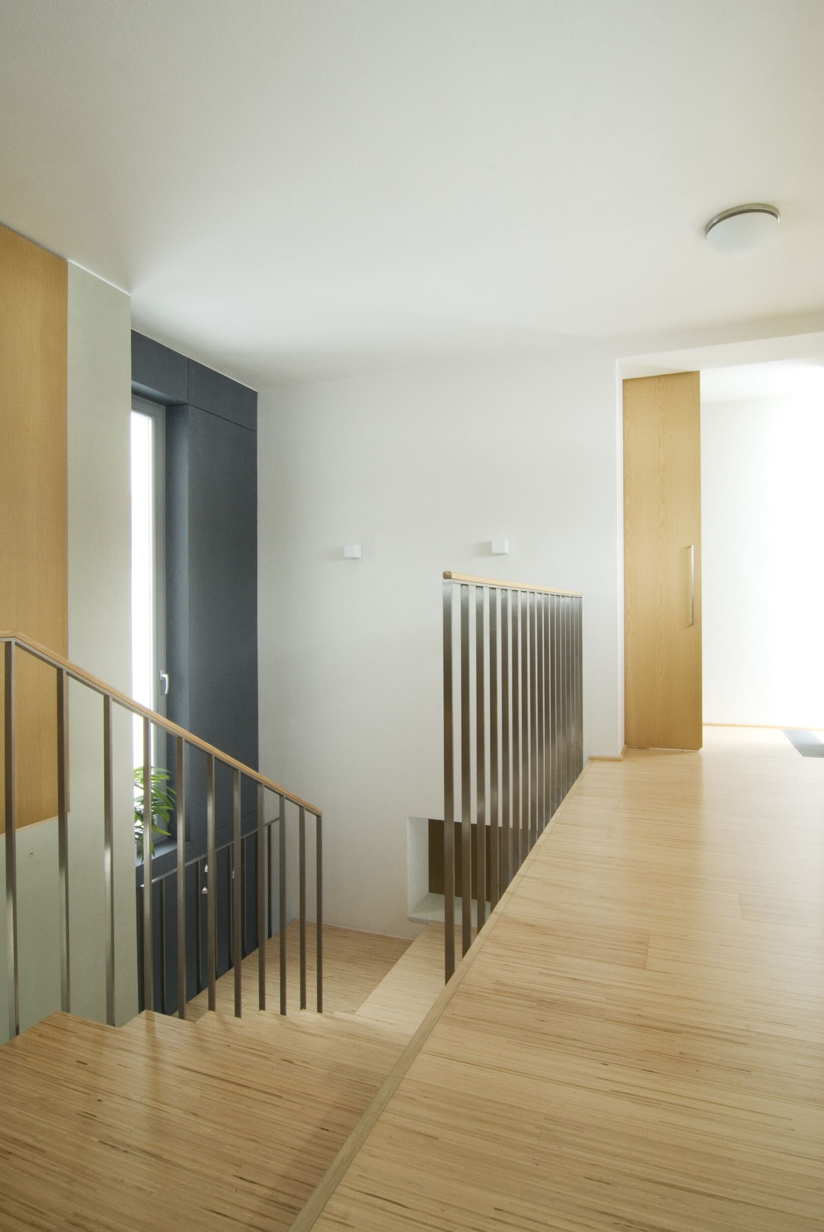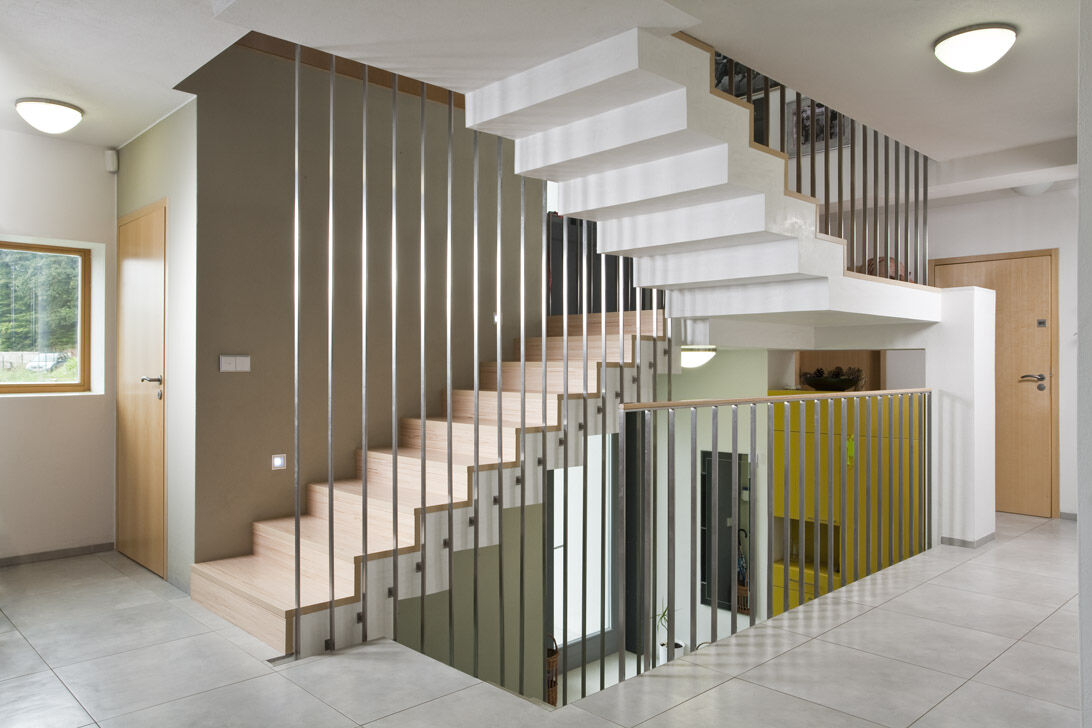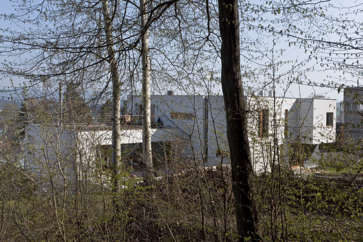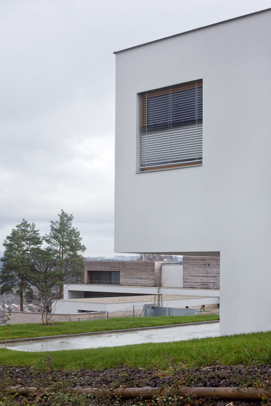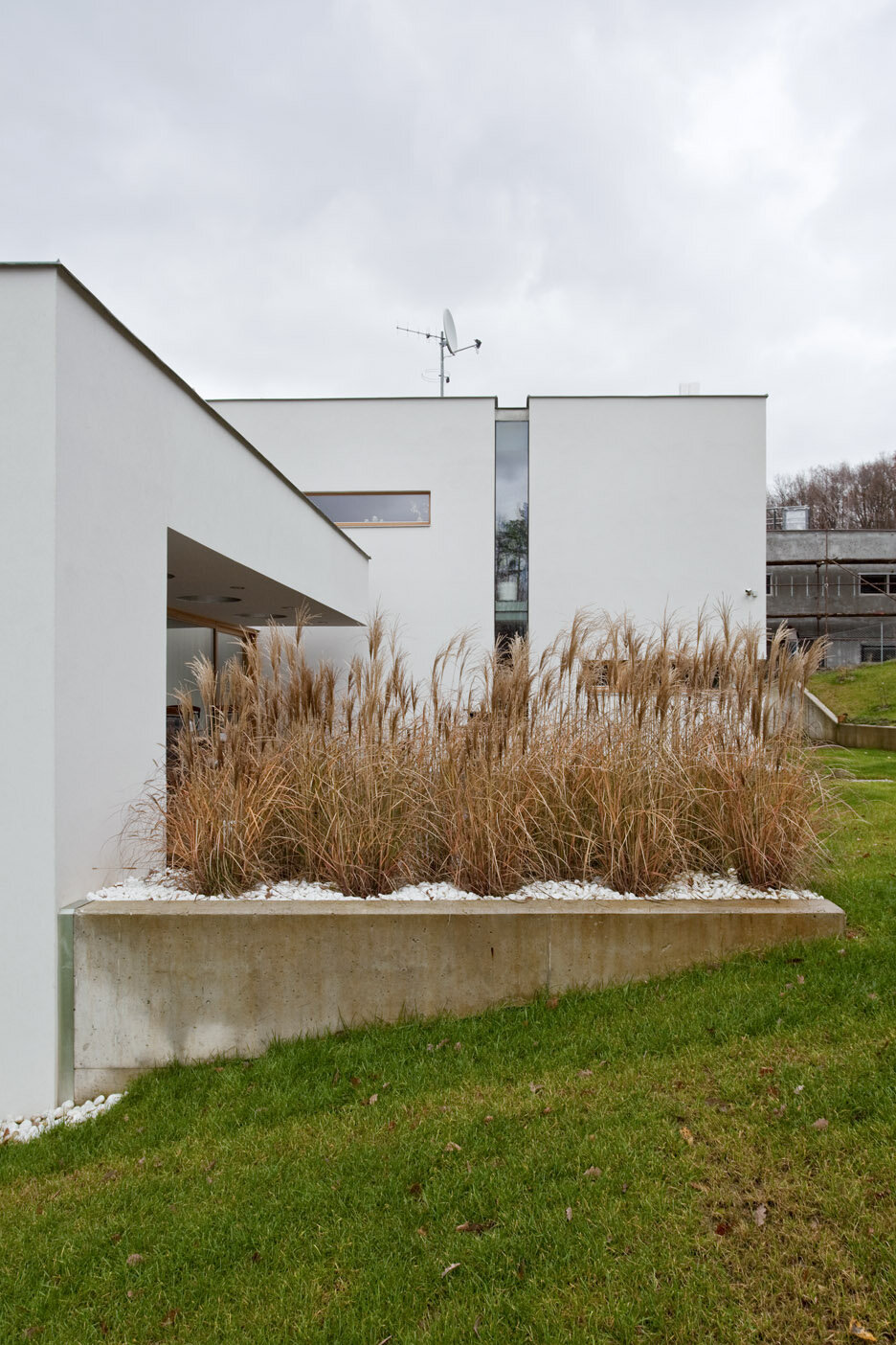 Spodní podlaží je vstupní s garáží, saunou a technickým zázemím domu. Provázanost prostorů zabezpečuje otevřené betonové schodiště s výstupem do terénu také na první mezipodestě. Ostře řezané objemy jsou strukturovány roztržením kompaktnosti , hmota dvou horních podlaží je posazena na odlehčený sokl suterénu. Fasáda je hladká ze světlé omítky a cembonitového obkladu , okna dřevěná . Stavba je železobetonová a vyzdívaná z keramických bloků. Zdroj tepla zabezpečují vrty tepelných čerpadel . V letních měsících bílý dům krásně kontrastuje se zeleným pozadím lesa.