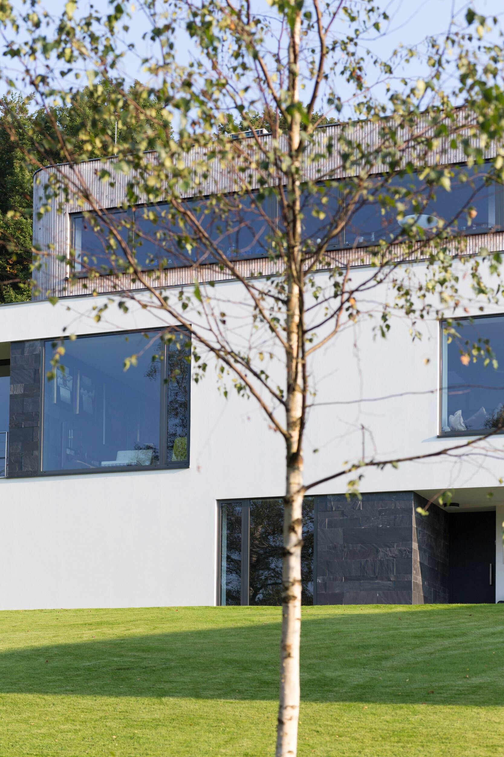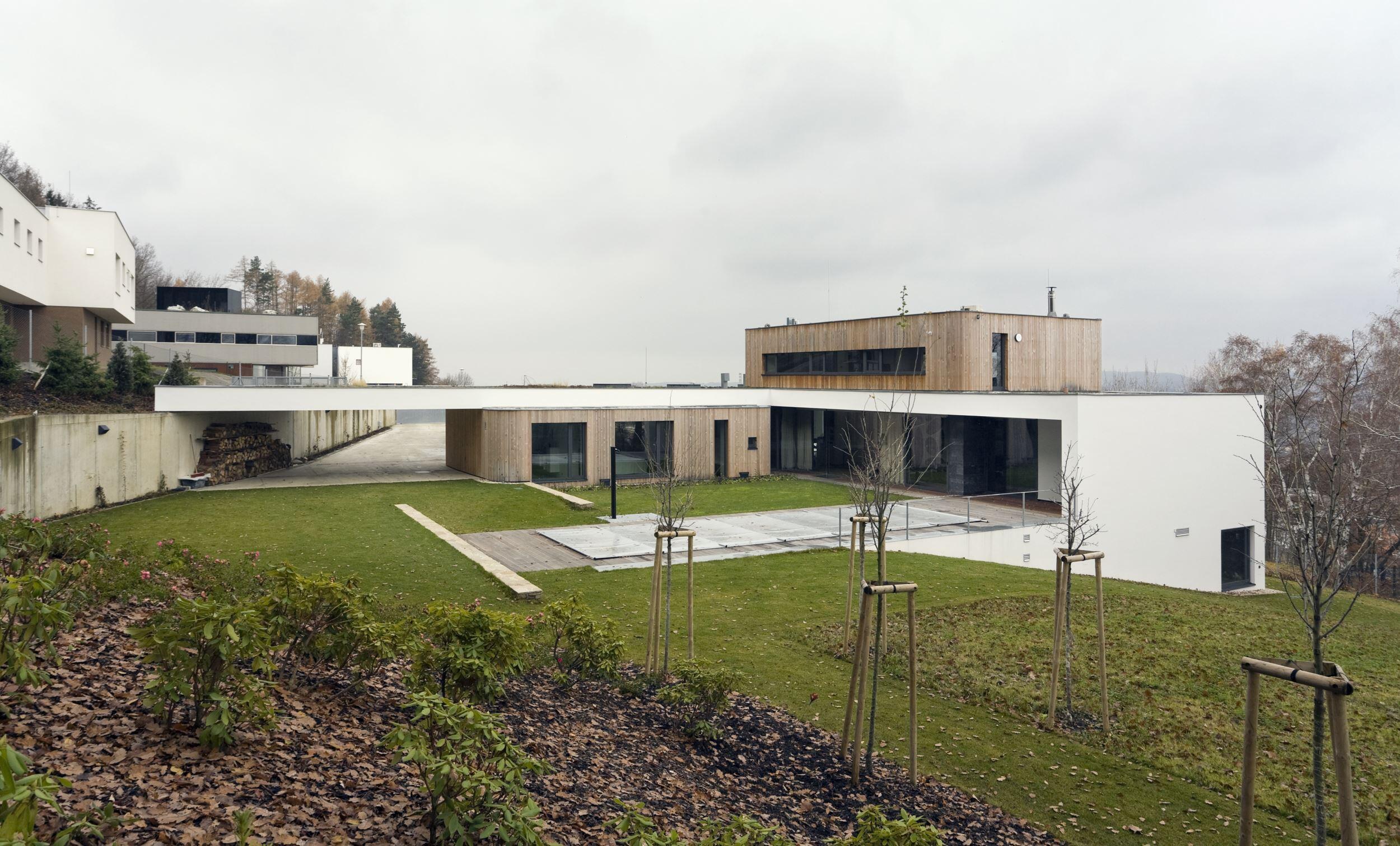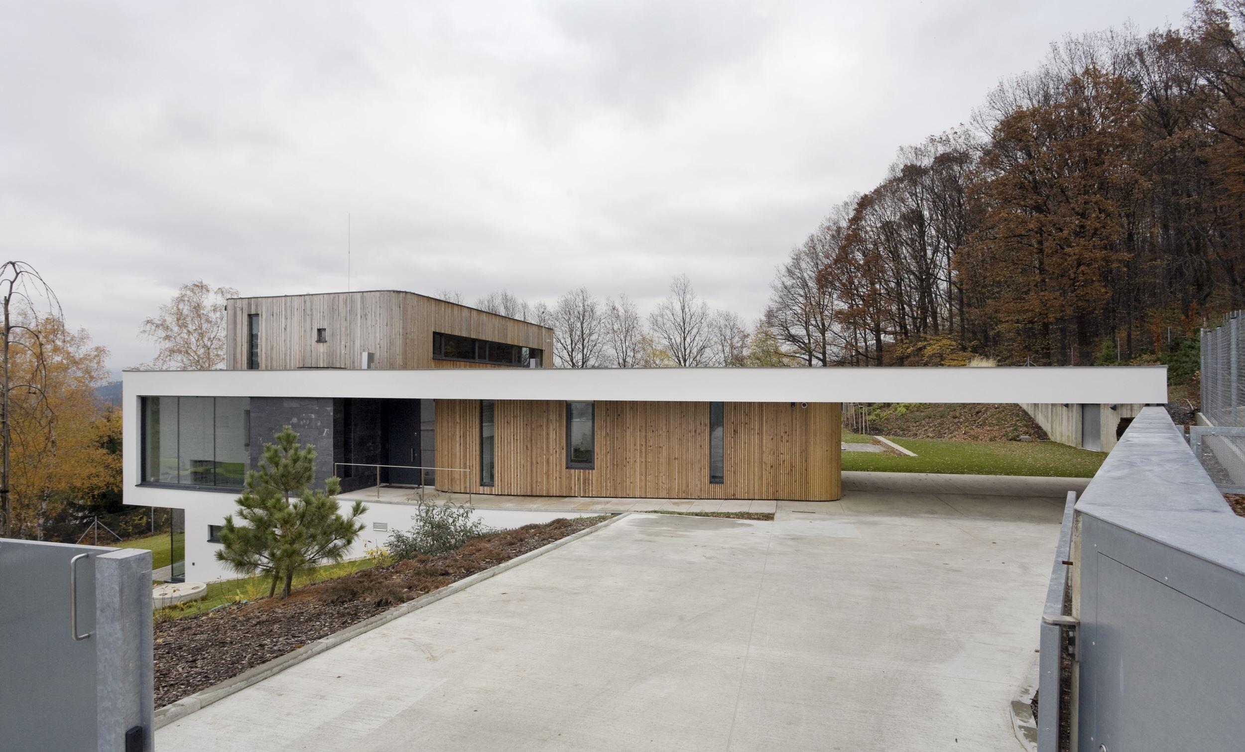 Druhé podlaží je přístupno přes jednoramenné, ocelové, do stěny vetknuté, schodiště. Zde je prostorná pracovna, k tomu rezervní ložnice a sprcha s toaletou, prosvětlená sklobetony. Rozsáhlý prostor pracovny je příčně oboustranně prosvětlen souvislými pásovými okny, umožňujícími nádherné výhledy do lesa na jedné straně a do údolí města na straně druhé. Střecha prvního podlaží je pochůzí s extenzivní zelení. Suterén je rozsáhlý. Kromě velkého technického zázemí je zde samostatný, zvenčí přístupný byt, případně pro návštěvy, trenažer golfu a oáza klidu se saunou a relaxačním bazénkem. Třípodlažní dům je vertikálně propojen výtahem. Stavba je charakteristická hladkou jemnozrnnou světlou omítkou a sendvičovými plochami s dřevěnými, svislými cedrovými hranoly na povrchu. Nosný systém využívá železobetonu na vodorovné, stropní i svislé stěnové konstrukce, zdivo je keramické, zatepleno minerální tepelnou izolací, velkorysé otvory oken jsou ocelové a reagují tak na výjimečnost pozemku, kde jižní, intimní strana se zalesněným svahem , je protikladem straně severní , s výhledy až na horizonty Hostýnských vrchů .