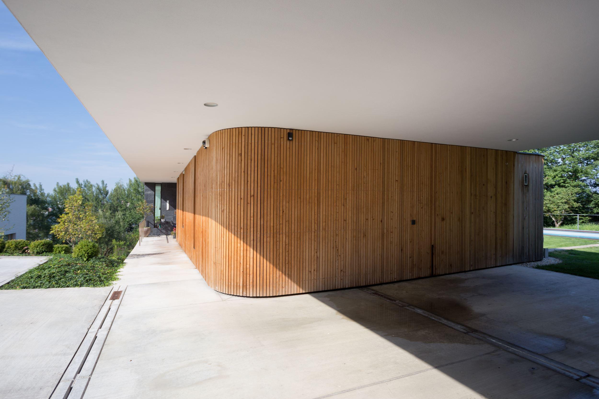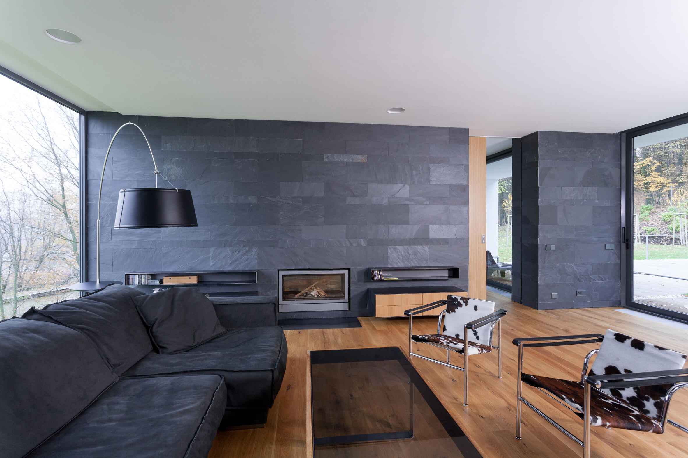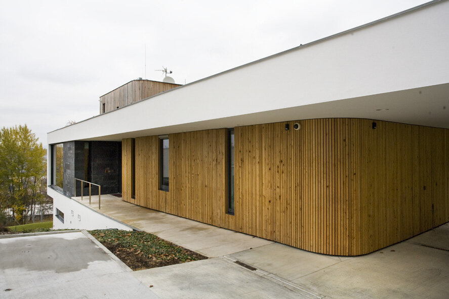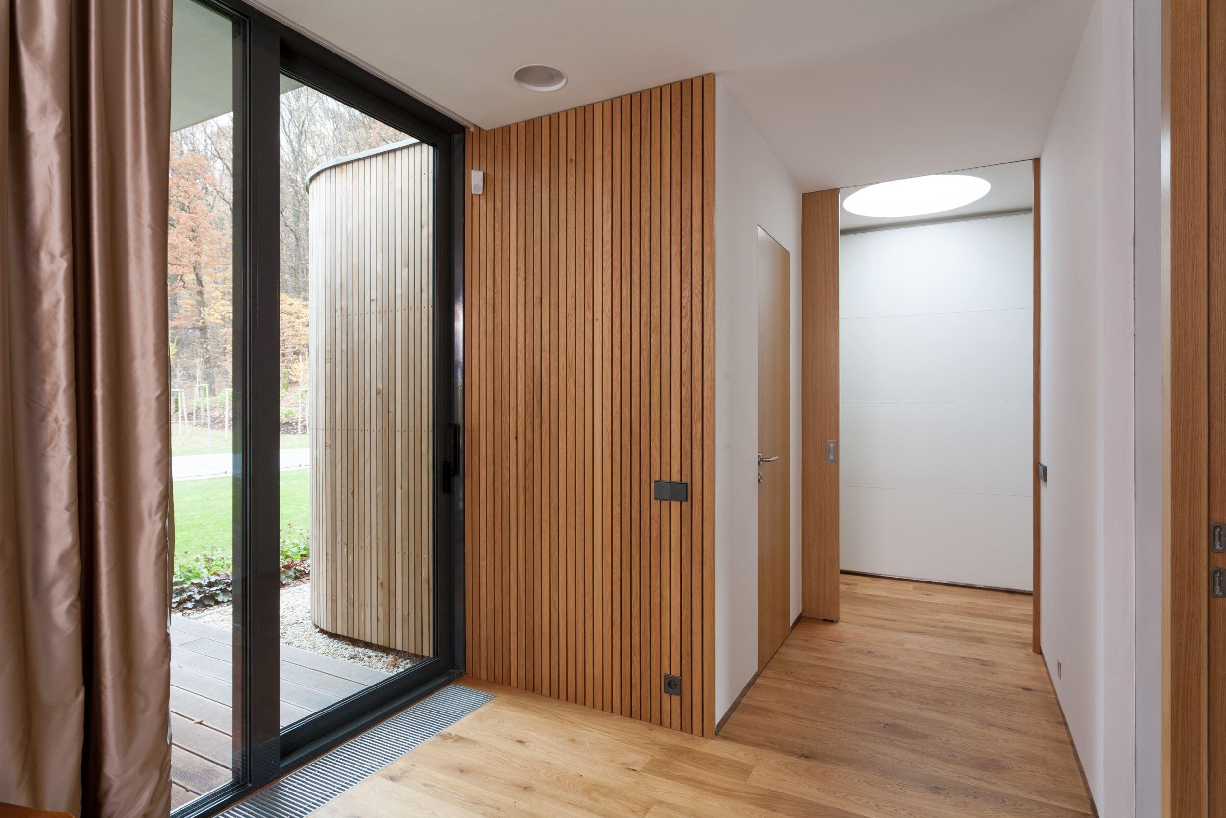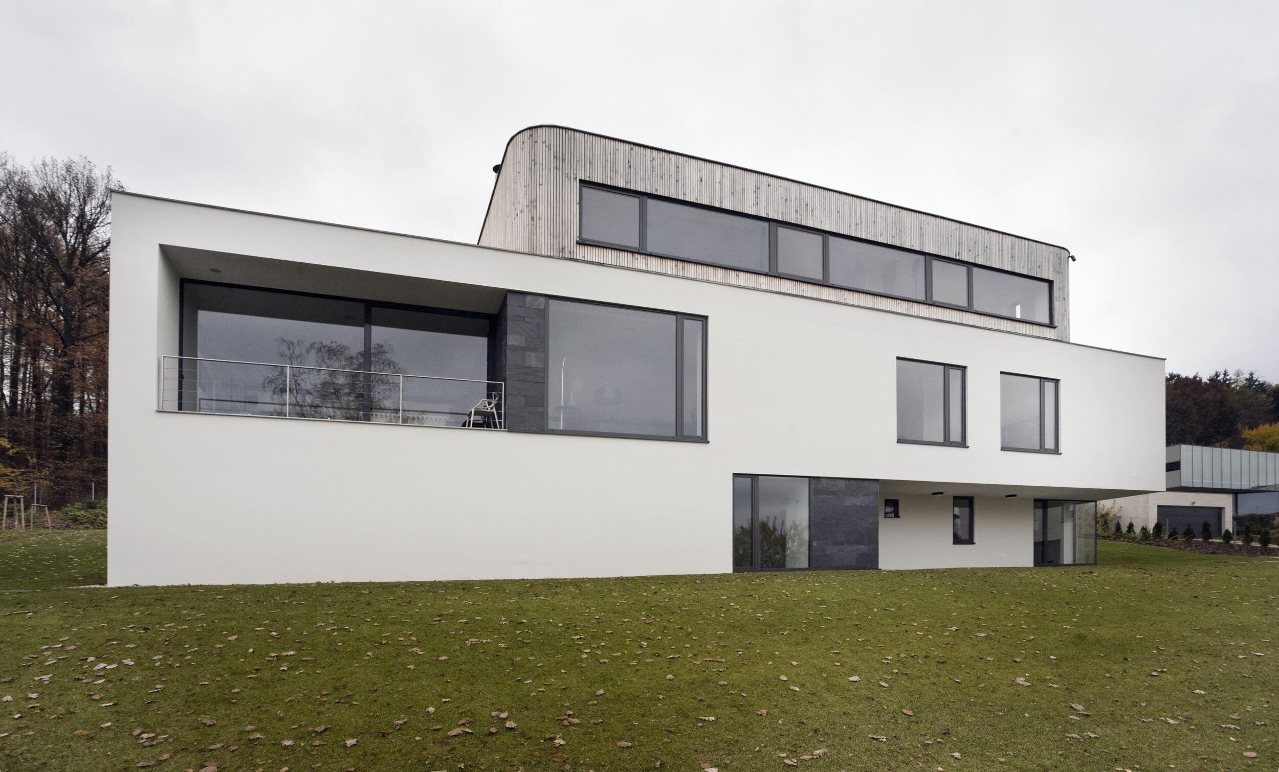 Druhé podlaží je přístupno přes jednoramenné, ocelové, do stěny vetknuté, schodiště. Zde je prostorná pracovna, k tomu rezervní ložnice a sprcha s toaletou, prosvětlená sklobetony. Rozsáhlý prostor pracovny je příčně oboustranně prosvětlen souvislými pásovými okny, umožňujícími nádherné výhledy do lesa na jedné straně a do údolí města na straně druhé. Střecha prvního podlaží je pochůzí s extenzivní zelení. Suterén je rozsáhlý. Kromě velkého technického zázemí je zde samostatný, zvenčí přístupný byt, případně pro návštěvy, trenažer golfu a oáza klidu se saunou a relaxačním bazénkem. Třípodlažní dům je vertikálně propojen výtahem. Stavba je charakteristická hladkou jemnozrnnou světlou omítkou a sendvičovými plochami s dřevěnými, svislými cedrovými hranoly na povrchu. Nosný systém využívá železobetonu na vodorovné, stropní i svislé stěnové konstrukce, zdivo je keramické, zatepleno minerální tepelnou izolací, velkorysé otvory oken jsou ocelové a reagují tak na výjimečnost pozemku, kde jižní, intimní strana se zalesněným svahem , je protikladem straně severní , s výhledy až na horizonty Hostýnských vrchů .