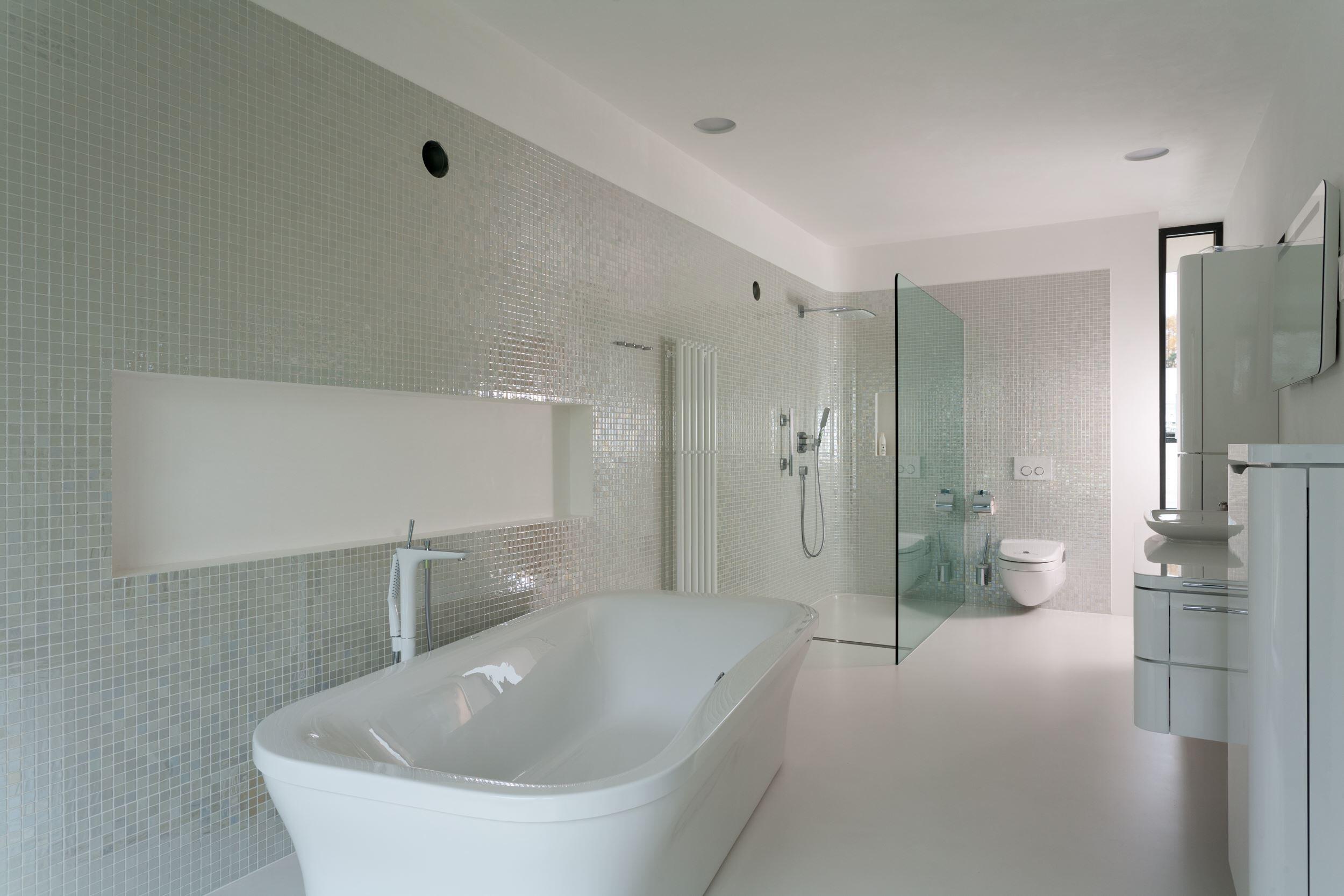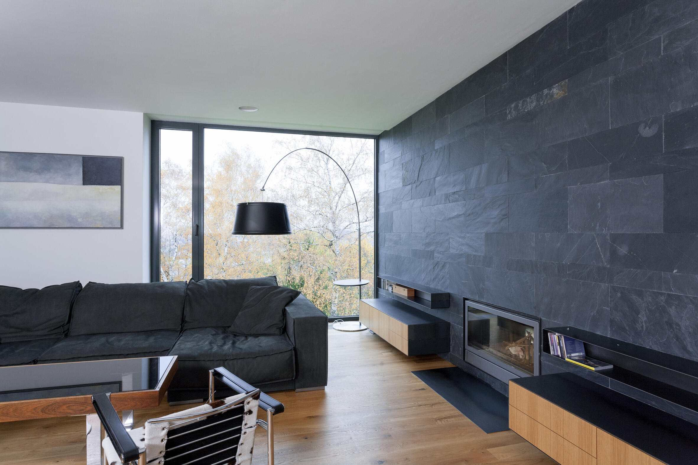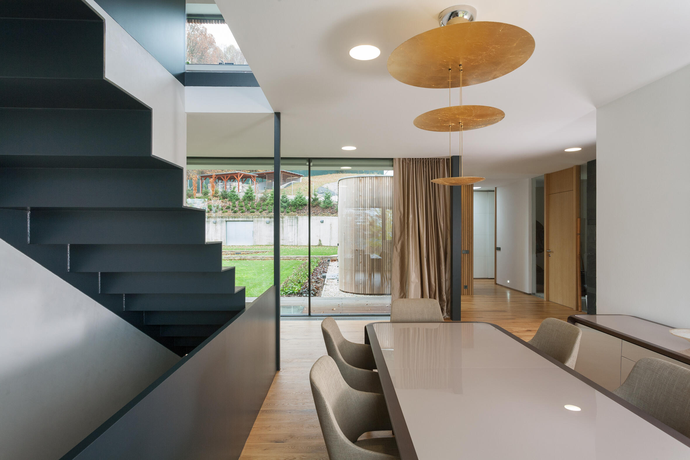 Druhé podlaží je přístupno přes jednoramenné, ocelové, do stěny vetknuté, schodiště. Zde je prostorná pracovna, k tomu rezervní ložnice a sprcha s toaletou, prosvětlená sklobetony. Rozsáhlý prostor pracovny je příčně oboustranně prosvětlen souvislými pásovými okny, umožňujícími nádherné výhledy do lesa na jedné straně a do údolí města na straně druhé. Střecha prvního podlaží je pochůzí s extenzivní zelení. Suterén je rozsáhlý. Kromě velkého technického zázemí je zde samostatný, zvenčí přístupný byt, případně pro návštěvy, trenažer golfu a oáza klidu se saunou a relaxačním bazénkem. Třípodlažní dům je vertikálně propojen výtahem. Stavba je charakteristická hladkou jemnozrnnou světlou omítkou a sendvičovými plochami s dřevěnými, svislými cedrovými hranoly na povrchu. Nosný systém využívá železobetonu na vodorovné, stropní i svislé stěnové konstrukce, zdivo je keramické, zatepleno minerální tepelnou izolací, velkorysé otvory oken jsou ocelové a reagují tak na výjimečnost pozemku, kde jižní, intimní strana se zalesněným svahem , je protikladem straně severní , s výhledy až na horizonty Hostýnských vrchů .