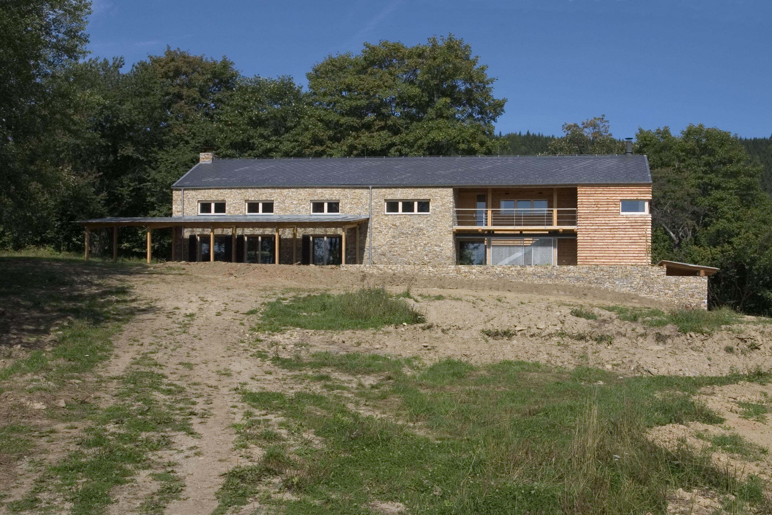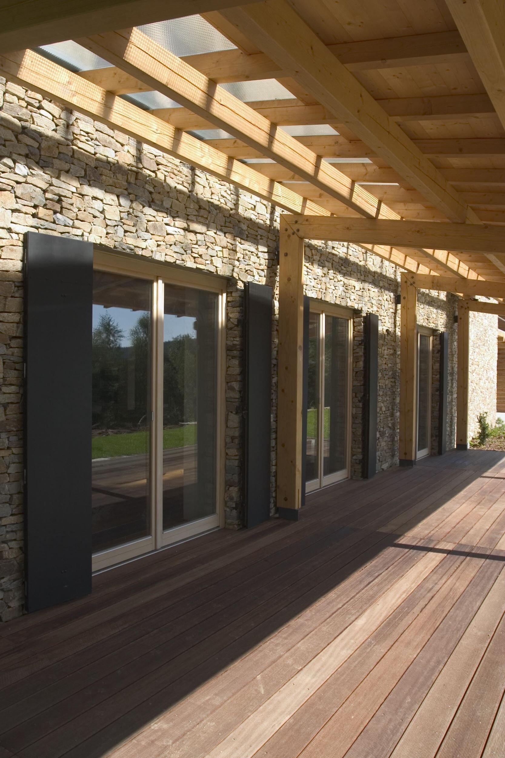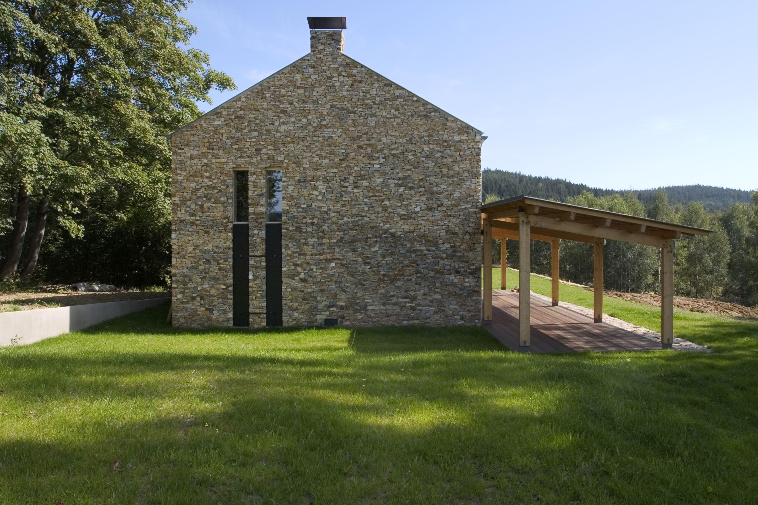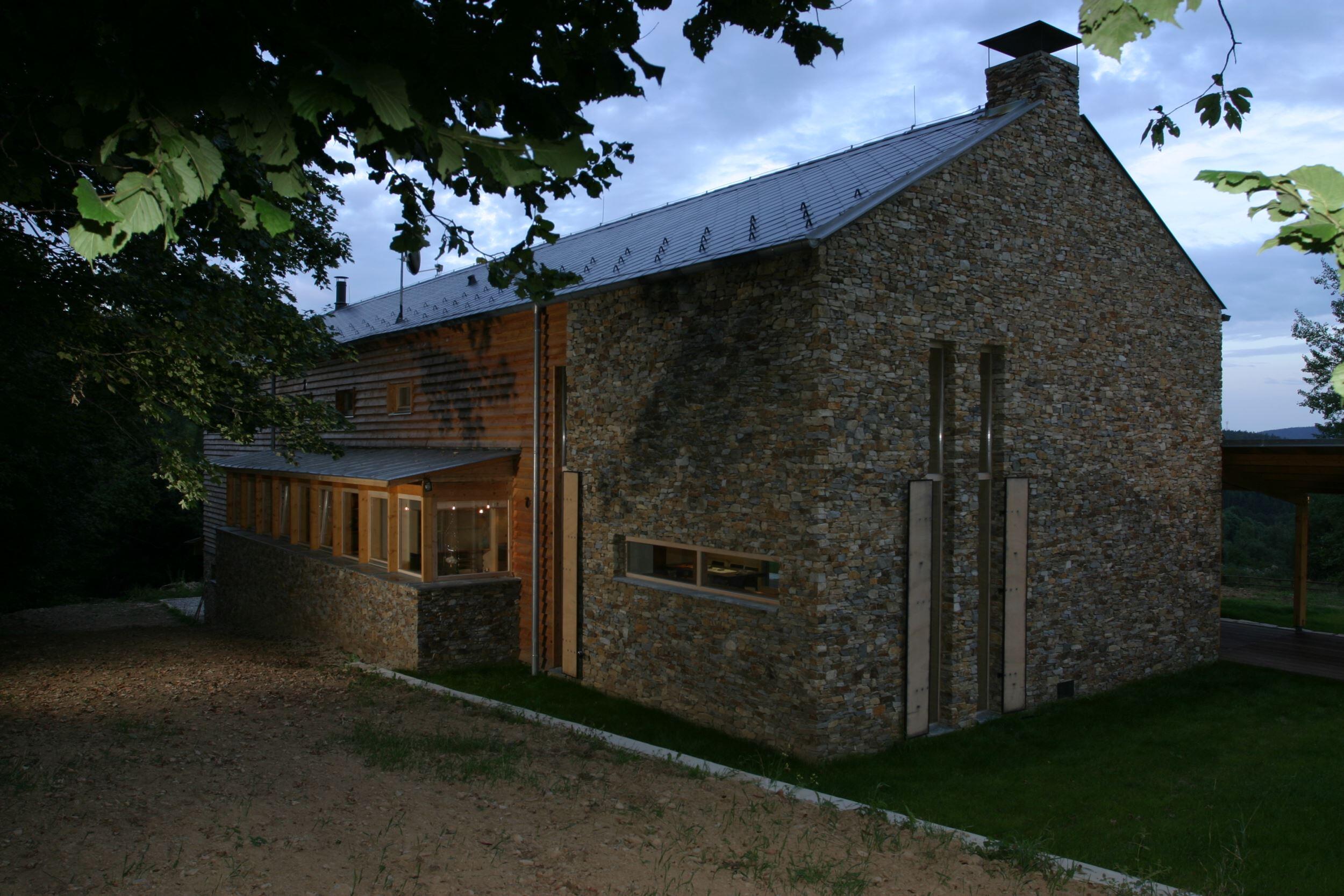 Stavební podstata je založena na pravdivosti materiálů vně i uvnitř domu. Vnější plášť tvoří kámen z místního lomu “Plešivec“ a modřínové fošny kladené na peření, upravené oleji.