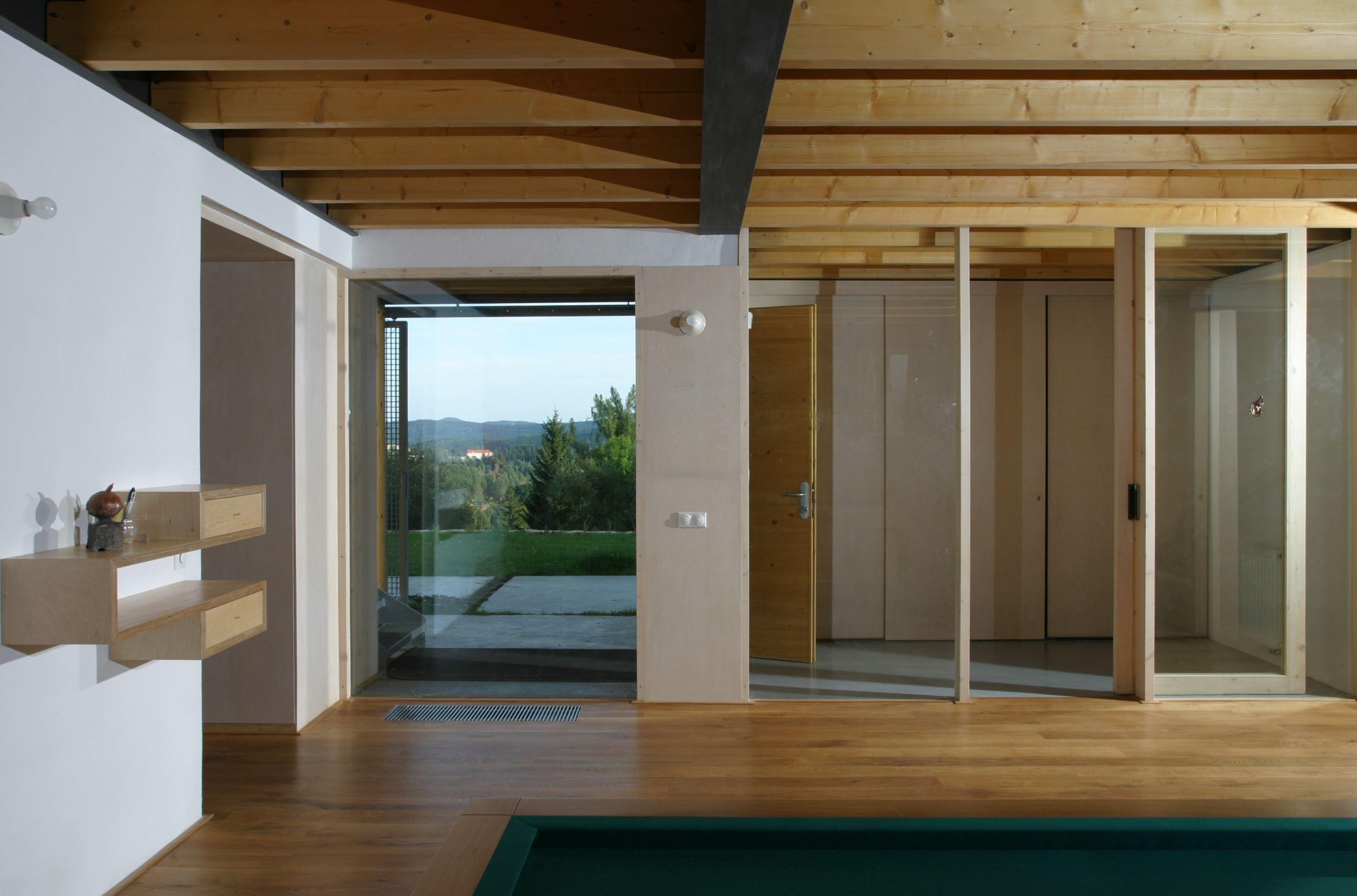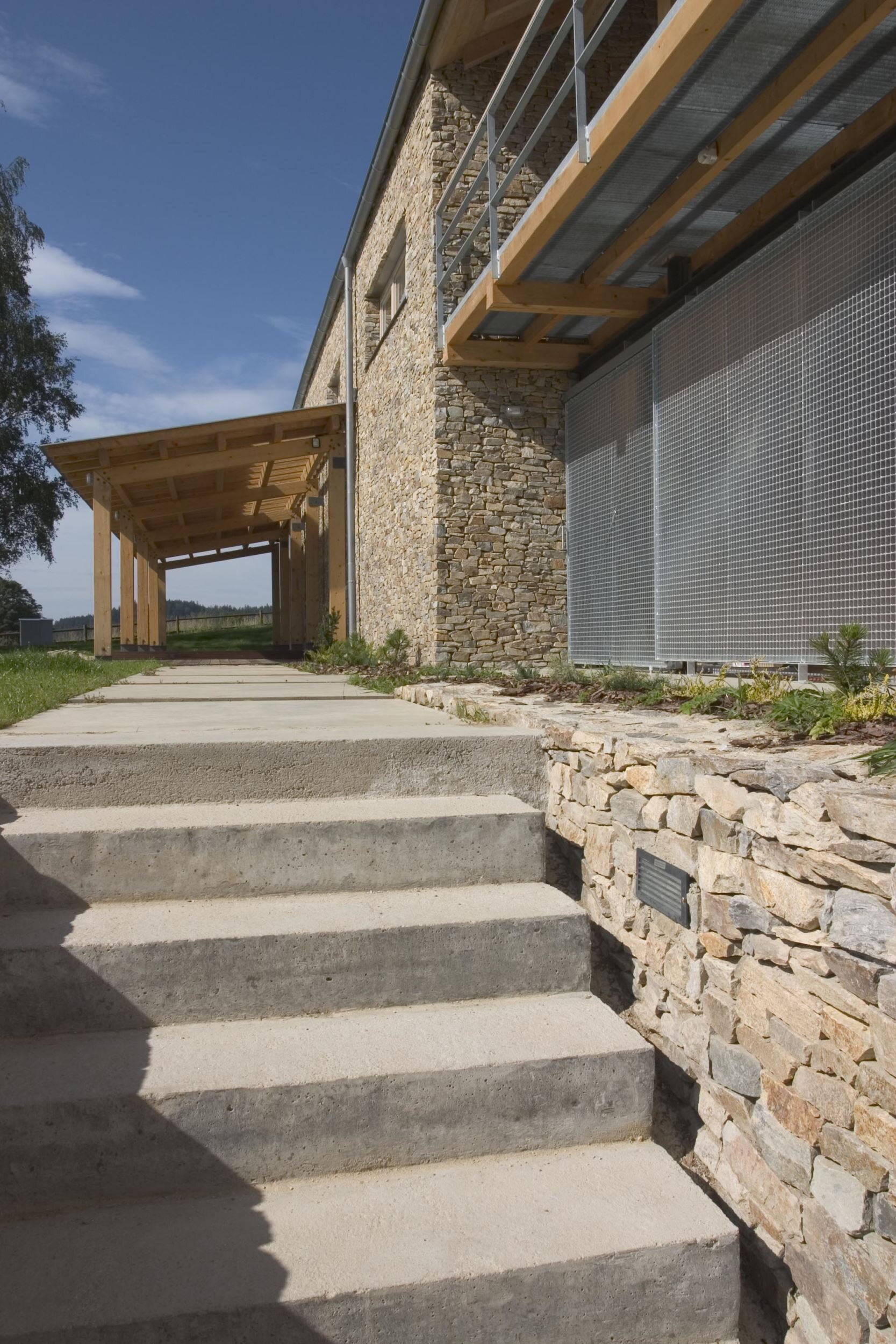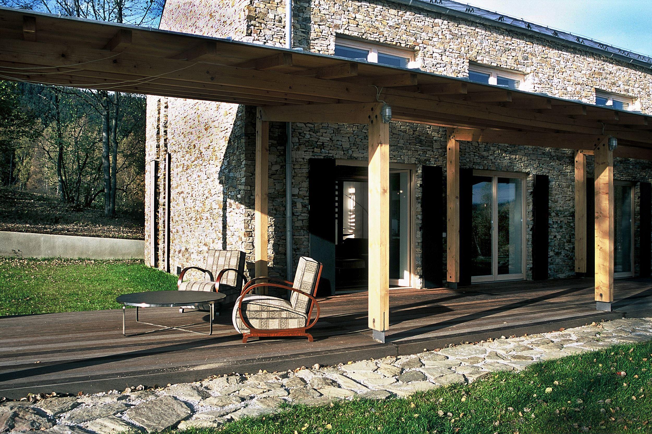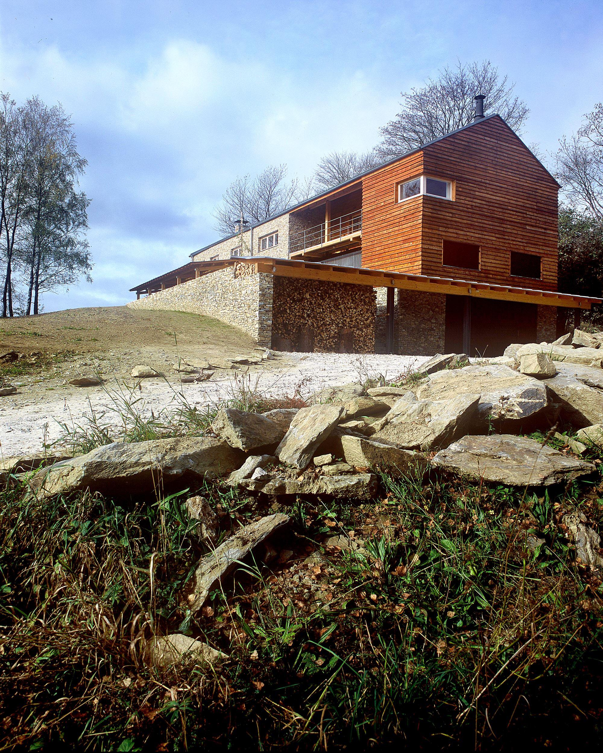 Stavební podstata je založena na pravdivosti materiálů vně i uvnitř domu. Vnější plášť tvoří kámen z místního lomu “Plešivec“ a modřínové fošny kladené na peření, upravené oleji.