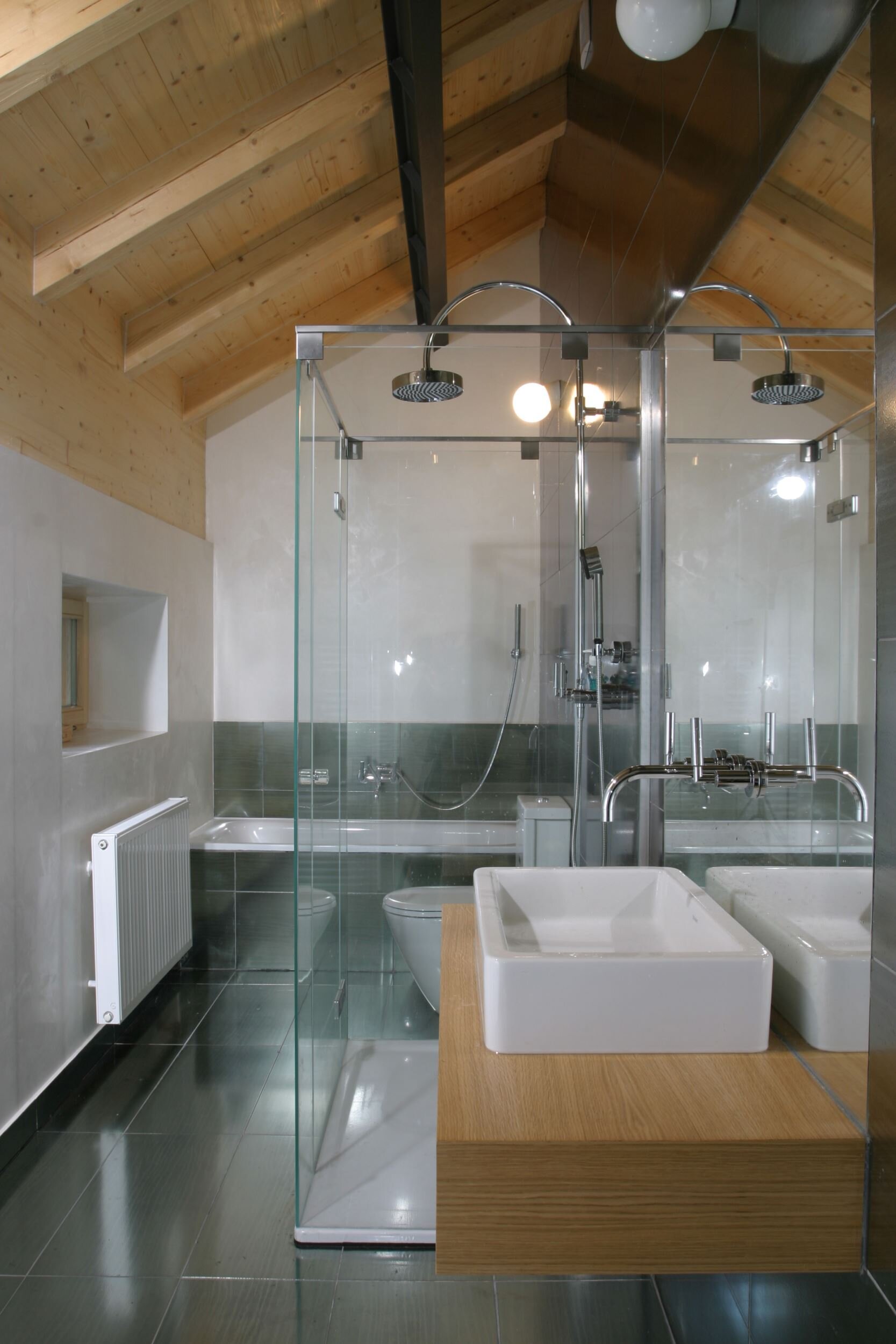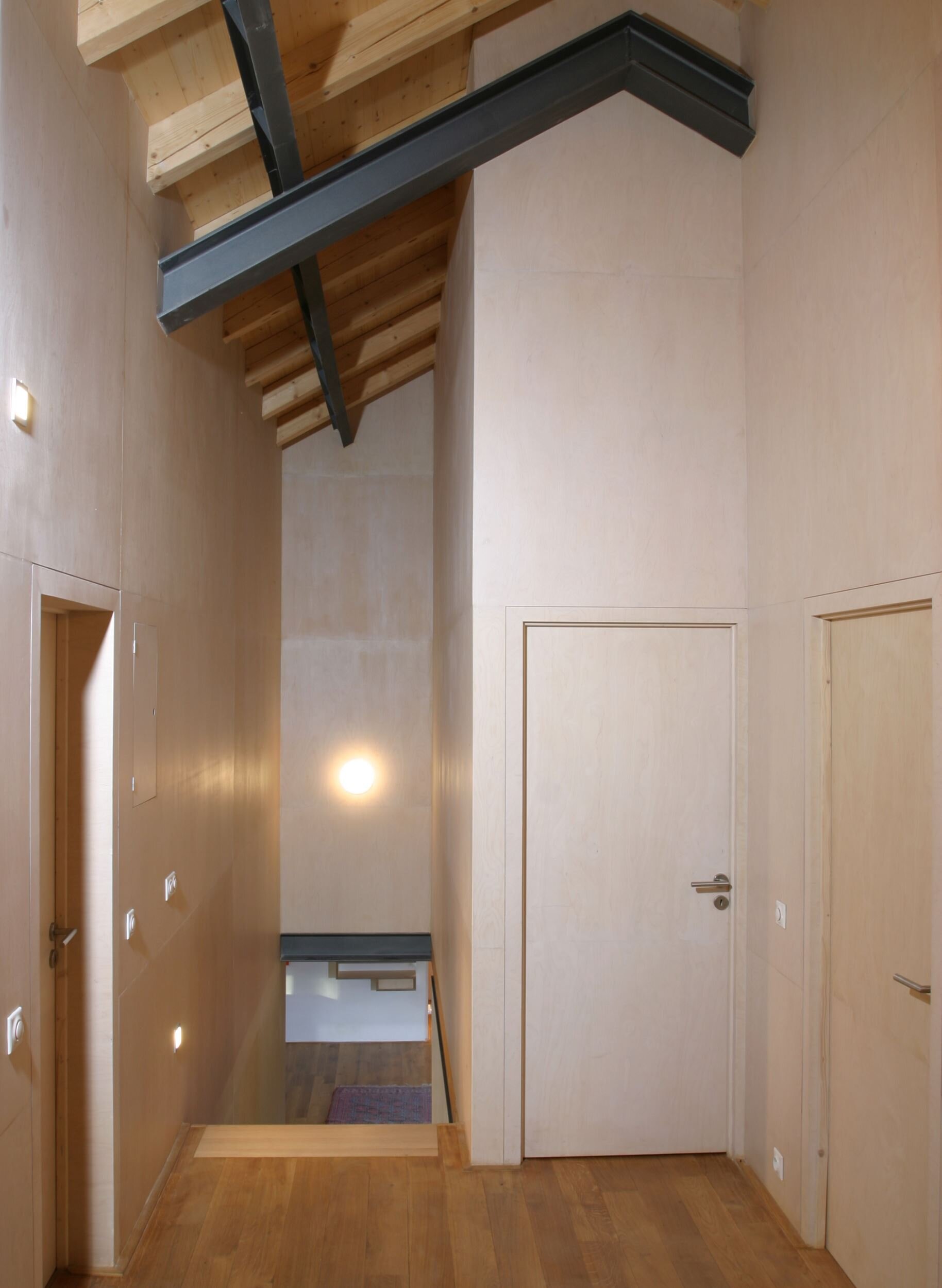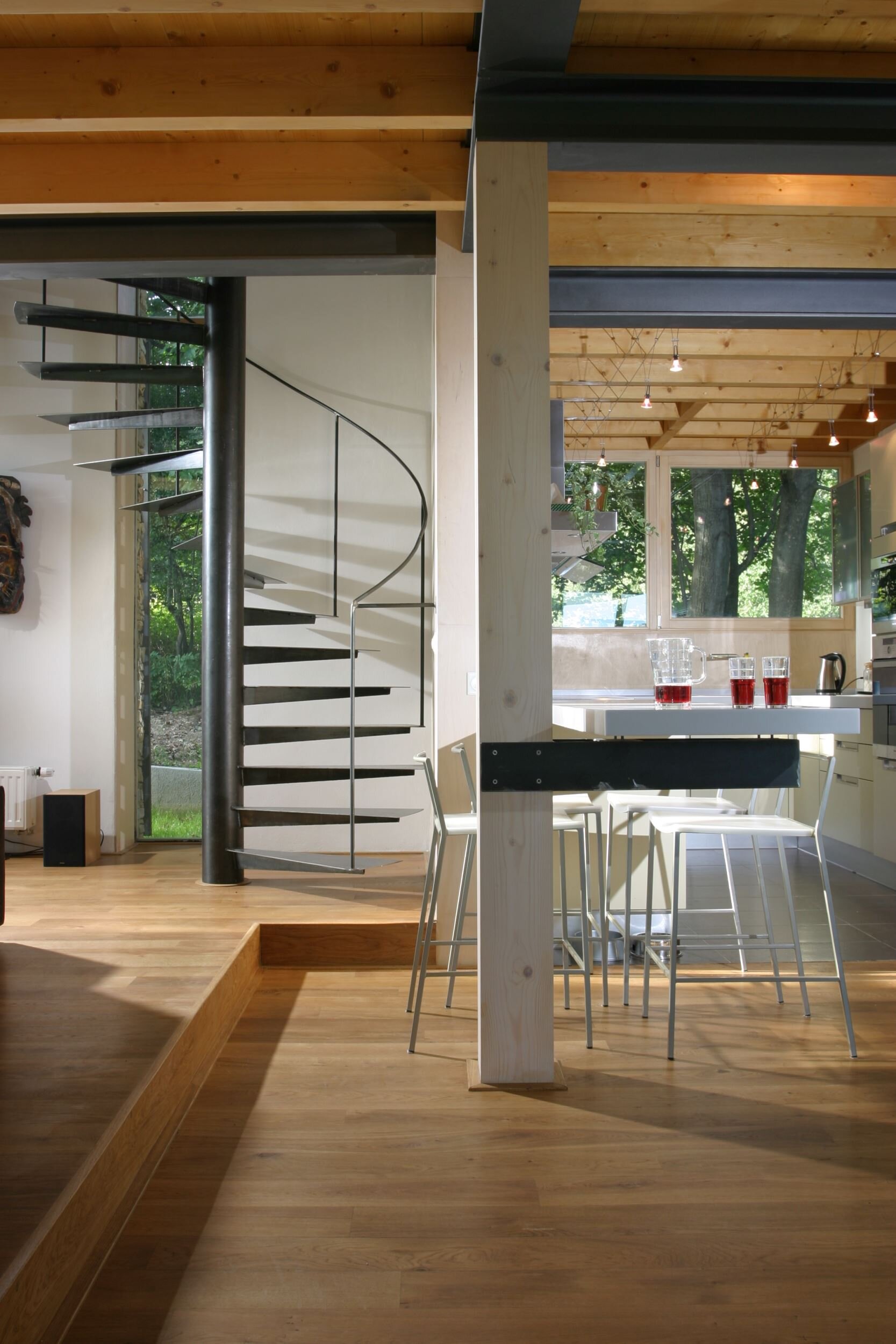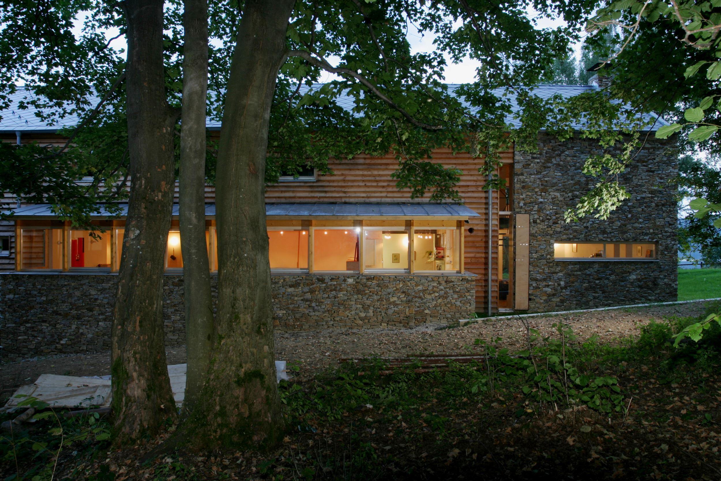 Stavební podstata je založena na pravdivosti materiálů vně i uvnitř domu. Vnější plášť tvoří kámen z místního lomu “Plešivec“ a modřínové fošny kladené na peření, upravené oleji.