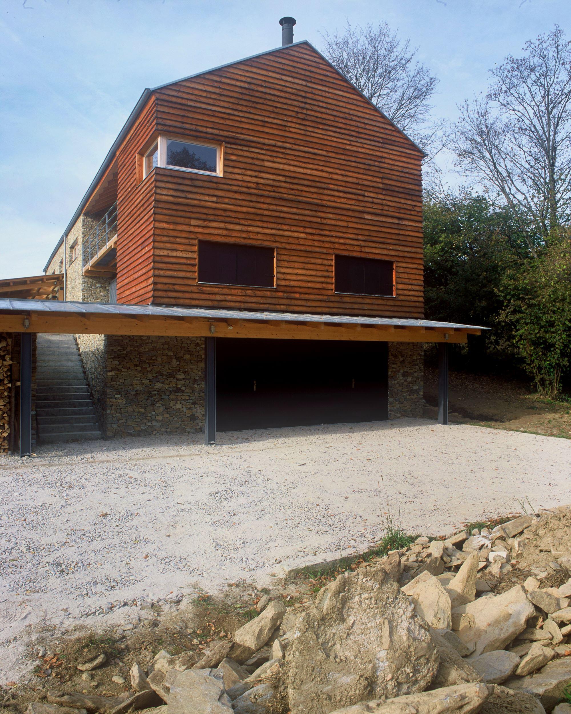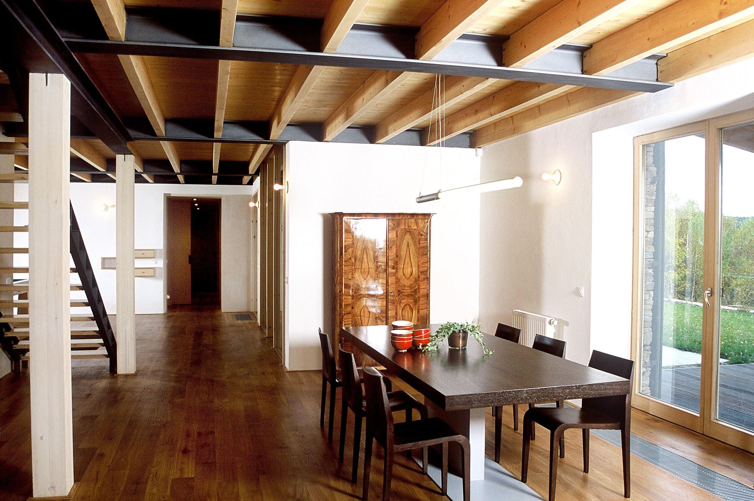Dům je příčně situován na nejvyšším bodě pozemku, takže vždy při příjezdu po mírně stoupající zatočené kamenité cestě je stavba před vámi, natáčí se a přibližuje . Svou dispozicí reaguje na průhledy do krajiny, je příčně transparentní, takže podporuje maximálně vjemy z krásné okolní přírody. Toto byla pro mě definice úkolu: vytvořit dům – sevřený, kompaktní, introvertní, bezpečný, současně využívající energii okolní přírody s průhledy do krajiny, zároveň splnit požadavek na dvě samostatně fungující bytové části. Dalším kritériem byla striktní omezení vydaná památkovou péčí – hlavně na typ a sklonitost střechy.