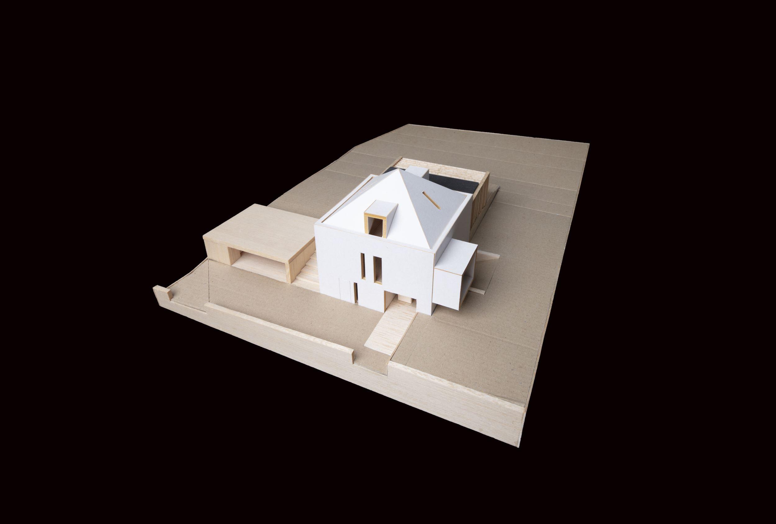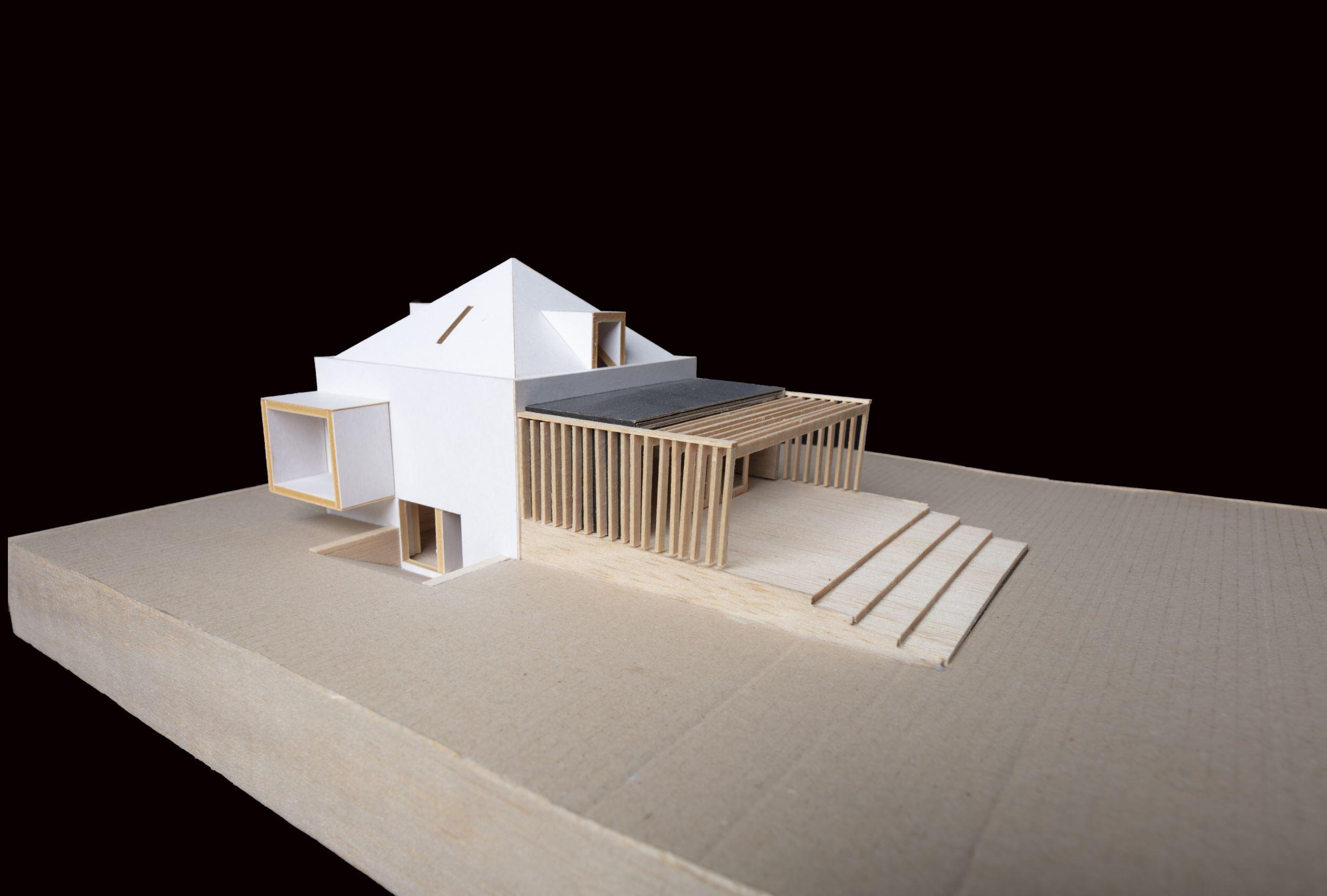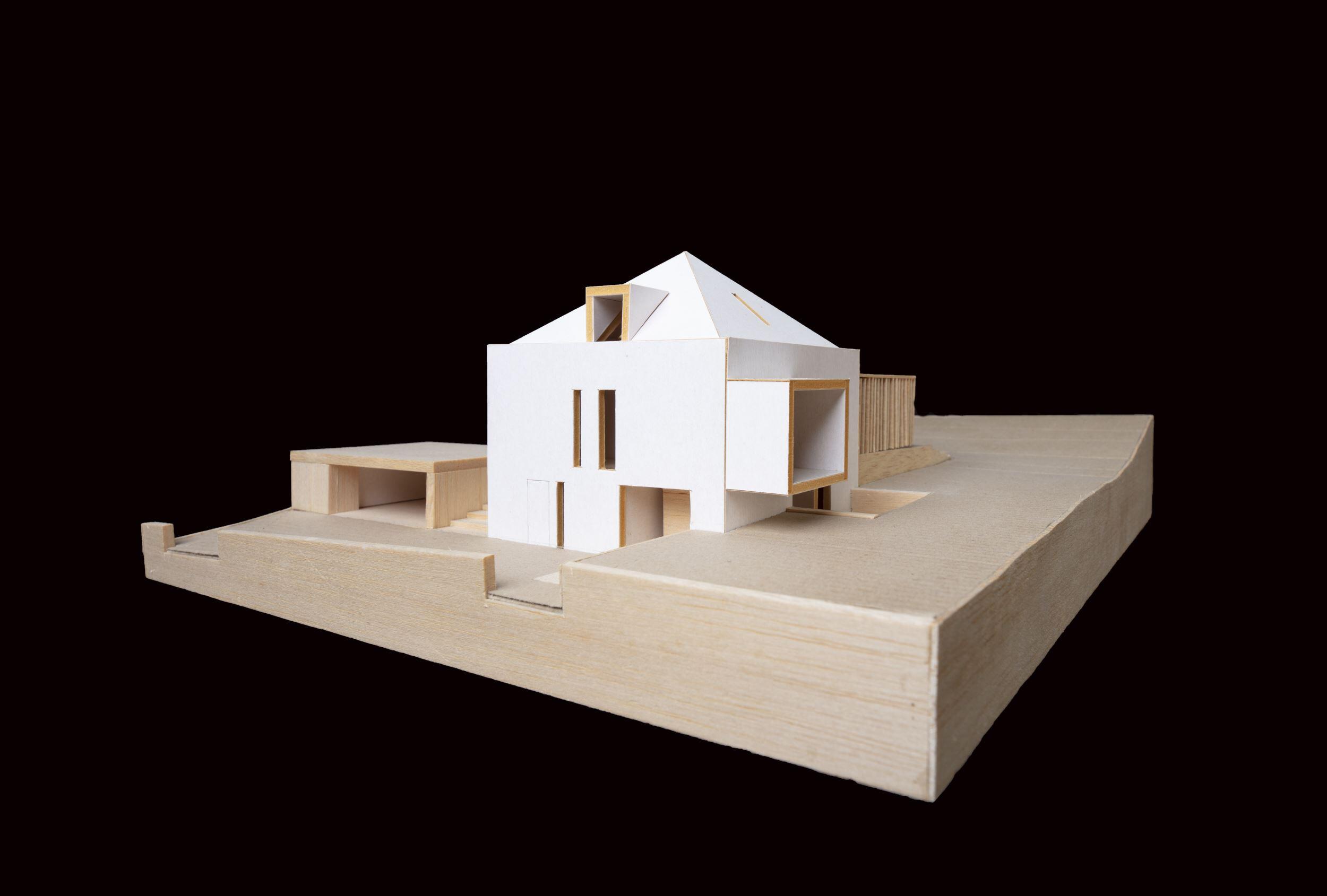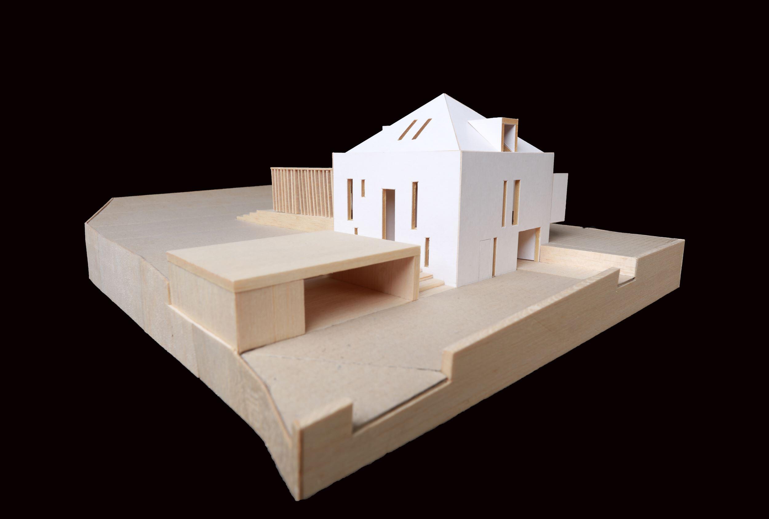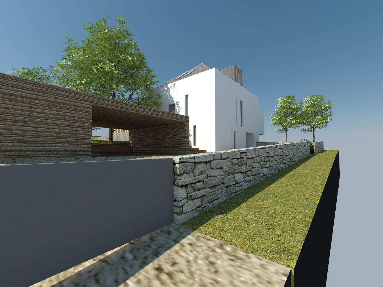 Měli jsme za úkol nevýrazný, šedesát let starý dům, v původním stavu přestavět na bydlení se současnými technickými parametry. Většina takových domů trpí stejnými neduhy, totiž nutností totálního technického přestavění, nutnosti návrhu nových dispozic, vyjadřujícími požadavky na současné potřeby, v tomto případě čtyřčlenné, aktivní rodiny. Znamenalo to podřídit koncepci celého domu individuálním požadavkům. Dům měl kdysi jedno obytné podlaží, bez vazby na zahradu, s nepohodlným přístupem, suterén s garáží a nevyužité podkroví. Přeměnou dispozic jsme využili stávající dům plnohodnotně ve všech podlažích. Do zahrady jsme přistavěli jednopodlažní část obytného prostoru, jako sallu terenu s vystupující betonovou terasou. Suterén jsme prohloubili a zcela využili a střechu jsme vyměnili, ale ponechali ve stanové geometrii a doplnili minimalistickými vikýři se za atikovými žlaby. Zásadně jsme změnili hlavní přístup do domu, který je nyní pohodlný, přímo z terénu do prvního podlaží, kdysi suterénu, nyní navazuje na pochůzí plochy nových garáží po boku stávajícího domu. Dům nabyl zásadní proměny ve vztahu k zahradě, která je nyní integrální součástí prožitku z pobývání v domě. Z domu introvertního je nyní stal dům provázaný s okolním jak pozemkem na přístupu, tak při plochami v kontaktu se zahradou.