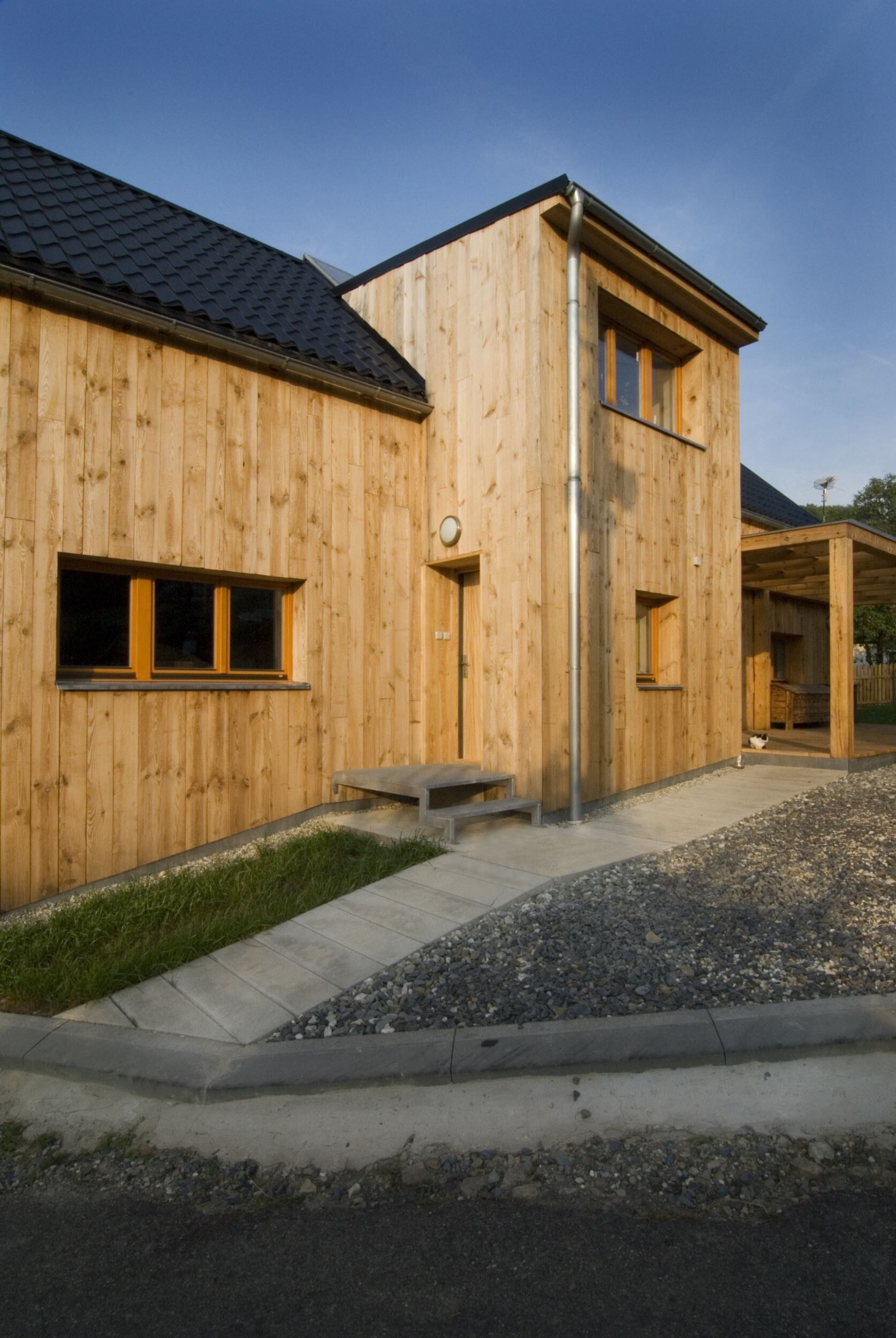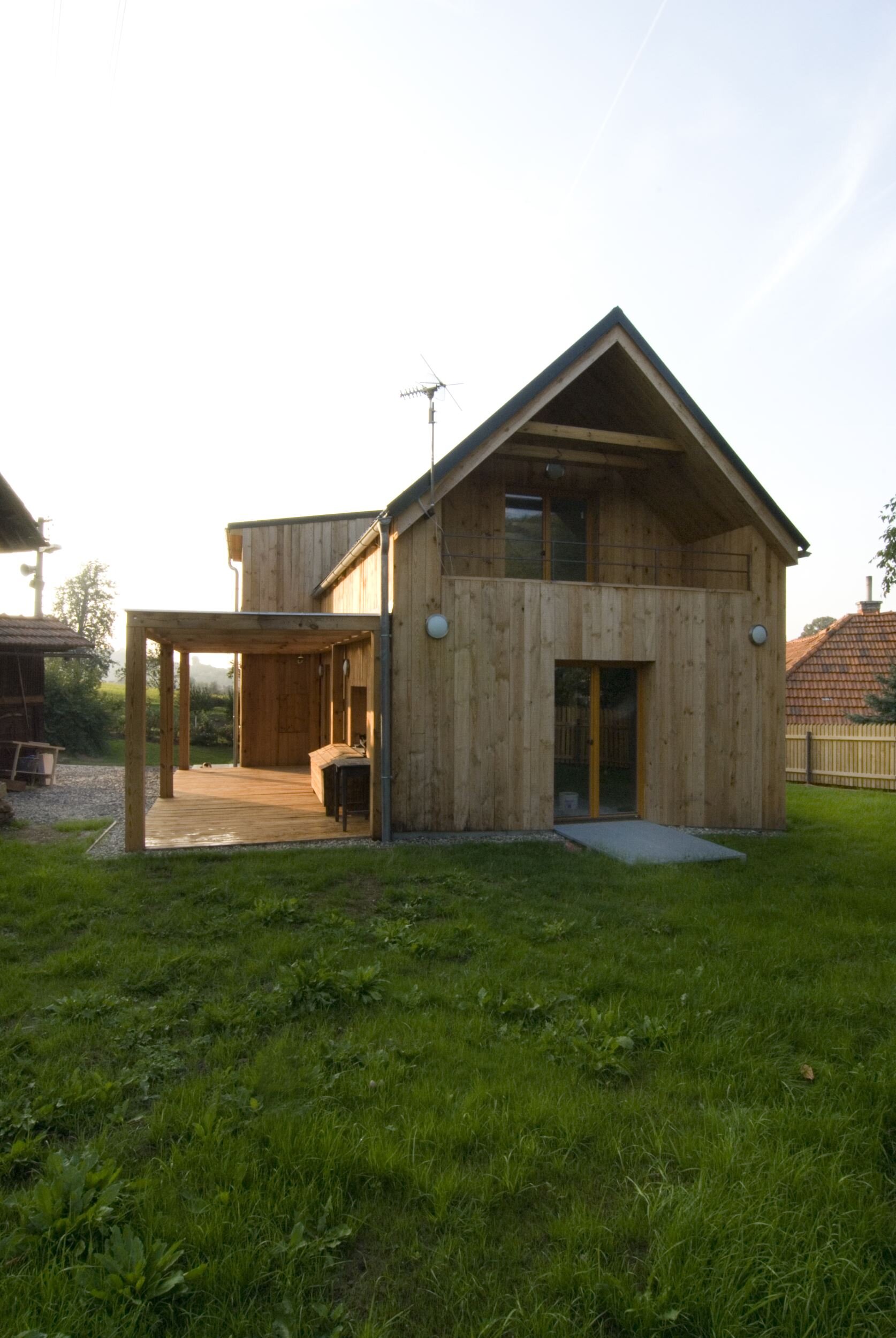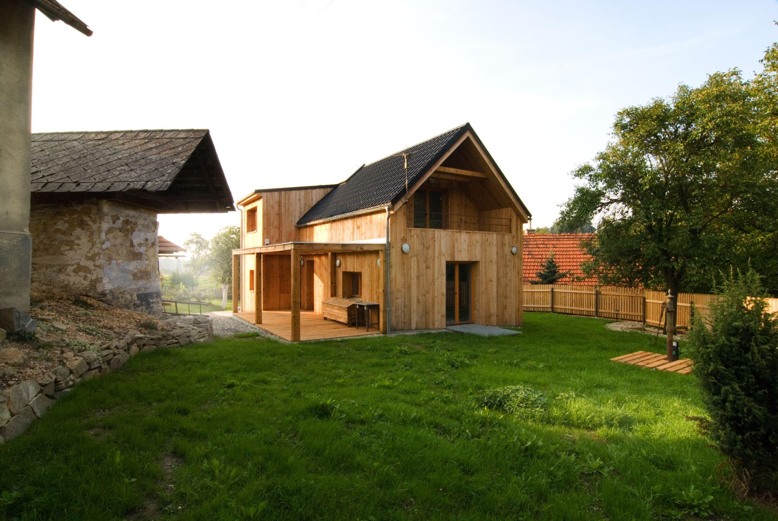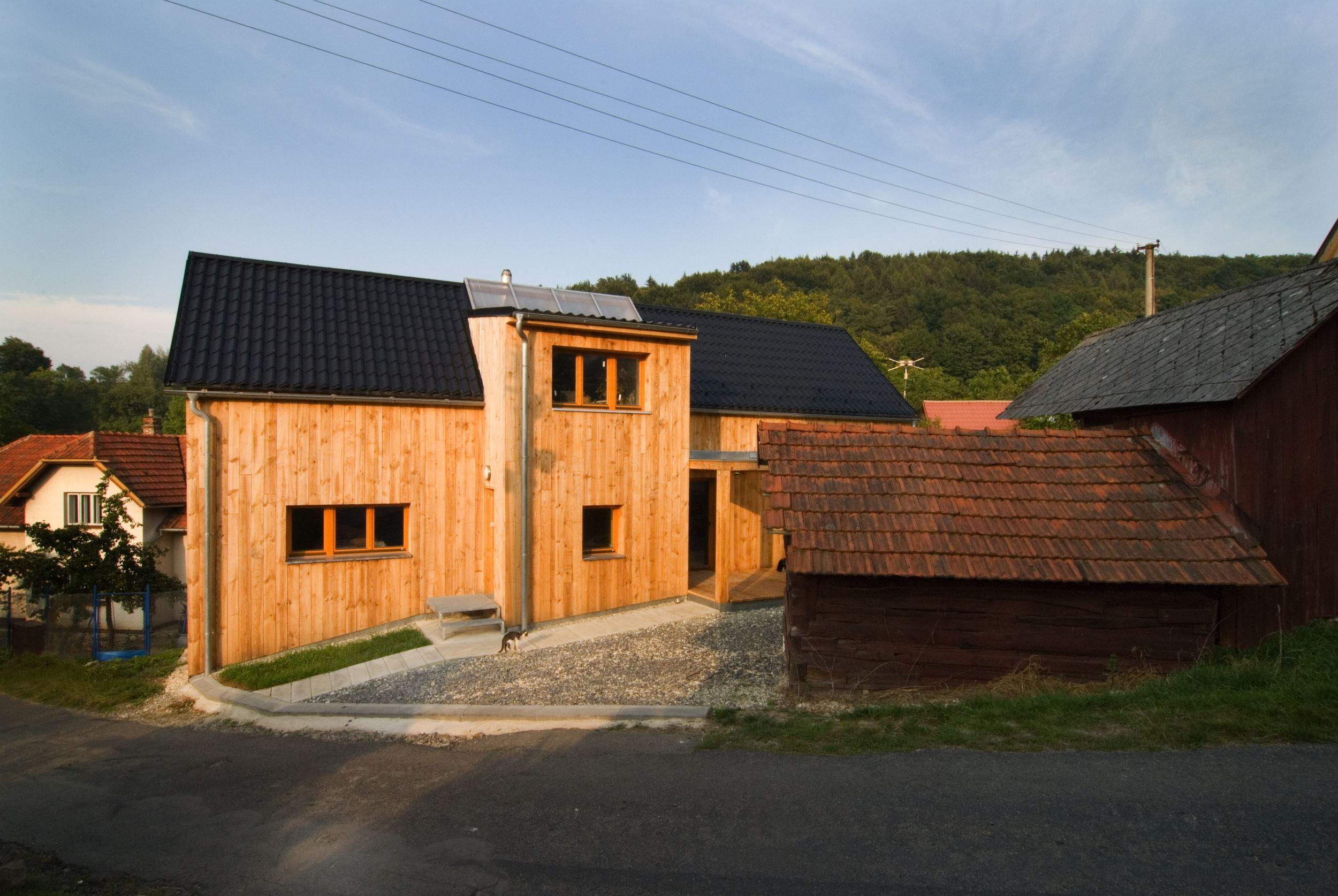 Stísněnost je zde příjemnou vlastností, k poklidnému životu však podmiňující ohleduplností sousedů. Stopu domu zde otiskl starý, dřevěný dům, časem spadl a byl nahrazen novým, vyzdívaným objemem. Naším úkolem bylo pokračovat v okamžiku, kdy to majitelům dál nešlo. Objem, i konstrukce jsme očistili od nánosů zbytečností. Využili jsme jednoduchostí základního objemu i standardního dispozičního uspořádání. K obdélníkové hmotě jsme přidali rámovou zastřešenou terasu a jasně tak definovali orientaci domu ve vtahu k těsnému okolí. Okolní stavbičky sklepa a kůlny jsme ponechali, byť se svou konstrukcí tváří velmi chatrně. Právě tyto zachraňují svébytnost prostoru domu s dvorkem a malou zahradou uvnitř staveb sousedních. Blízké okolí stavby (po plot), jsme dosypali zeminou a štěrkem, nechali tak vyznít samotné objemy staveb. Stavba je opatřena tepelnou izolací; finiš pláště, včetně ostatních venkovních konstrukcí, tvoří nehoblované modřínové fošny, jen upraveny oleji. Okna jsou dřevěná-smrková, střecha Lindab. Výstupy a vstupy do domu jsou přes pororošty.
