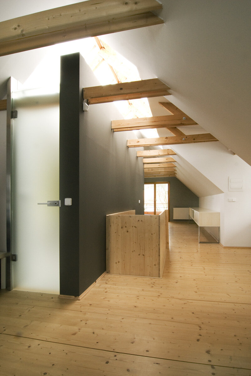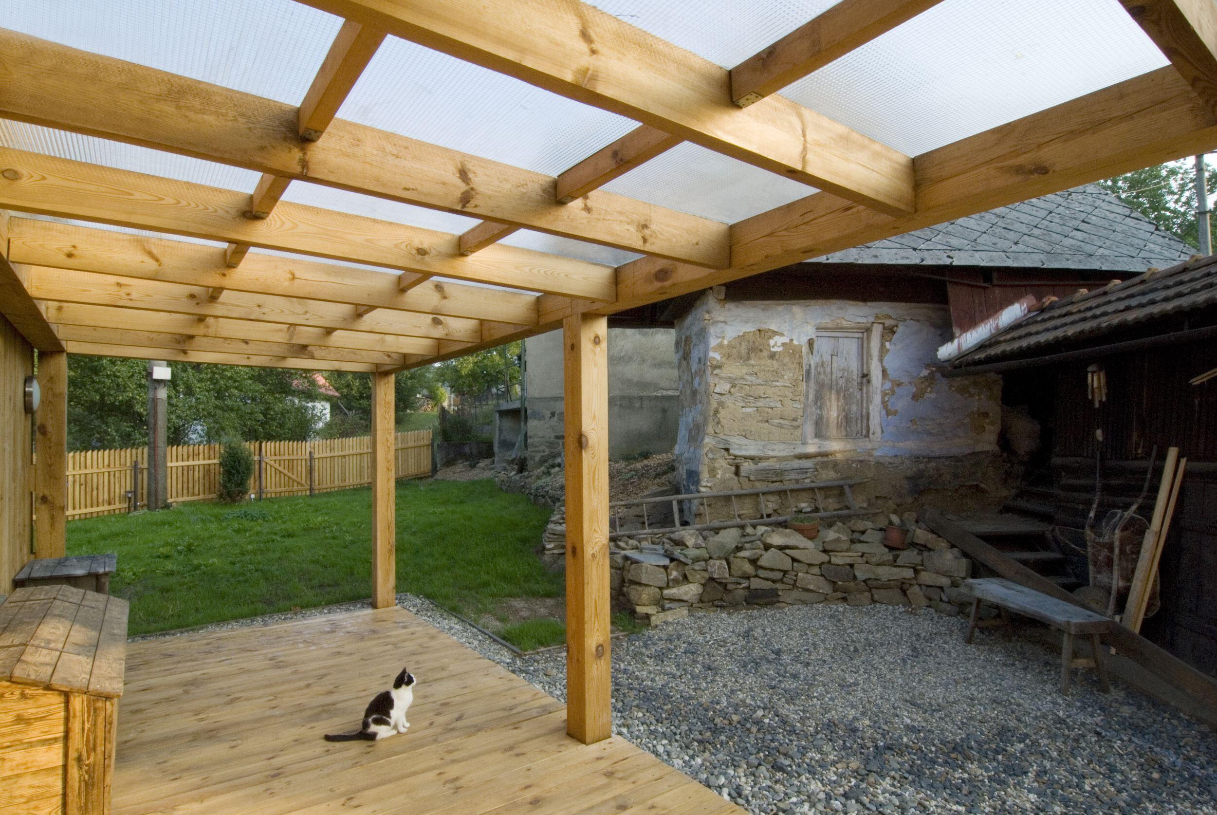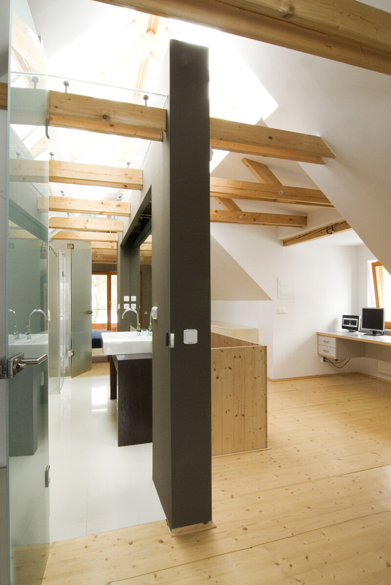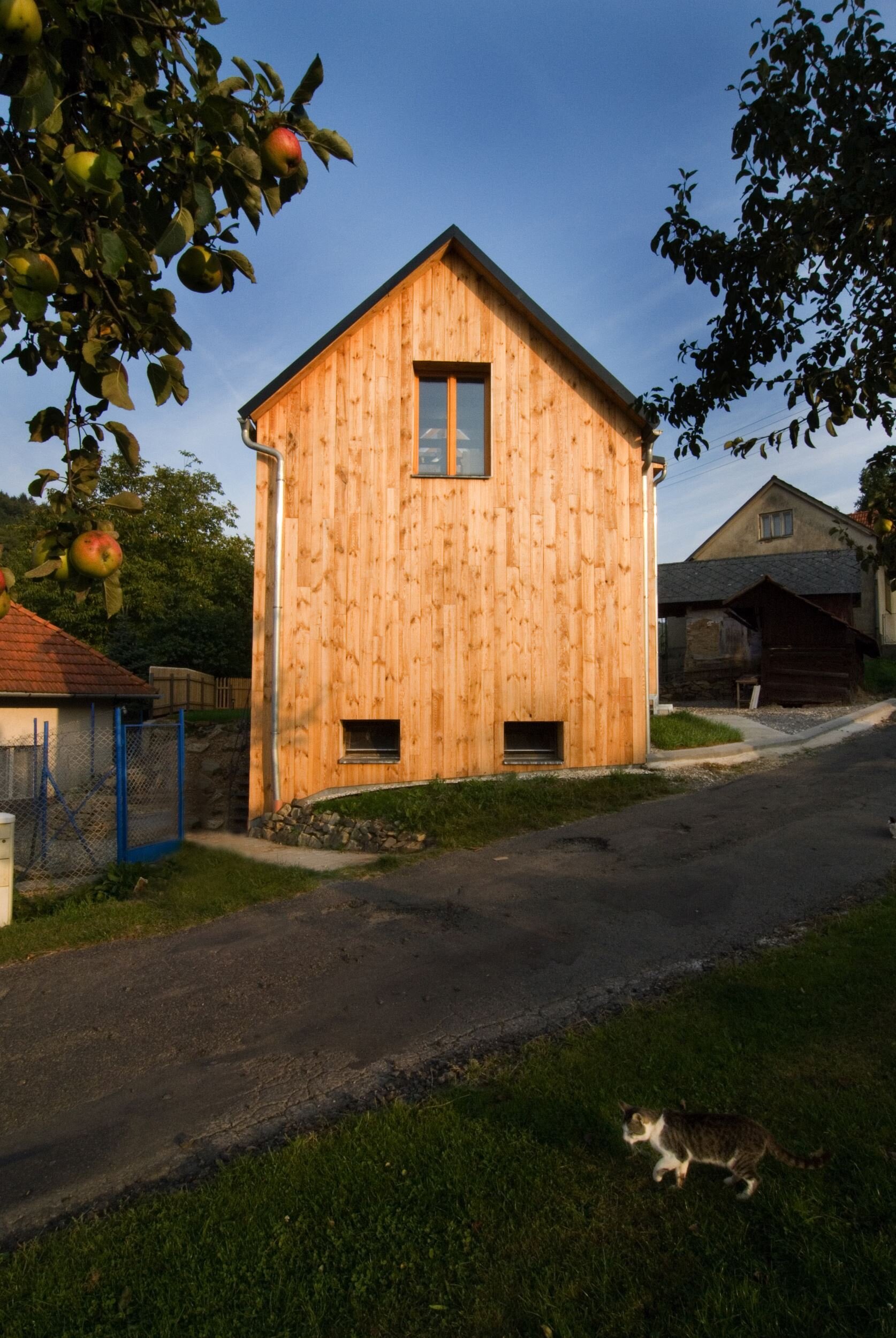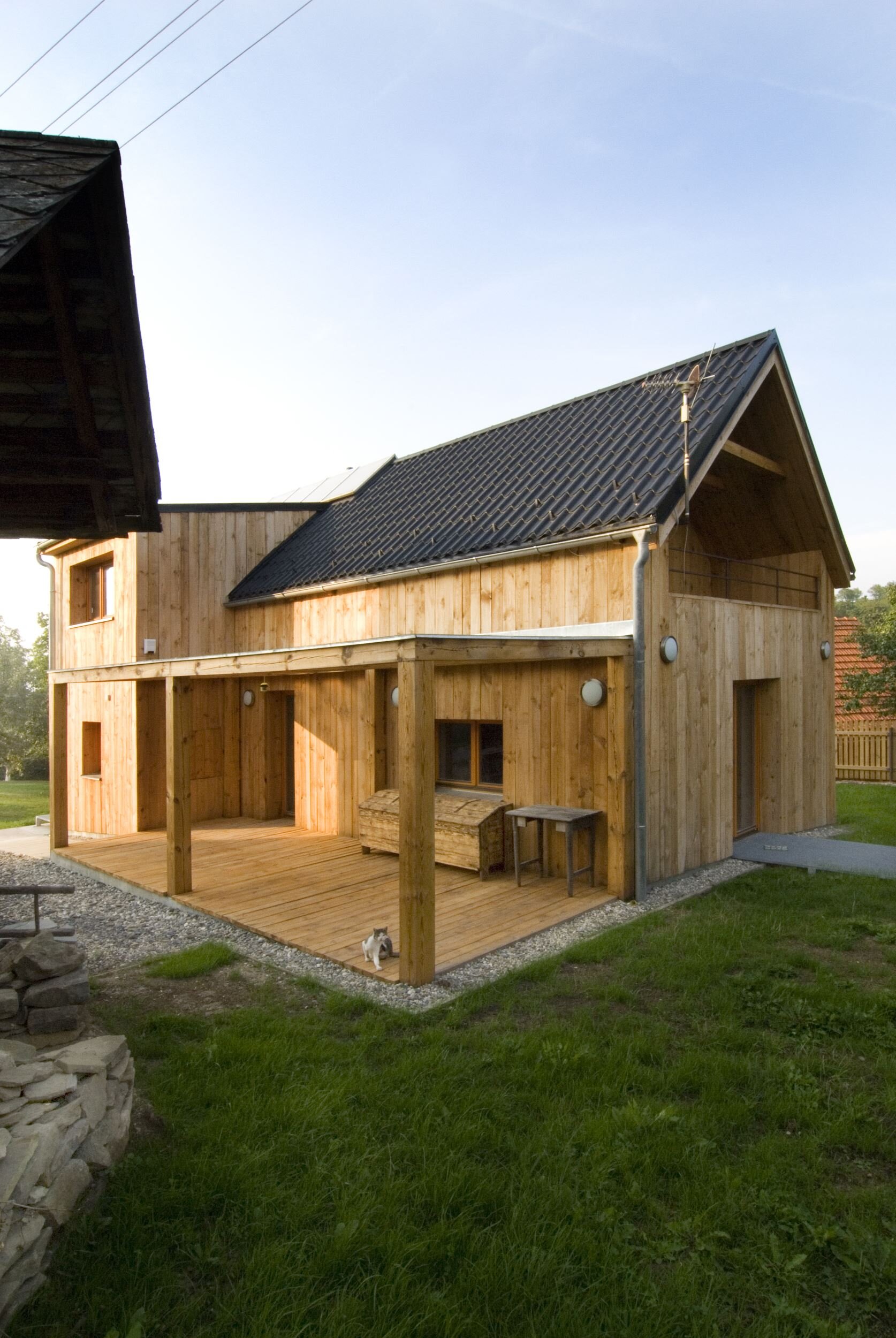 Stísněnost je zde příjemnou vlastností, k poklidnému životu však podmiňující ohleduplností sousedů. Stopu domu zde otiskl starý, dřevěný dům, časem spadl a byl nahrazen novým, vyzdívaným objemem. Naším úkolem bylo pokračovat v okamžiku, kdy to majitelům dál nešlo. Objem, i konstrukce jsme očistili od nánosů zbytečností. Využili jsme jednoduchostí základního objemu i standardního dispozičního uspořádání. K obdélníkové hmotě jsme přidali rámovou zastřešenou terasu a jasně tak definovali orientaci domu ve vtahu k těsnému okolí. Okolní stavbičky sklepa a kůlny jsme ponechali, byť se svou konstrukcí tváří velmi chatrně. Právě tyto zachraňují svébytnost prostoru domu s dvorkem a malou zahradou uvnitř staveb sousedních. Blízké okolí stavby (po plot), jsme dosypali zeminou a štěrkem, nechali tak vyznít samotné objemy staveb. Stavba je opatřena tepelnou izolací; finiš pláště, včetně ostatních venkovních konstrukcí, tvoří nehoblované modřínové fošny, jen upraveny oleji. Okna jsou dřevěná-smrková, střecha Lindab. Výstupy a vstupy do domu jsou přes pororošty.