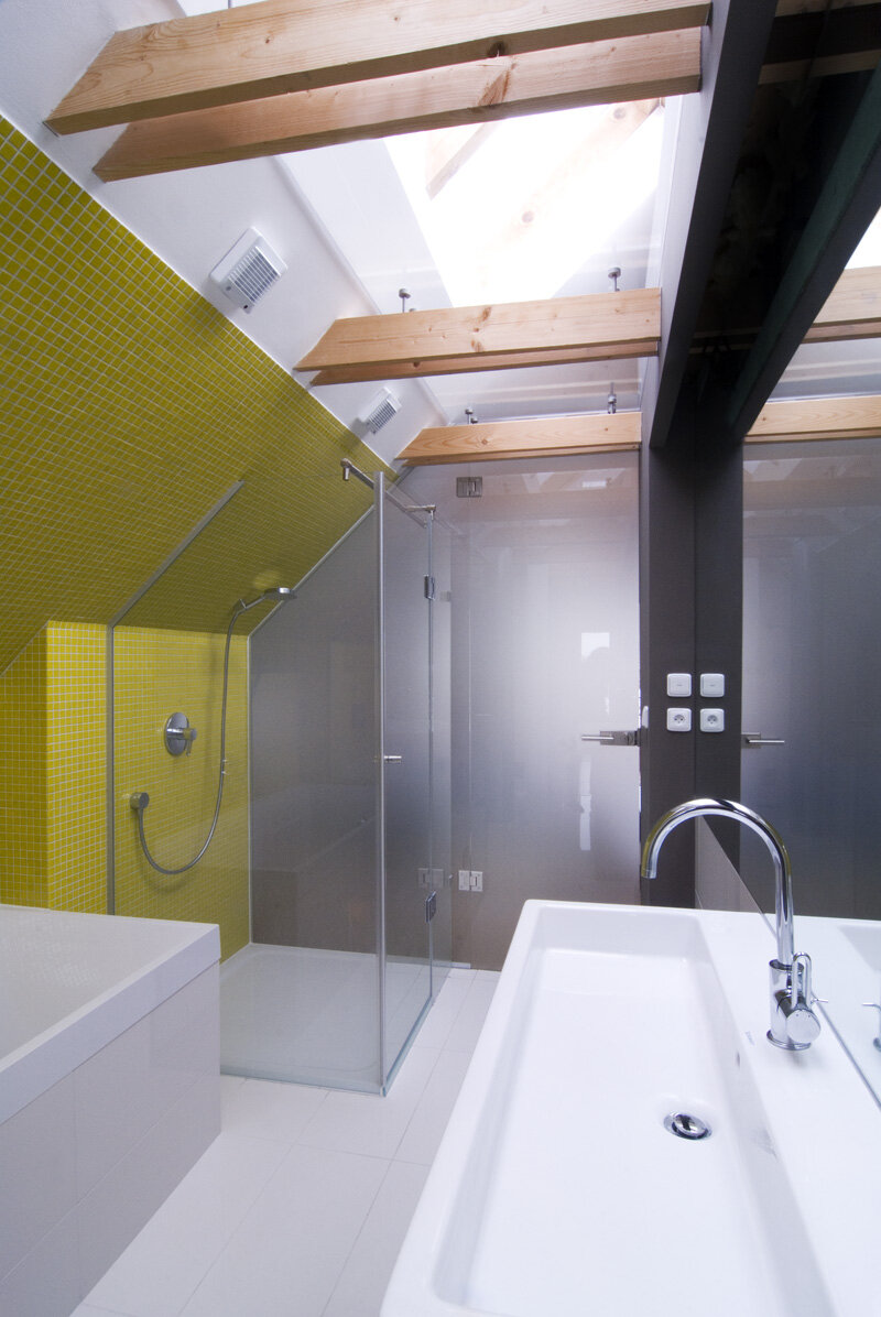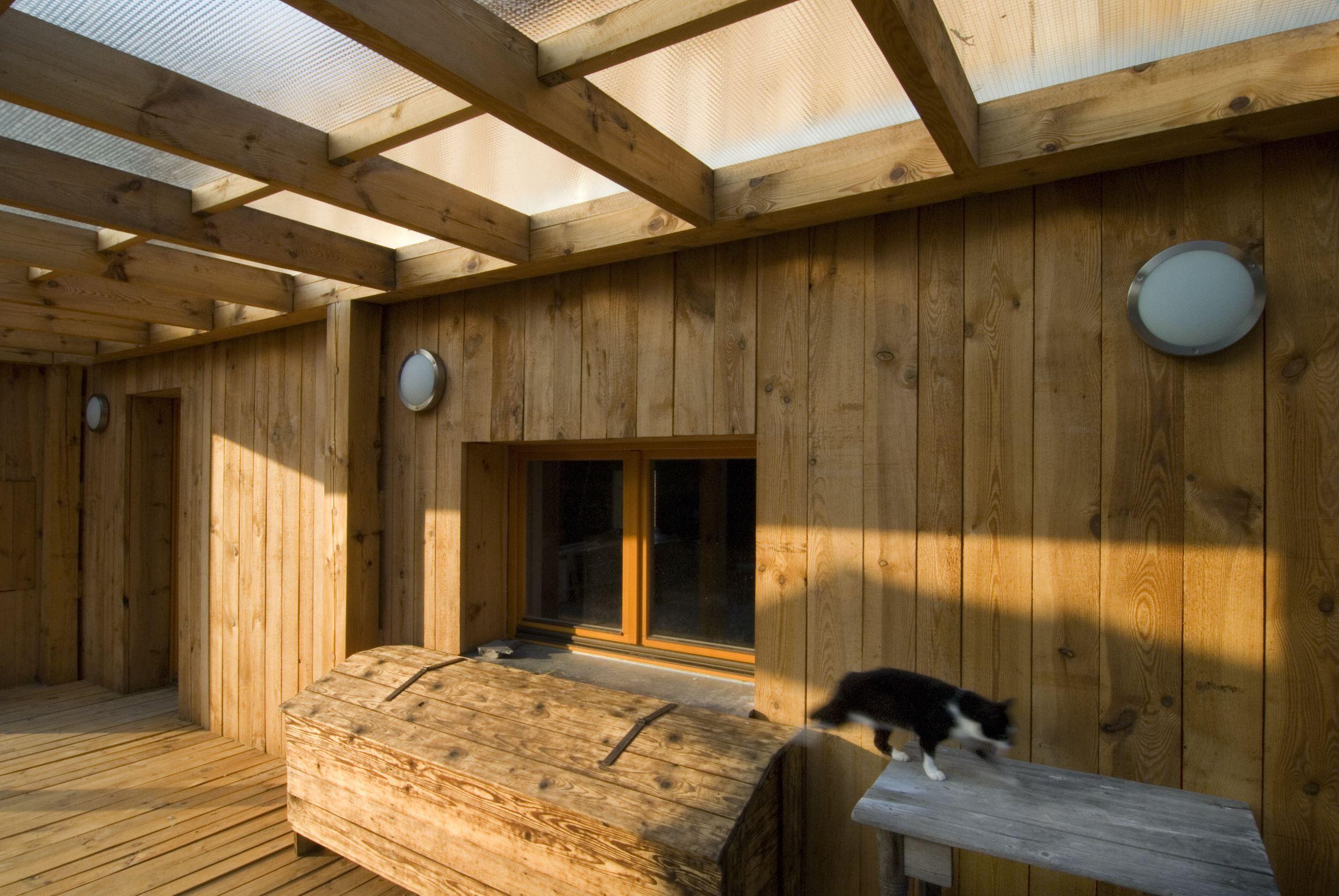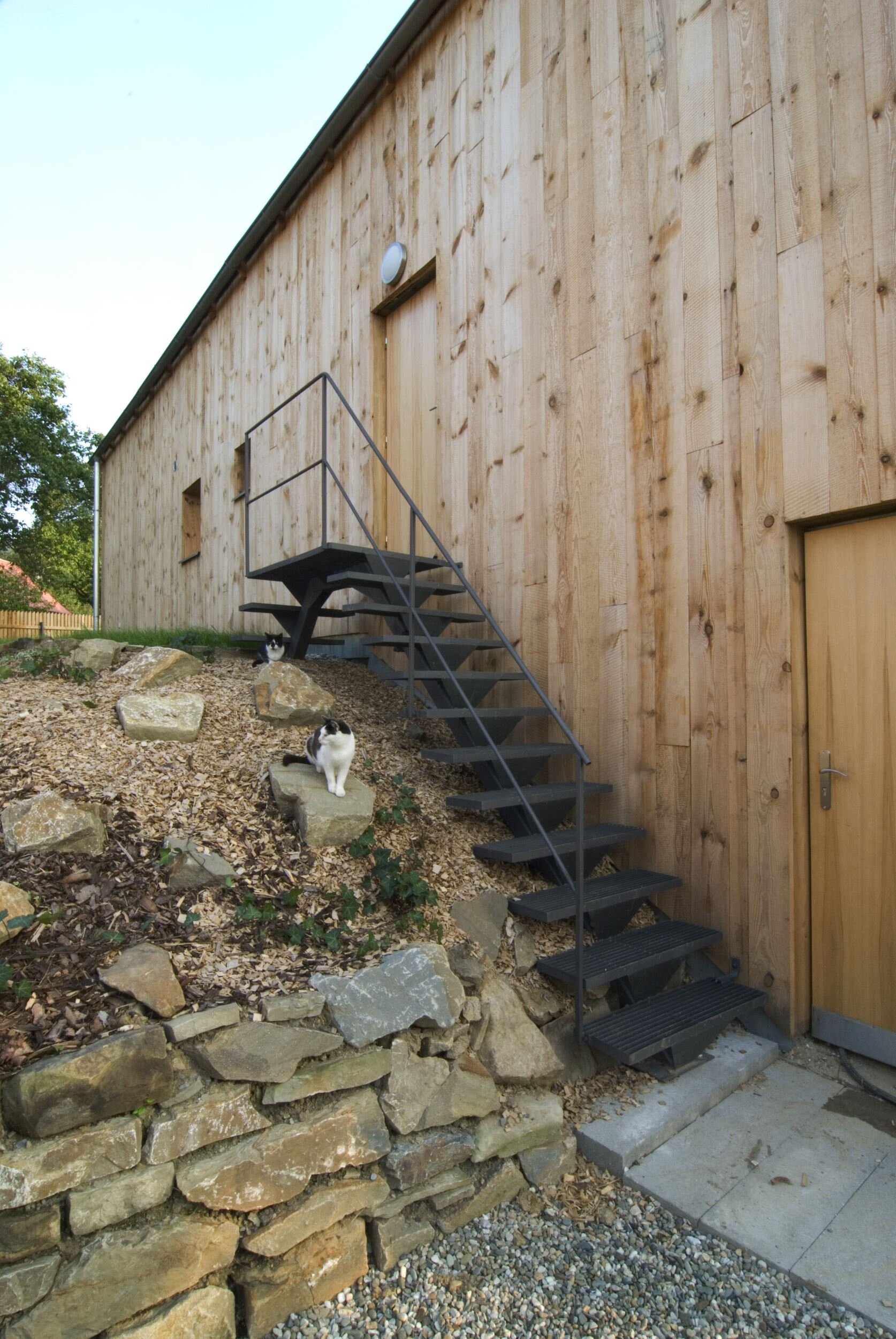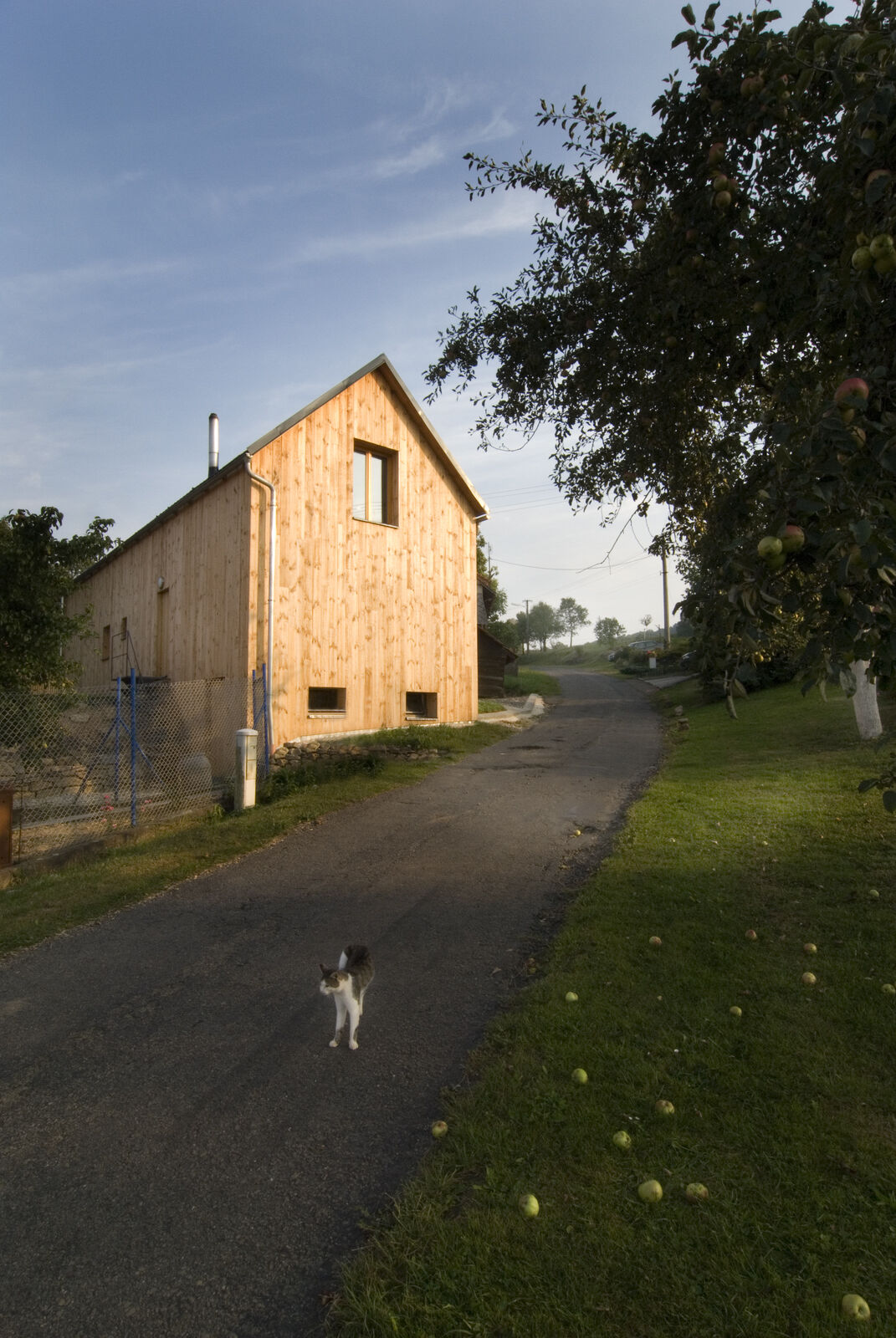 Stísněnost je zde příjemnou vlastností, k poklidnému životu však podmiňující ohleduplností sousedů. Stopu domu zde otiskl starý, dřevěný dům, časem spadl a byl nahrazen novým, vyzdívaným objemem. Naším úkolem bylo pokračovat v okamžiku, kdy to majitelům dál nešlo. Objem, i konstrukce jsme očistili od nánosů zbytečností. Využili jsme jednoduchostí základního objemu i standardního dispozičního uspořádání. K obdélníkové hmotě jsme přidali rámovou zastřešenou terasu a jasně tak definovali orientaci domu ve vtahu k těsnému okolí. Okolní stavbičky sklepa a kůlny jsme ponechali, byť se svou konstrukcí tváří velmi chatrně. Právě tyto zachraňují svébytnost prostoru domu s dvorkem a malou zahradou uvnitř staveb sousedních. Blízké okolí stavby (po plot), jsme dosypali zeminou a štěrkem, nechali tak vyznít samotné objemy staveb. Stavba je opatřena tepelnou izolací; finiš pláště, včetně ostatních venkovních konstrukcí, tvoří nehoblované modřínové fošny, jen upraveny oleji. Okna jsou dřevěná-smrková, střecha Lindab. Výstupy a vstupy do domu jsou přes pororošty.