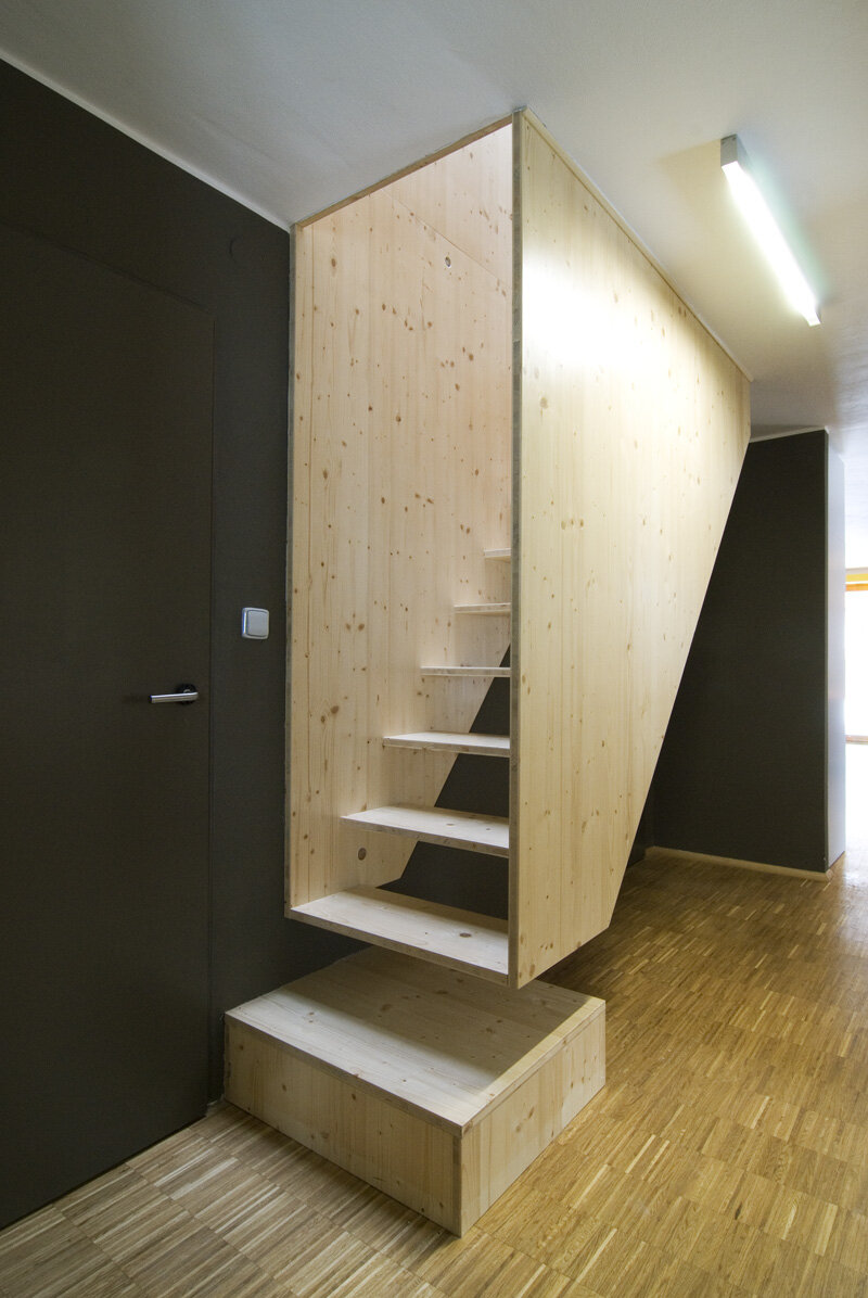 Uvnitř domu je zachována lapidárnost uspořádání se schodištěm ve středu dispozice. Schodiště je zavěšeným boxem, z půdního prostoru prosvětleným střešním, stávajícím světlíkem. Obytný prostor s kuchyní a integrovanou jídelnou je orientován čelním výstupem do zahrádky, bočním na zápraží - terasu. Půda je zatím řešena svobodně, s možností přepažení stěnami. Zásadní je zde umístění koupelny s toaletou ve středu dispozice, s horním prosvětlením ve střeše. Světlo prozařuje jinak temnou část půdy. V prostoru je vymezeno střední schodišťovou zdí, krovem a prosklenými čely. Ložnice má krytou terásku. Zdálo by se, že interiér nenásleduje linii poklidnosti vnějšího výrazu stavby, je však ovlivněn přáním investora po barevnosti. Jsou zde použity standardní materiály, podlaha v prvním podlaží je dubová mozaika, na půdě jsou smrkové palubky, stěny omítané, s nátěry, obklady v koupelně-skleněná mozaika.